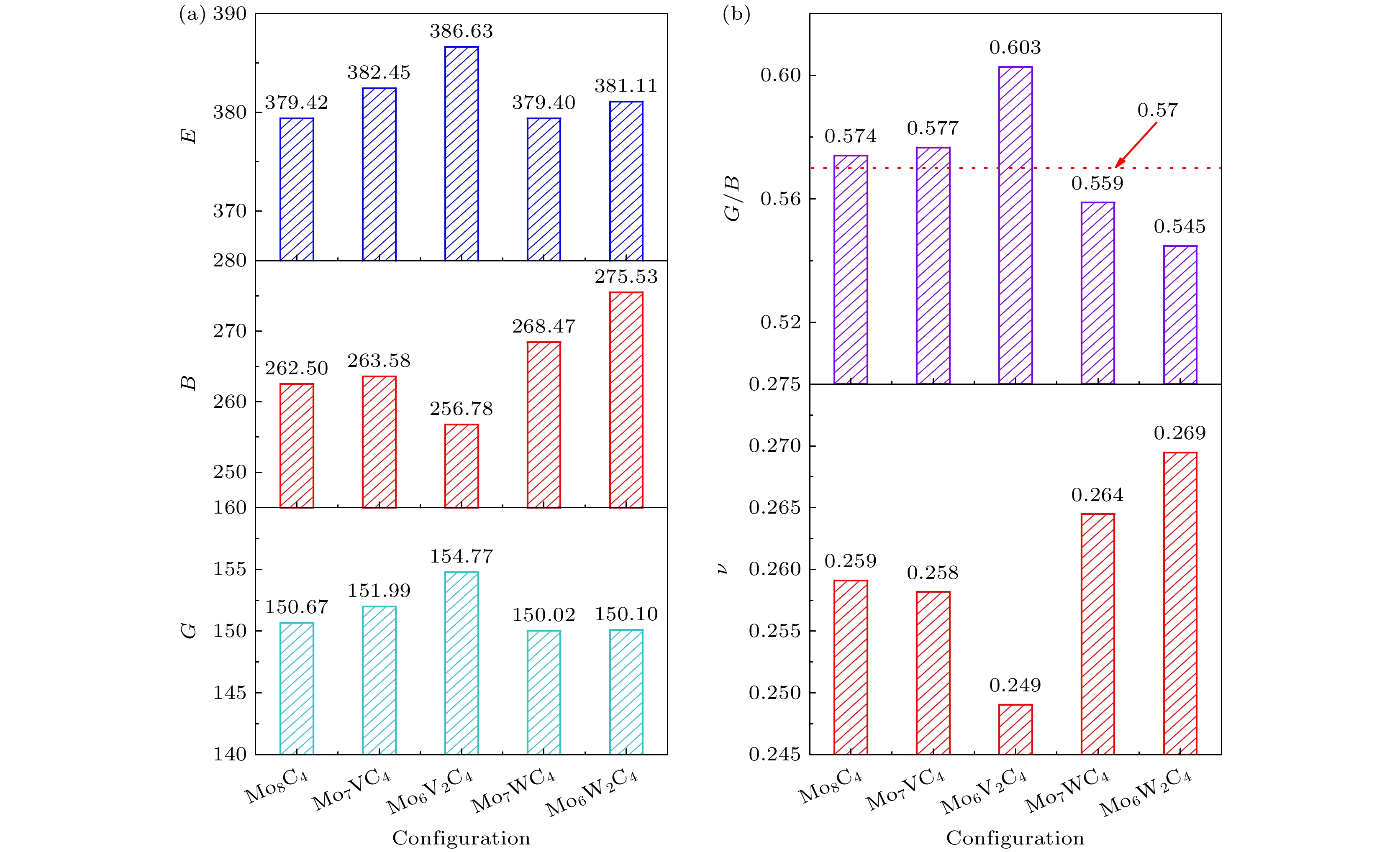 Configuration C11/GPa C12/GPa C13/GPa C33/GPa C44/GPa C66/GPa Mo8C4 475.26 119.88 180.55 451.77 137.69 178.17 Mo7VC4 481.10 117.69 177.65 466.54 134.82 178.91 Mo6V2C4 473.96 119.00 166.23 461.58 141.35 176.42 Mo7WC4 478.11 125.91 187.67 459.93 137.32 177.95 Mo6W2C4 483.65 131.41 196.03 468.71 137.92 178.09 表 4 不同构型的维氏硬度HV, Hardness (Tian)和硬度H