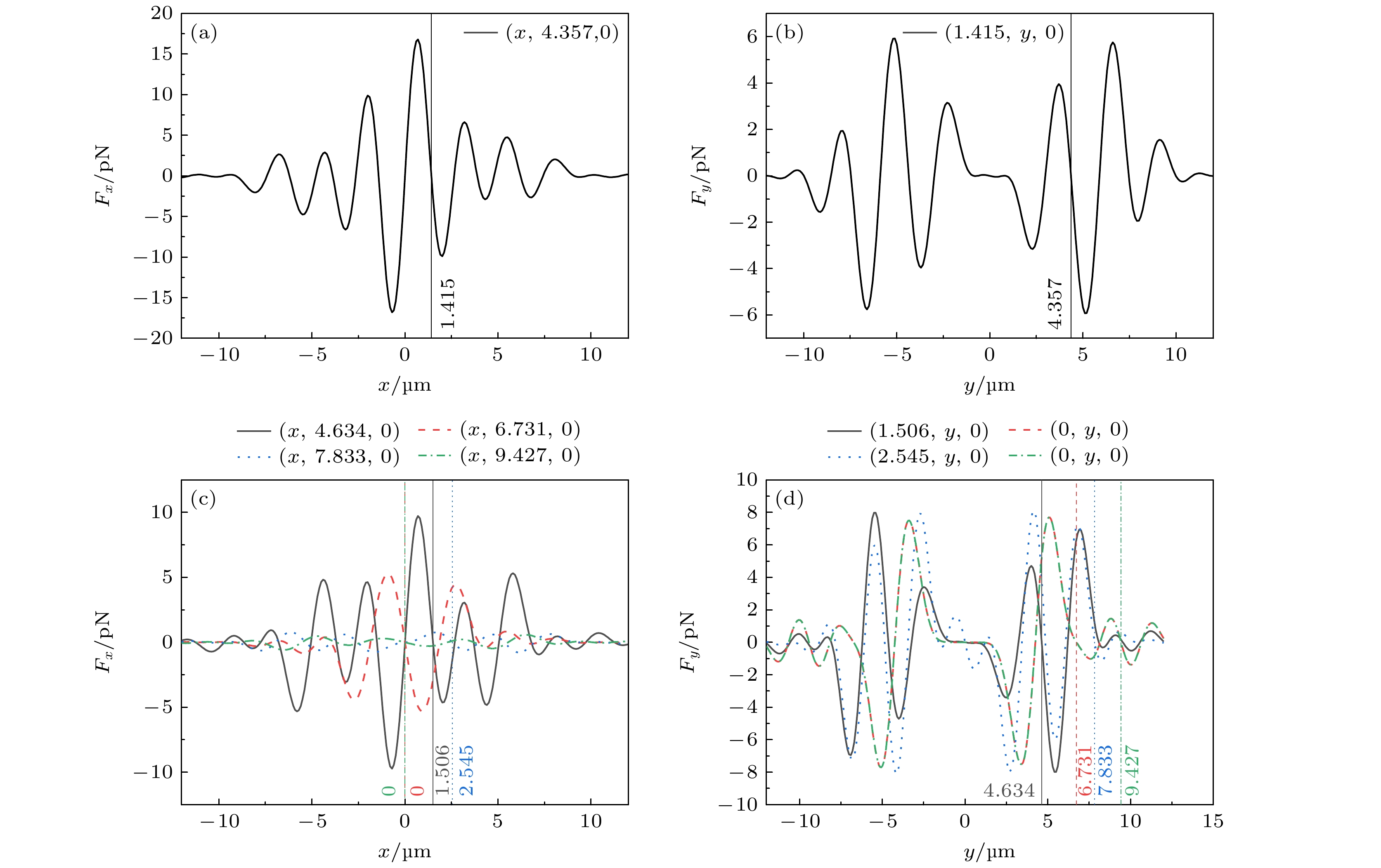 图 9 微粒在光强极小值位置处受到的光辐射力随x轴或y轴的变化图 (a), (b) R1 = 600 μm, R2 = 800 μm; (c), (d) R1 = 500 μm, R2 = 800 μm, 其余参数与图8相同
