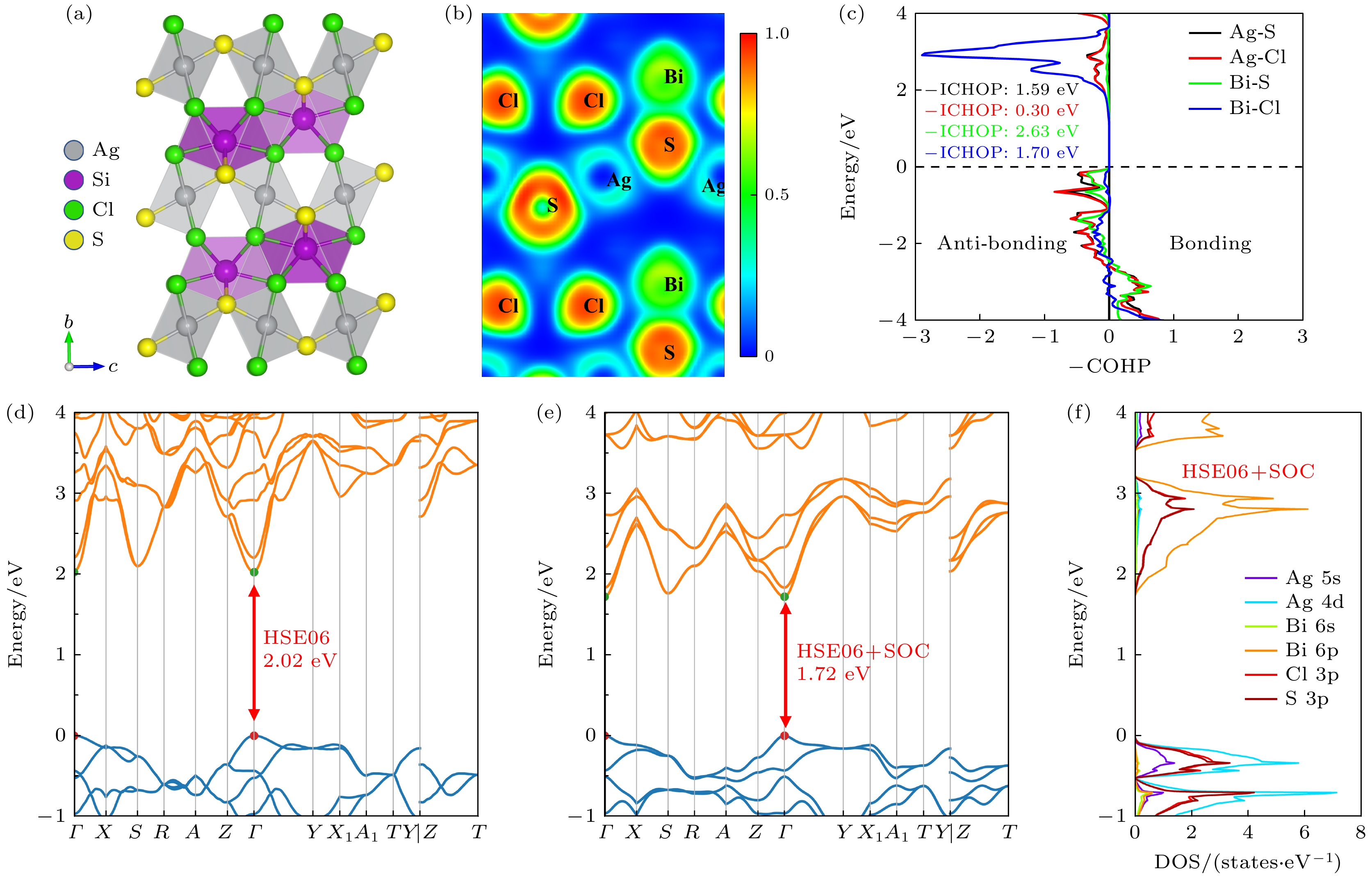 图 1 (a) AgBiSCl2的晶体结构; (b)电子局域函数; (c)最近邻原子对的COHP分析; (d)能带结构(考虑HSE06); (e)能带结构(考虑HSE06+SOC); (f)态密度
