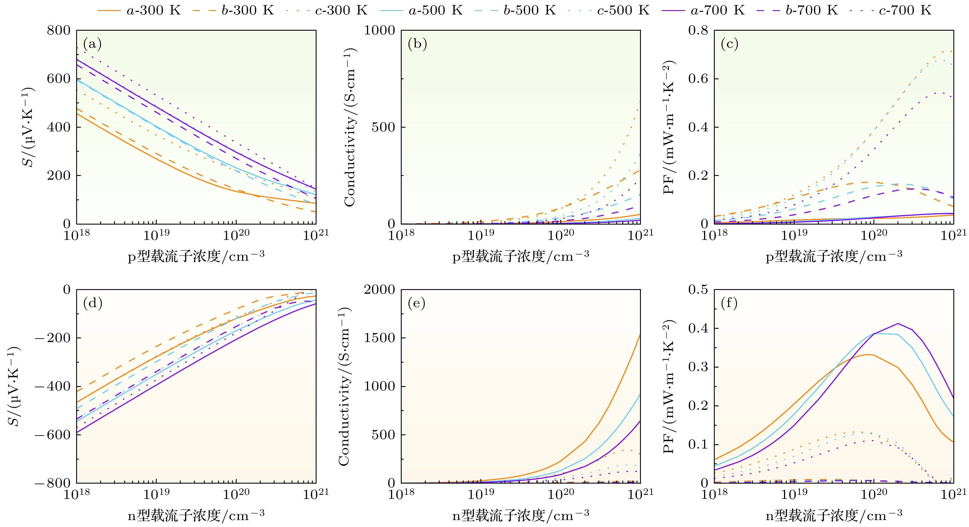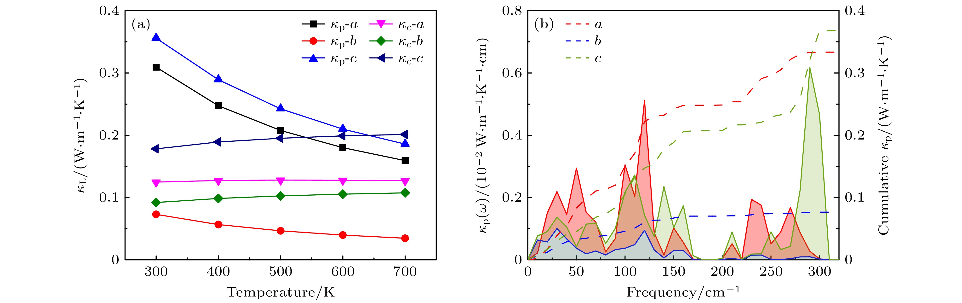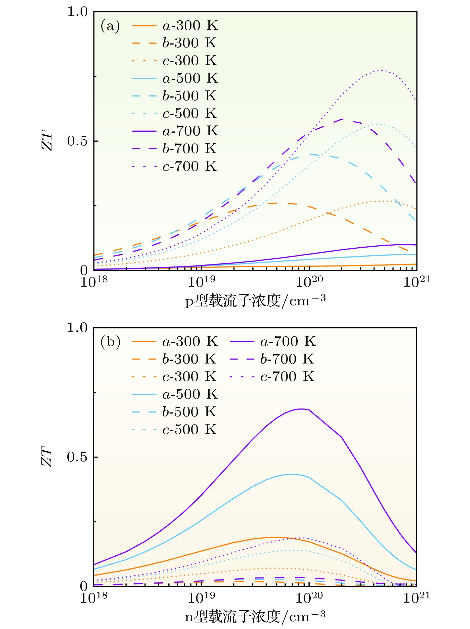 混合阴离子硫卤化物凭借其独特的晶格动力学和可调电子结构, 在热电与光电材料领域备受关注. 本文基于密度泛函理论的第一性原理计算, 结合玻尔兹曼输运方程、声子重整化模型, 研究了AgBiSCl2的光电、热电性能. 结果表明, AgBiSCl2为直接带隙半导体且带隙为1.72 eV, 紫外区光吸收系数达到1 × 106 cm–1, 3 μm厚度下光谱极限最大效率为28.06%. AgBiSCl2中Ag原子离域引起的rattling振动引发强非谐声子散射, 导致极低的晶格热导率, 在300 K时平均热导率中κp和κc分别为0.246 W/mK 和0.132 W/mK. 700 K 时p型和 n 型最大ZT分别为0.77和0.69. 由此表明AgBiSCl2在高效热电能量转换与紫外光电探测器领域具有重要应用潜力, 为设计多功能材料提供了理论参考.