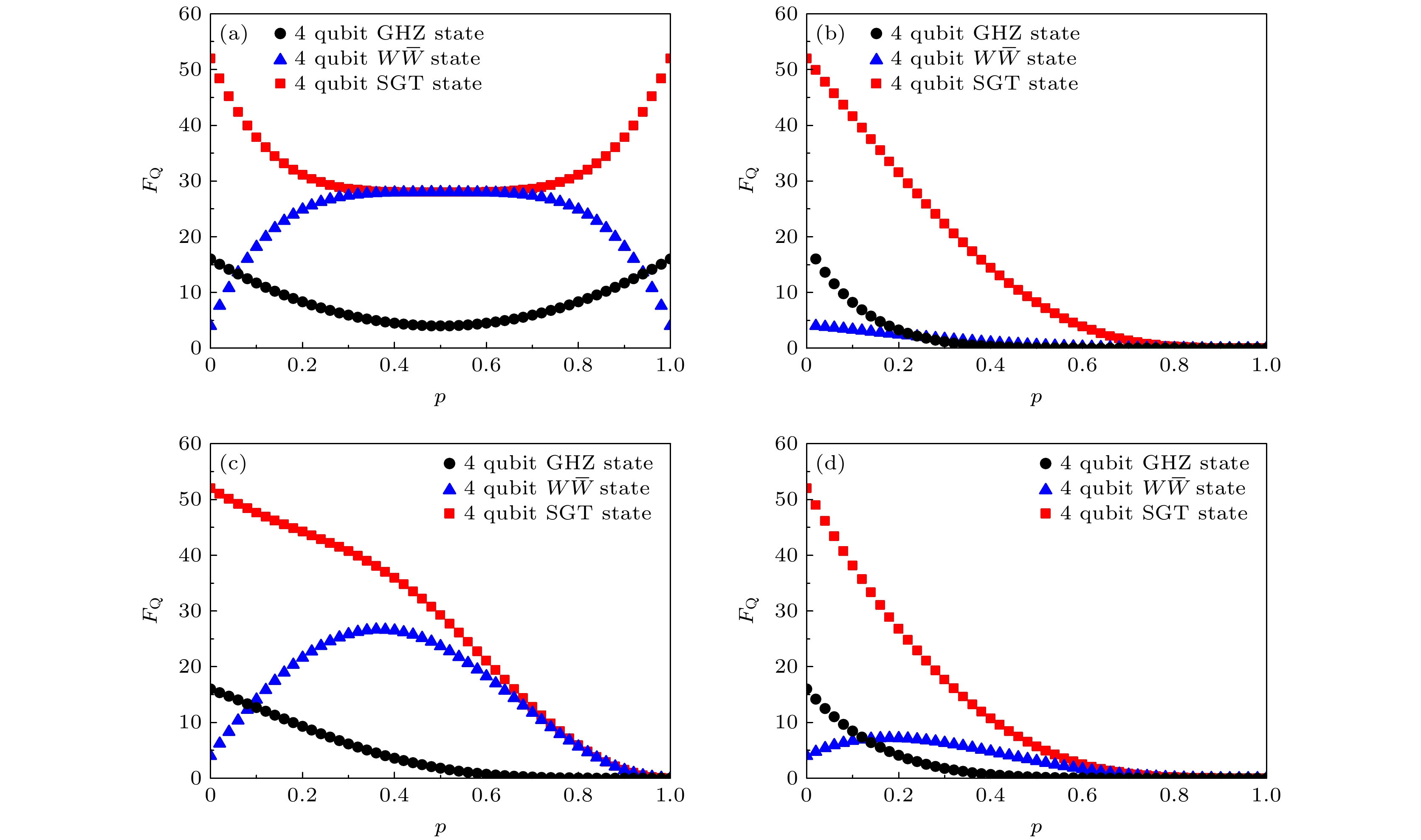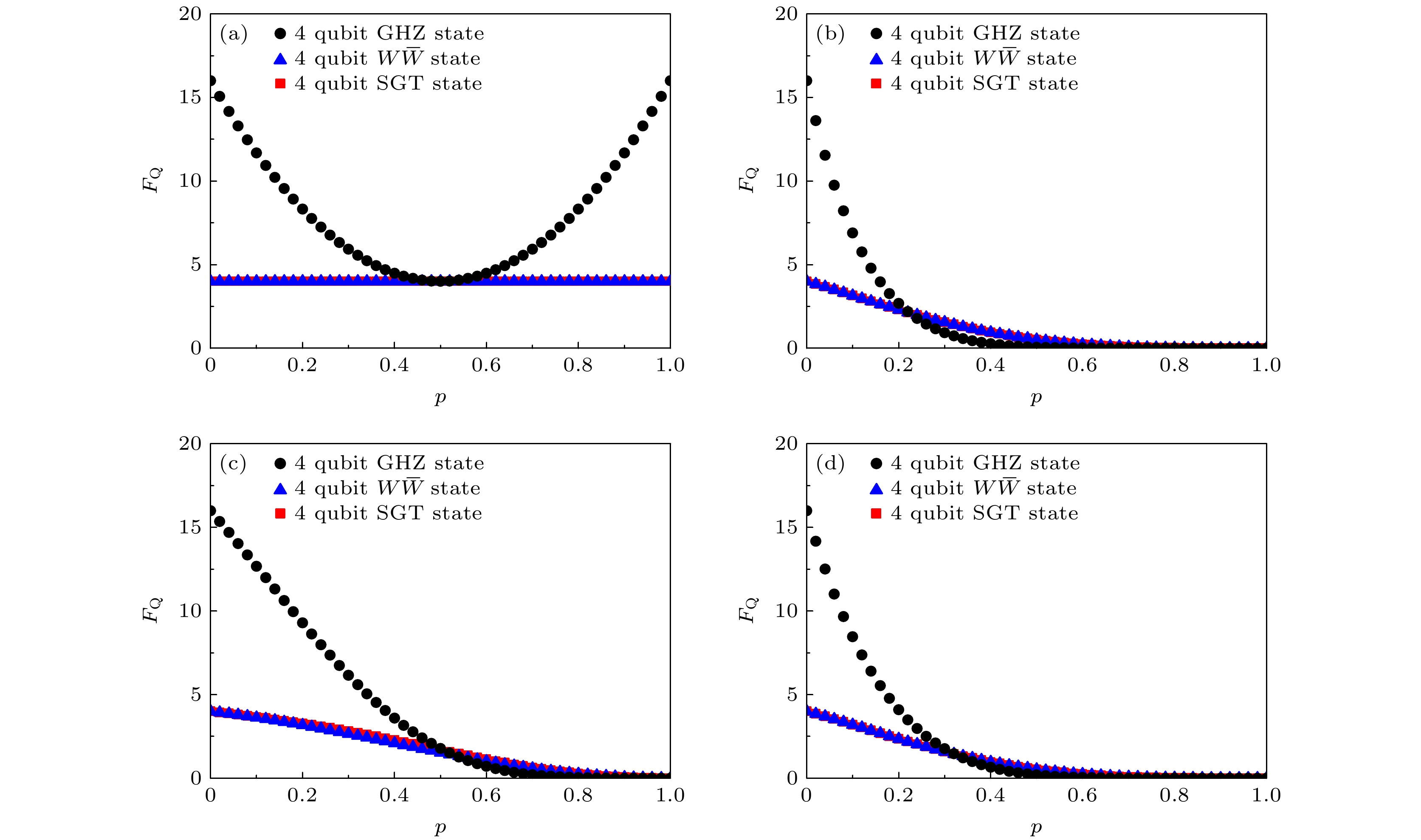 图 4 (color online) 在单轴旋转模型下($ \gamma=5 $), 4量子比特GHZ态、$ W\overline{W} $态和SGT态在比特翻转, 相位阻尼, 振幅阻尼和去极化通道下的量子Fisher信息. 黑色圆点, 蓝色三角形, 红色方块依次表示GHZ态, $ W\overline{W} $态和SGT态的量子Fisher信息随退相干参数p的变化结果. 其中, (a)表示量子态在比特翻转通道下的结果; (b)表示量子态在相位阻尼通道中的结果; (c)表示在振幅阻尼通道中的结果; (d)表示在去极化通道下的结果