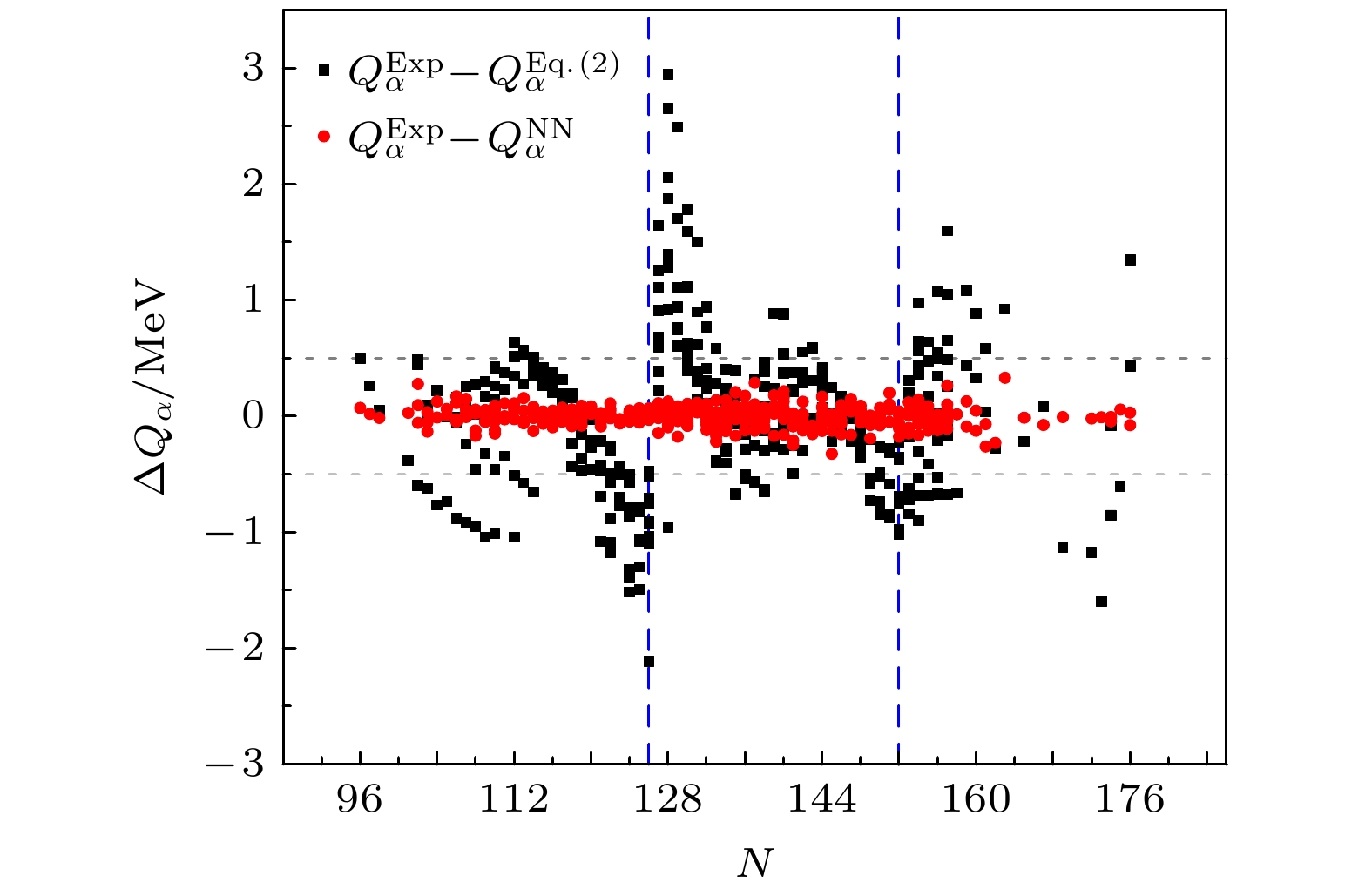 本文提出了一种用于计算原子核α衰变能($ Q_{\text{α}} $)的类液滴模型公式. 为了改进类液滴模型公式计算$ Q_{\text{α}} $的精度, 我们发展了神经网络结合类液滴模型公式的方法, 计算了原子核的$ Q_{\text{α}} $值. 通过分别对比类液滴模型计算的$ Q_{\text{α}} $值和神经网络结合类液滴模型公式的方法计算的$ Q_{\text{α}} $值与实验测量值的均方根偏差(RMSD), 发现类液滴模型计算的$ Q_{\text{α}} $值与实验值之间的RMSD从663.5 keV下降到神经网络结合类液滴模型公式的89.2 keV. 进而采用改进的$ Q_{\text{α}} $结合统一衰变公式计算了α衰变的半衰期. 虽然没有直接考虑原子核的壳效应, 但神经网络方法预测出了相应的超重核区双幻核的位置, 这与目前理论预测的超重双幻的位置非常接近, 从而给出了超重核区α衰变的稳定区域, 进一步证实了超重核稳定岛的存在.