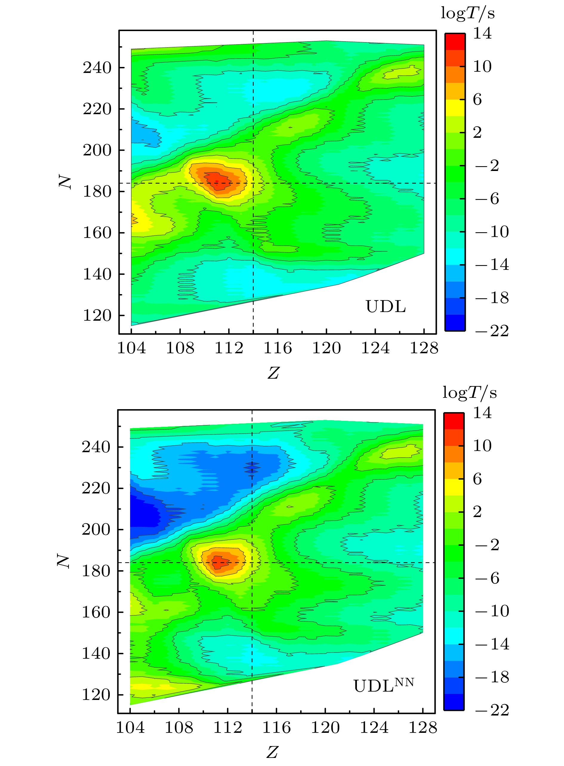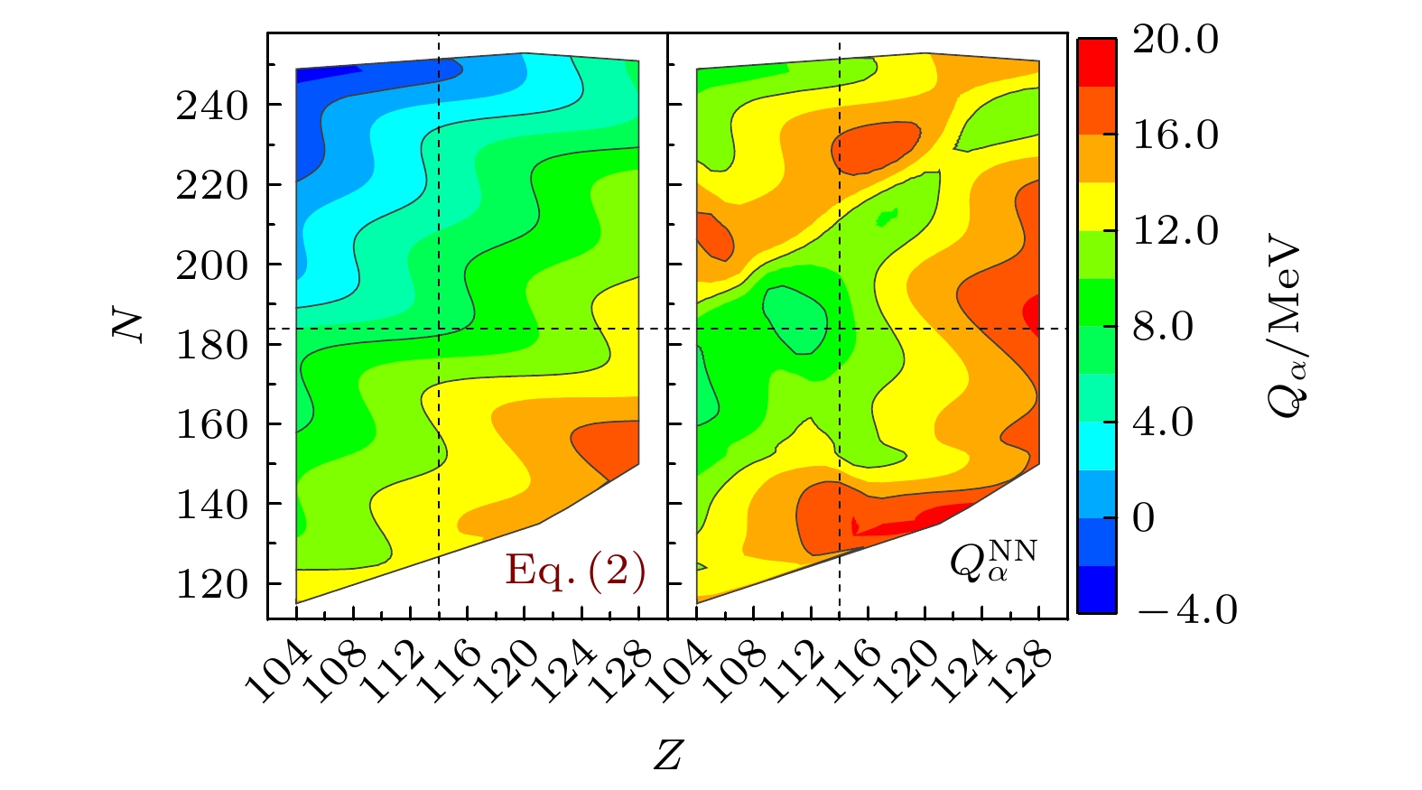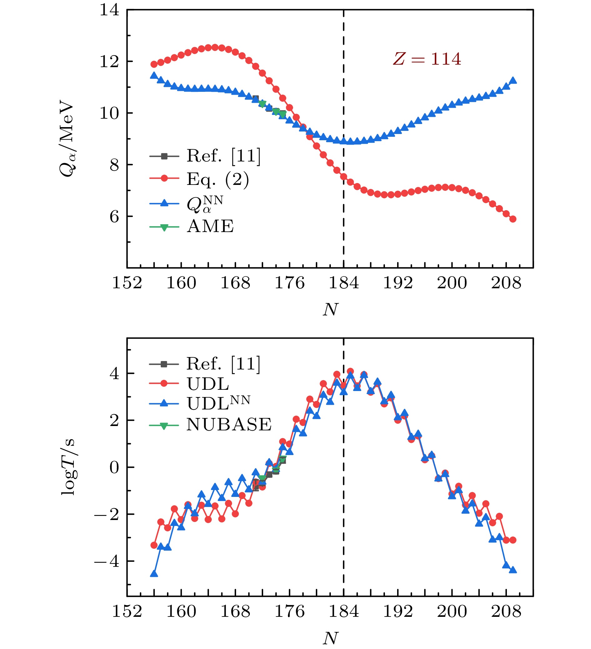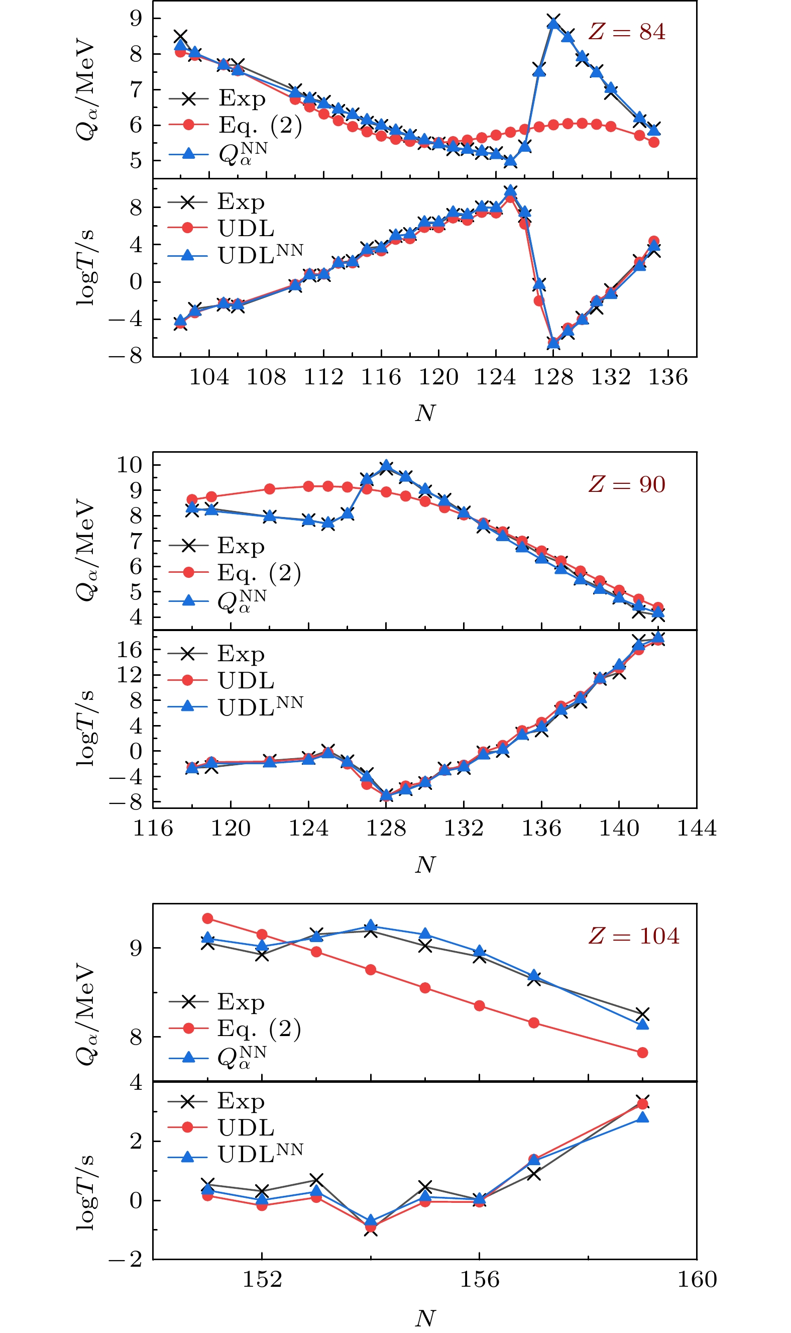 核素 $ Q_{\text{α}}^{\mathrm{L}\mathrm{Z}\mathrm{U}} $ $ Q_{\text{α}}^{\mathrm{E}\mathrm{q}. \left(2\right)} $ $ Q_{\text{α}}^{\mathrm{N}\mathrm{N}} $ UDL $ {\mathrm{U}\mathrm{D}\mathrm{L}}^{\mathrm{N}\mathrm{N}} $ 300120 13.05 9.83 13.03 –5.45 –5.59 296118 11.89 9.85 11.75 –3.21 –3.35 292116 10.64 10.34 10.08 –1.44 –1.57 288114 9.82 10.92 10.03 0.03 –0.09 284112 10.18 11.14 9.61 0.59 0.47 280110 10.04 10.74 10.63 –2.88 –3.19 302120 12.81 9.63 13.31 –6.05 –6.43 298118 11.86 9.34 11.85 –3.48 –3.86 294116 10.59 9.62 10.66 –1.12 –1.49 290114 9.56 10.20 9.69 0.99 0.63 286112 9.23 10.64 9.01 2.45 2.10 282110 9.52 10.56 10.34 –2.16 –2.74 304120 12.66 9.57 13.64 –6.73 –7.25 300118 11.75 8.97 12.04 –3.94 –4.46 296116 10.56 8.98 10.62 –1.03 –1.54 292114 9.18 9.45 9.39 1.91 1.43 288112 8.95 10.01 8.43 4.43 3.99 284110 8.48 10.21 9.94 –1.09 –1.84 306120 13.29 9.61 13.99 –7.41 –8.01 302118 11.65 8.76 12.29 –4.54 –5.13 298116 10.63 8.45 10.66 –1.17 –1.74 294114 8.85 8.72 9.14 2.67 2.16 290112 8.49 9.28 7.91 6.41 6.00 286110 8.12 9.71 9.43 0.35 –0.51 308120 13.07 9.73 14.32 –8.05 –8.68 304118 12.36 8.69 12.59 –5.20 –5.82 300116 10.57 8.08 10.77 –1.49 –2.06 296114 8.53 8.07 8.97 3.21 2.77 292112 8.30 8.52 7.49 8.17 7.87 288110 7.68 9.06 8.86 2.16 1.12 310120 11.61 9.85 14.60 –8.57 –9.21 306118 12.61 8.73 12.89 –5.86 –6.46 302116 11.37 7.85 10.93 –1.94 –2.44 298114 8.32 7.53 8.89 3.47 3.18 294112 7.96 7.78 7.20 9.44 9.26 290110 7.56 8.33 8.26 4.24 2.91 -