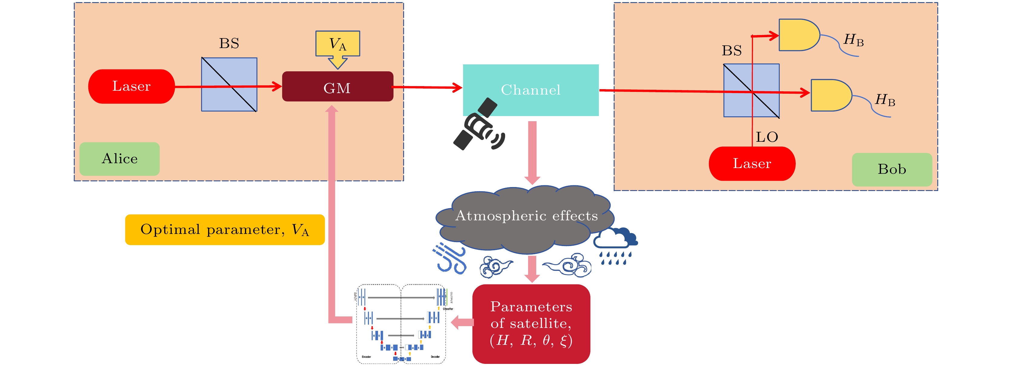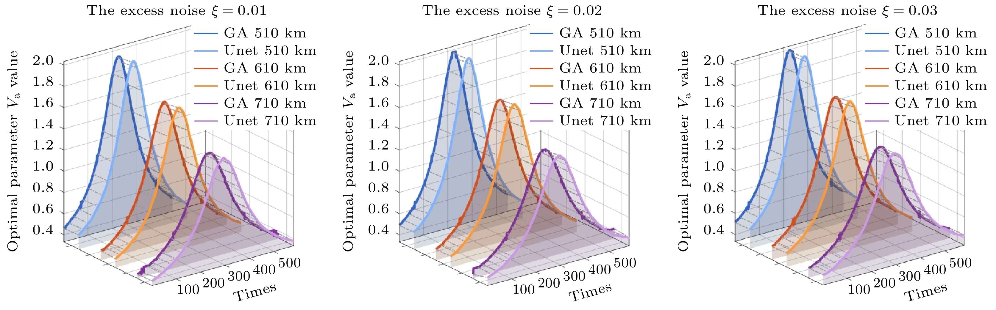 Continuous-variable quantum key distribution (CV-QKD) has made significant progress in the field of quantum communication, operating under strict conditions such as optical diffraction limit, maximum communication distance, and photoelectric detection limit. The optimization of protocol parameters, particularly the modulation variance ($ {V}_{\mathrm{A}} $), is crucial for the feasibility of CV-QKD. However, in space-to-ground CV-QKD scenarios, the high-speed relative motion between low-earth-orbit satellites and ground stations, coupled with limited on-board computing resources, poses challenges for traditional optimization algorithms to meet the real-time demands of rapidly changing space channels. To cope with these challenges, a novel method of optimizing Gaussian-modulation CV-QKD in space channels using a Unet-based approach is proposed in this work. A comprehensive simulation platform for CV-QKD links, generating a substantial training dataset of 126575 samples by changing parameters such as orbital height and zenith angle, is developed in this work. The Unet network, renowned for its symmetric architecture and powerful feature fusion capabilities, is utilized to achieve near-real-time prediction of modulation variance. Our simulation results demonstrate the effectiveness of the proposed method, with the Unet network achieving a remarkable prediction accuracy of 99.25%–99.41% on 6328 datasets, orbital heights between 510 and 710 km, and excess noise levels between 0.01 and 0.03. Compared with the local search algorithm, which takes 14754 s, the Unet-based approach significantly reduces the inference time to just 1.08 s, representing a speed-up ratio of 1.48 × 106. These findings provide a solid theoretical foundation for optimizing real-time parameters in future space-channel CV-QKD experiments, and have made significant progress in the field of quantum communication. The proposed method not only enhances the efficiency of parameter optimization but also ensures the security and reliability of CV-QKD in dynamic space environments. [1] 罗一振, 马洛嘉, 孙铭烁, 等 2024 73 240302