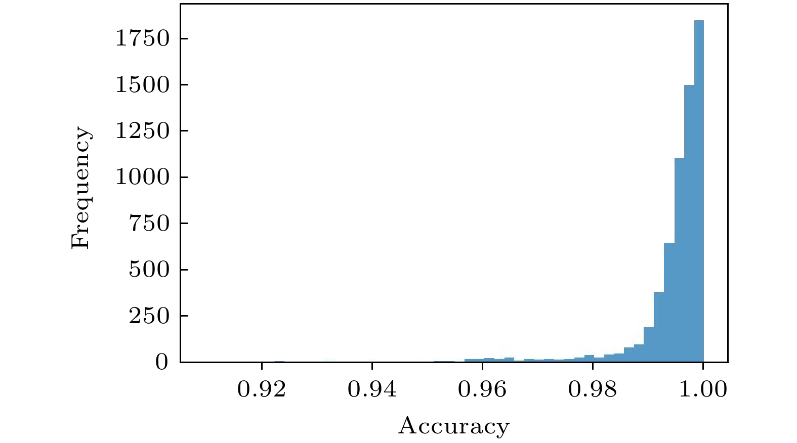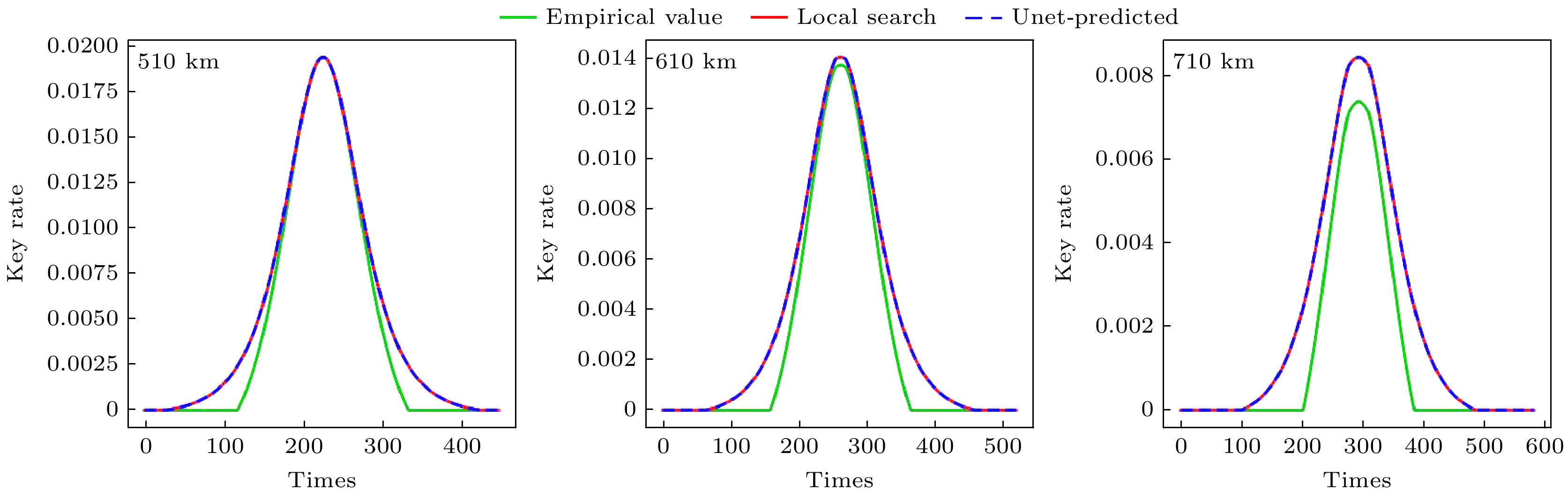 空间信道连续变量量子密钥分发协议(continuous-variable quantum key distribution, CV-QKD)工作在光学衍射极限、通信距离极限、光电探测极限条件下, 协议参数(如调制方差$ {V}_{\mathrm{A}} $)的优化选择会影响协议的可行性. 而低轨卫星和地面站始终处于高速相对运动中, 可视窗口时间有限且在轨计算资源受限, 传统优化算法难以满足空间信道快速动态变化的实时优化需求. 本文提出了空间信道高斯调制CV-QKD的Unet网络参数预测优化方法, 搭建空间CV-QKD链路仿真平台, 改变轨道高度、天顶角等组合参数生成126575组训练数据集, 利用Unet网络的对称结构和特征融合能力实现近实时地预测调制方差$ {V}_{\mathrm{A}} $. 仿真结果表明Unet网络在6328组跨轨道高度(510—710 km)和过量噪声水平(0.01—0.03)的测试数据中可以达到99.25%—99.41%的预测准确率, 同时相较于局部搜索算法14754 s的基准耗时, Unet将推理时间缩短至1.08 s (加速比达1.48 × 106), 为后续空间信道CV-QKD实验的参数实时优化提供了理论支撑.