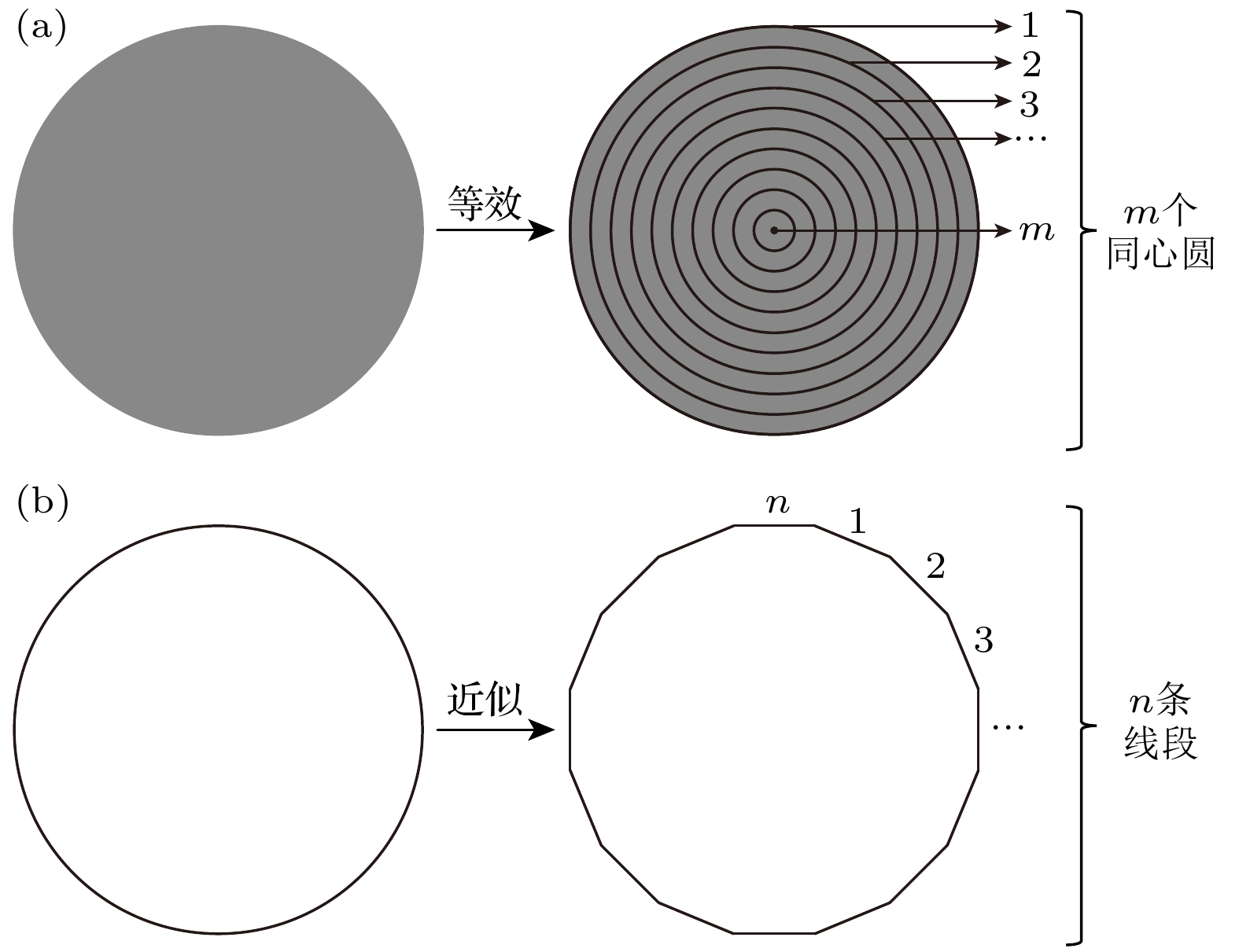 图 12 (a) 面激励等效为无数个同心圆周上线激励叠加; (b) 圆周上线激励近似为无数个线段上线激励叠加