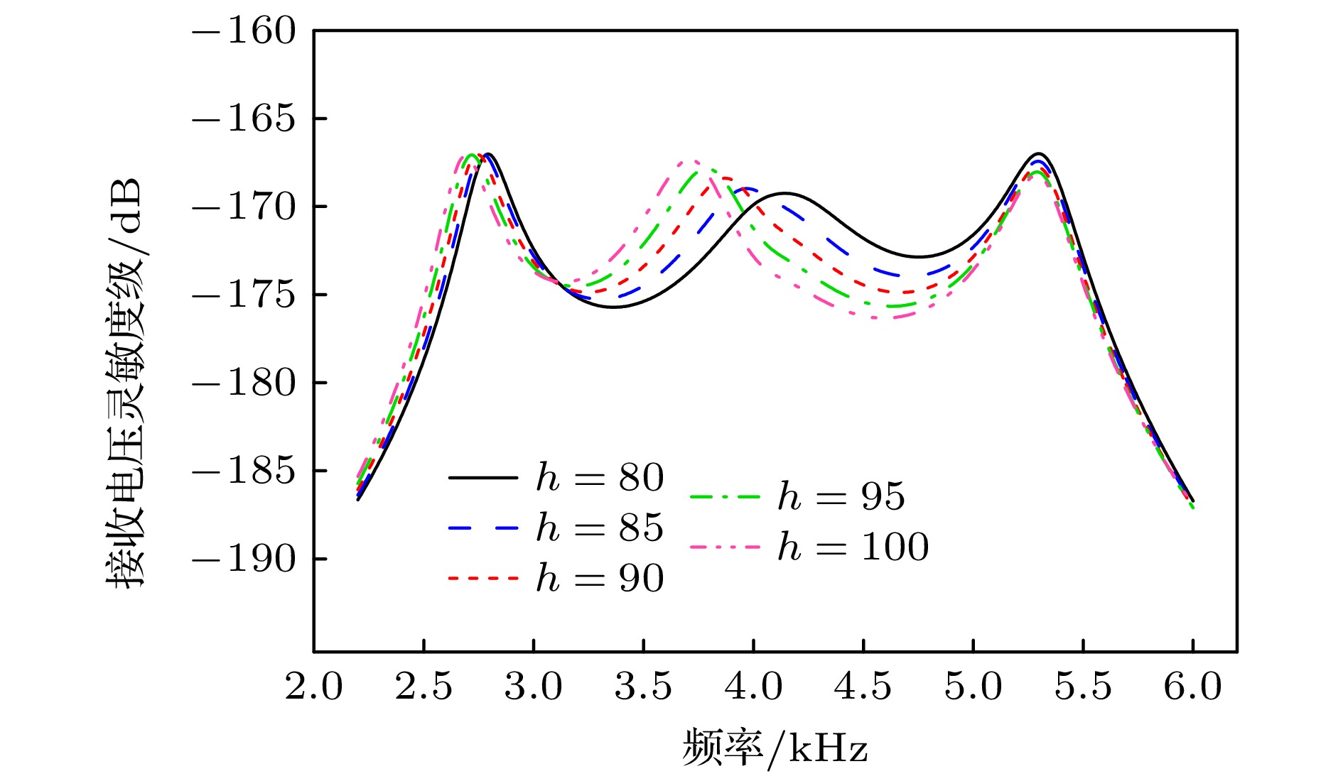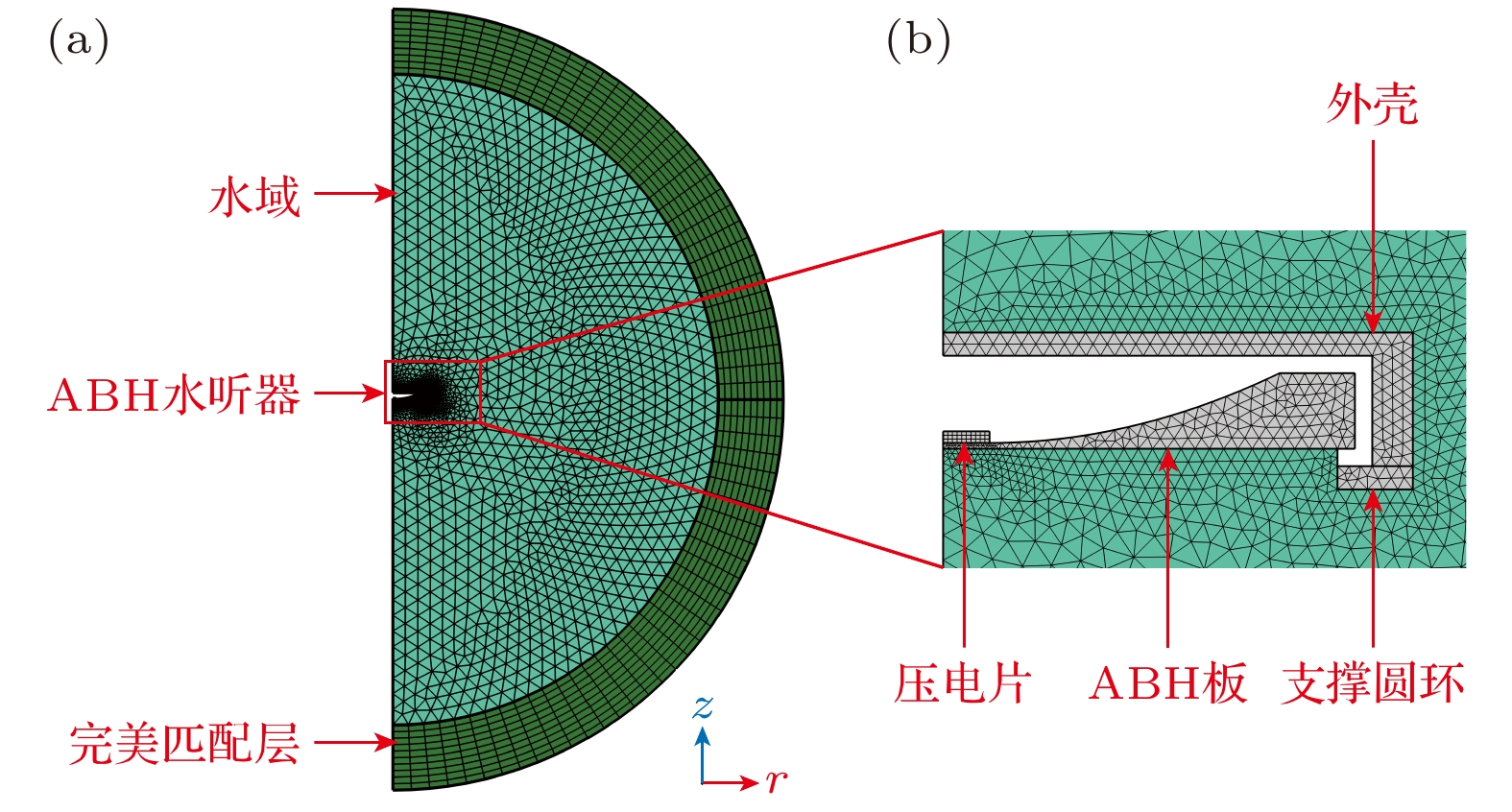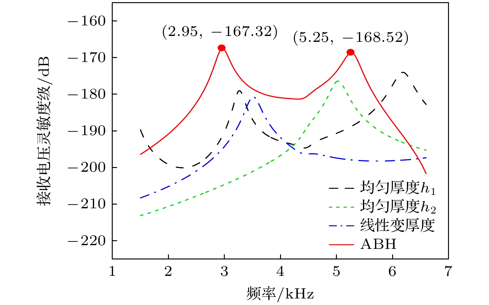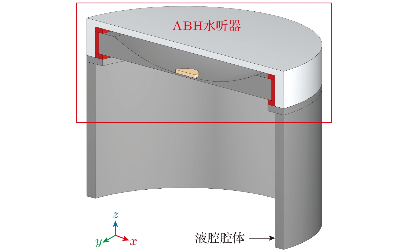针对目前水下微弱信号探测对水听器高灵敏度的需求, 提出一种声学黑洞结构形式的高灵敏度水听器. 从几何声学出发, 将声学黑洞中弯曲波汇聚特性类比为水声学中声线弯曲, 提出一种波聚集特性简化理论. 基于该特性设计了一种二维声学黑洞水听器, 通过在弯曲式水听器中引入二维声学黑洞结构, 实现振动聚集, 进而提升水听器的高灵敏度性能. 通过结构控制变量, 对比分析4种厚度形式板, 验证了声学黑洞板在1.7—5.8 kHz频段内提高水听器接收灵敏度的显著优势. 分析了声学黑洞结构水听器接收灵敏度起伏较大的原因, 并进一步设计了声学黑洞与单端开口Helmholtz液腔耦合水听器, 将前两阶声学黑洞弯曲振动模态与液腔模态耦合实现宽带接收特性. 制作了两种水听器样机并在消声水池中进行测试. 结果表明, 二维声学黑洞水听器通过弯曲振动聚集效应可有效提高水听器接收灵敏度, 并与液腔结构通过多模态耦合形成宽带, 在2.6—5.3 kHz频段内灵敏度最高可达–169 dB, 起伏控制在8 dB以内.Acoustic black hole (ABH) structures are renowned for their unique wave-focusing ability and have been widely utilized in the fields of acoustics and vibration. Based on this property, a novel high-sensitivity hydrophone design incorporating a two-dimensional (2D) ABH structure is proposed in this work. According to the principles of geometrical acoustics, the wave-converging behavior of bending waves in ABH structures is compared to the bending of acoustic ray in underwater acoustics. A simplified theoretical model describing the relationship between the bending wave trajectory and the wave speed gradient in polar coordinates is established for two-dimensional (2D) ABH configurations and verified through numerical simulations. Based on this mechanism, a 2D ABH hydrophone is developed by integrating the ABH structure into bending-plate hydrophone, enabling vibration energy concentration and significantly enhancing sensitivity. The comparative studies of hydrophones using uniform-thickness plates and linearly tapered thickness plates as receiving surfaces confirm the superior performance of the ABH hydrophone in a frequency range of 1.7–5.8 kHz. To address the significant undulations observed in the sensitivity response, which is attributed to vibration superposition, a liquid cavity of specific length is introduced. This leads to the development of an ABH-Helmholtz-coupled hydrophone (ABHH hydrophone), wherein the first two bending modes of the ABH structure are coupled with the resonant modes of a single-ended open liquid cavity, resulting in broadband reception capability. The prototypes of both hydrophone designs are fabricated and experimentally tested in an anechoic water tank. The results show that both devices achieve peak receiving sensitivities exceeding –169 dB. Notably, the ABHH hydrophone maintains sensitivity fluctuations within 8 dB in a frequency band of 2.6–5.3 kHz. This study confirms that 2D ABH structures can effectively improve hydrophone sensitivity through bending wave convergence, and can achieve broadband acoustic detection when the structure is coupled with liquid cavity resonators. These findings lay a solid foundation for the application of ABH structures in the design of underwater acoustic transducer.