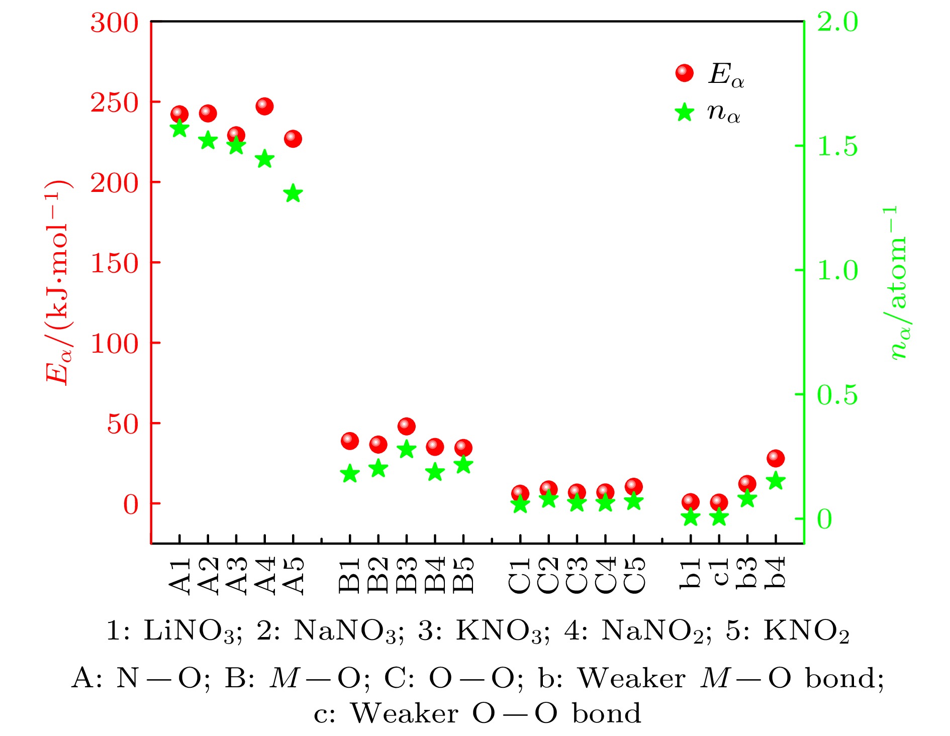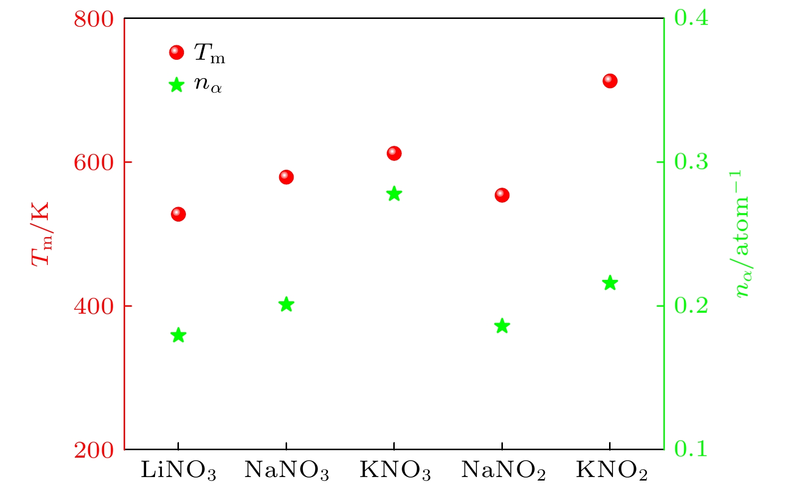 MNOx $ {T}_{\mathrm m} $/K[41] $ {\overline{T}}_{\mathrm m} $/K $ \dfrac{\left|\Delta{T}_{\mathrm m}\right|}{{T}_{\mathrm m}} $/% $ {n}_{{M}-\mathrm{O}} $/atom–1 $ {E}_{\mathrm c}/ $( eV·atom–1)[42] $ {\overline{E}}_{\mathrm c}/( $eV·atom–1) $ \dfrac{\left|\Delta{E}_{\mathrm c}\right|}{{E}_{\mathrm c}} $/% LiNO3 527.5 518.56 1.6 0.1795 14.350 13.986 2.5 NaNO3 579.1 586.00 1.2 0.2009 13.833 13.821 0.1 KNO3 612.2 640.27 4.6 0.2779 13.654 12.683 7.1 NaNO2 554.0 563.54 1.7 0.1859 11.233 11.582 3.1 KNO2 713.0 691.66 3.0 0.2159 11.054 10.936 1.1 表 2 二元共晶熔盐体系的计算和观测的液化温度和混合能