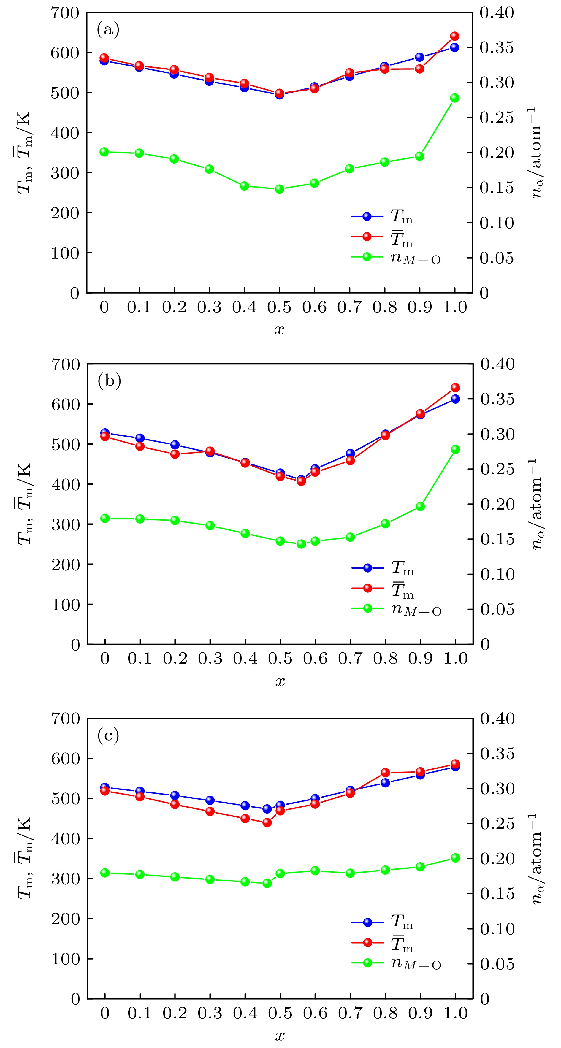 x $ {T}_{\mathrm{m}} $/K[41] $ {\overline{T}}_{\mathrm{m}} $/K $ \dfrac{\left|\Delta{T}_{\mathrm{m}}\right|}{{T}_{\mathrm{m}}} $/% $ {n}_{{M}-\mathrm{O}} $/atom–1 $ {E}_{\mathrm{c}}/ $(eV·atom–1)[42] $ {\overline{E}}_{\mathrm{c}}/( $eV·atom–1) $ \dfrac{\left|\Delta{E}_{\mathrm{c}}\right|}{{E}_{\mathrm{c}}} $/% 0.1 517.9 503.94 2.7 0.1773 14.298 13.97 2.3 0.2 507.1 485.17 4.3 0.1737 14.247 13.88 2.6 0.3 495.2 467.32 5.6 0.1702 14.195 13.796 2.8 0.4 482 450.07 6.6 0.1667 14.143 13.718 3.0 0.463 473.5 439.77 7.1 0.1645 14.111 13.671 3.1 0.5 482.5 469.06 2.8 0.1787 14.091 13.608 3.4 0.6 499.4 485.9 2.7 0.1827 14.04 14.255 1.5 0.7 520.1 512.96 1.4 0.179 13.988 13.799 1.4 0.8 538.7 564.38 4.8 0.1835 13.936 14.084 1.1 0.9 558.7 566.4 1.4 0.1881 13.885 13.986 0.7 -