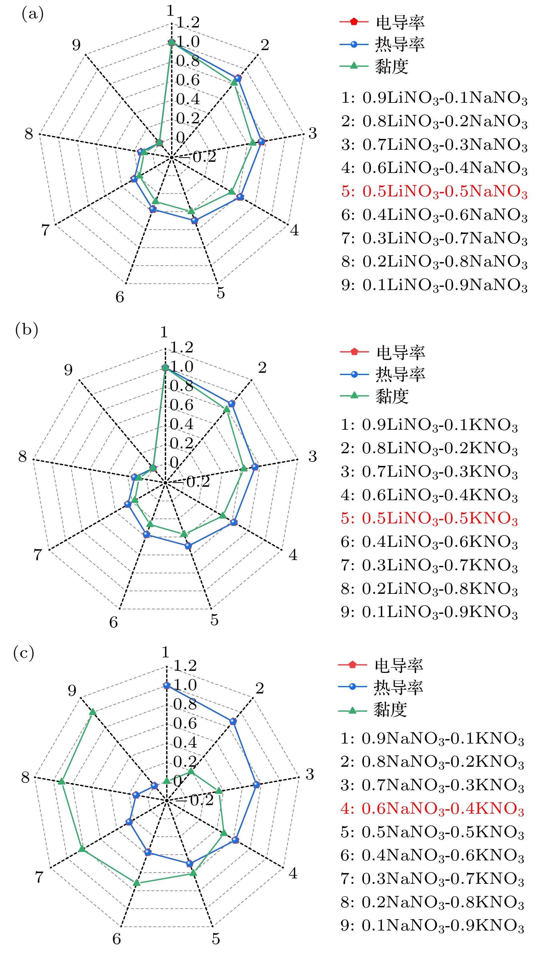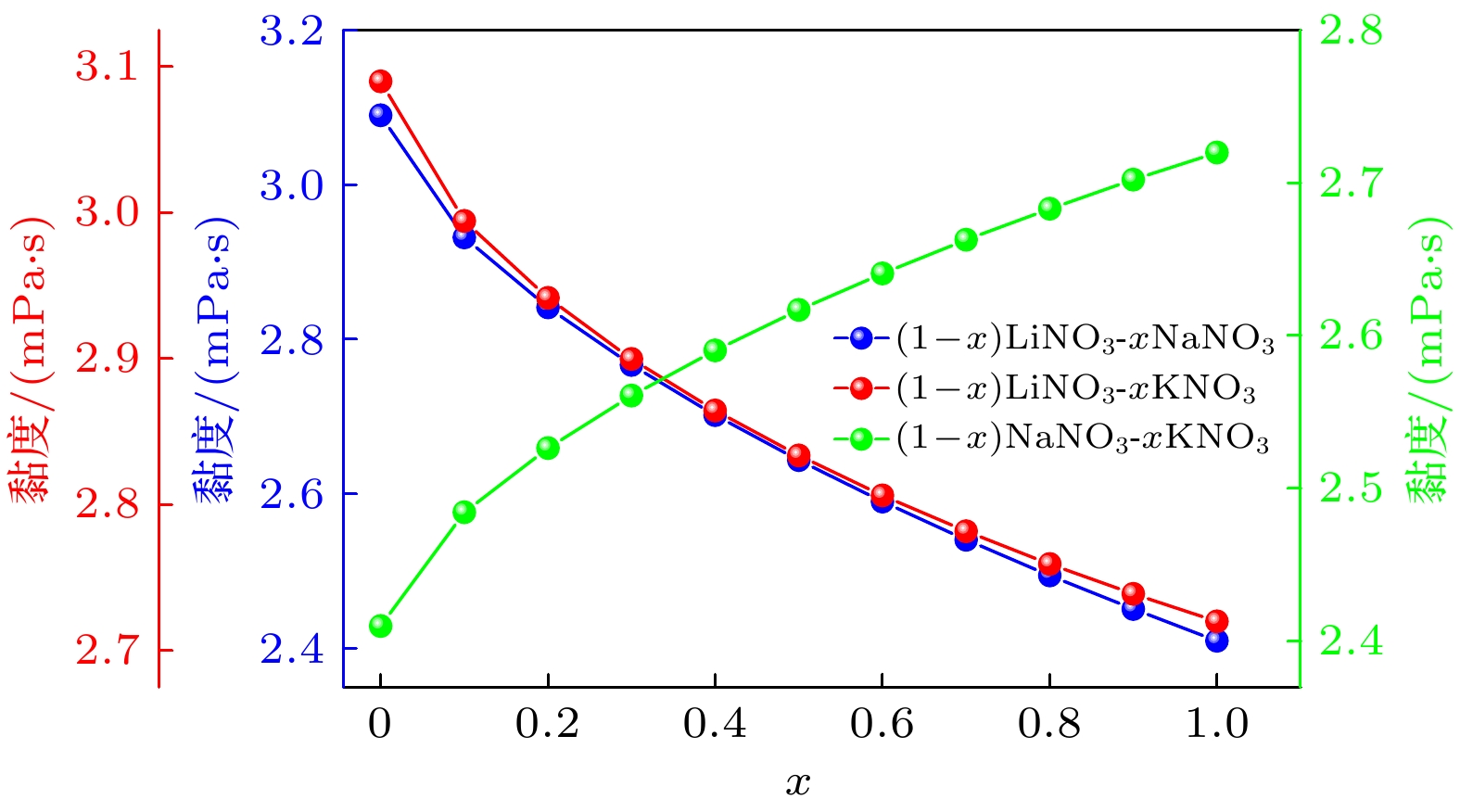 x $ {T}_{\mathrm{m}} $/K[41] $ {\overline{T}}_{\mathrm{m}} $/K $ \dfrac{\left|\Delta{T}_{\mathrm{m}}\right|}{{T}_{\mathrm{m}}} $/% $ {n}_{{M}-\mathrm{O}} $/atom–1 $ {E}_{\mathrm{c}}/ $(eV·atom–1)[42] $ {\overline{E}}_{\mathrm{c}}/( $eV·atom–1) $ \dfrac{\left|\Delta{E}_{\mathrm{c}}\right|}{{E}_{\mathrm{c}}} $/% 0.1 563 566.42 0.6 0.199 13.815 13.705 0.8 0.2 546 556.96 2.0 0.1908 13.797 12.762 7.5 0.3 528 537.35 1.8 0.1763 13.779 12.924 6.2 0.4 512 522.50 2.1 0.1522 13.761 13.687 0.5 0.5 494 497.77 0.8 0.1479 13.743 13.629 0.8 0.6 514 509.20 0.9 0.1564 13.726 13.481 1.8 0.7 540 549.02 1.7 0.1769 13.708 13.209 3.6 0.8 565 558.5 1.2 0.1865 13.690 13.022 4.9 0.9 588 558.72 5.0 0.1947 13.672 12.812 6.3 表 4 (1–x)LiNO3-xKNO3二元复合熔盐体系的计算和观测的液化温度和混合能