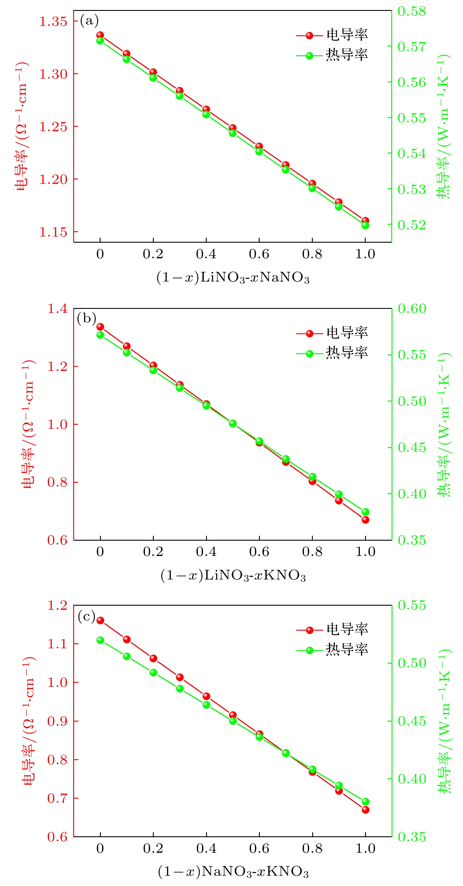 Fig. 4. Variation trends of liquidus temperatures and M−O covalent electron pair numbers $ {n}_{M-\mathrm{O}} $ in binary nitrate molten salts: (a) (1–x)NaNO3-xKNO3; (b) (1–x)LiNO3-xKNO3; (c) (1–x)LiNO3-xNaNO3.