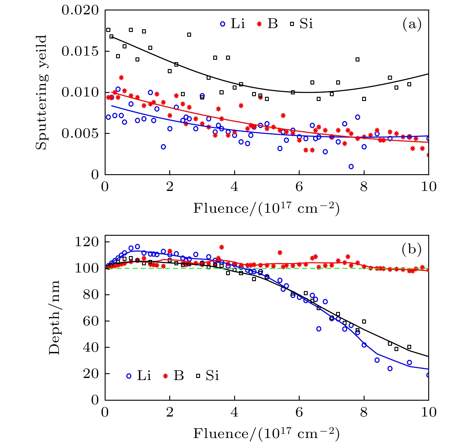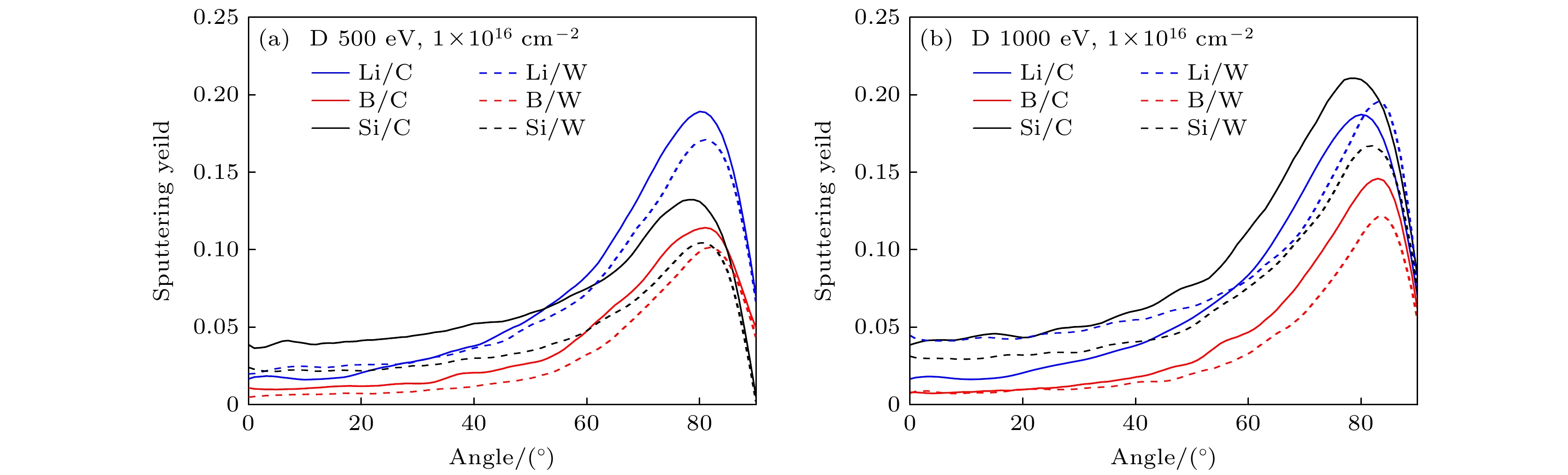 聚变装置表面涂覆壁处理如锂化、硼化、硅化等形成的涂层在高能氘粒子的轰击下会因为物理化学溅射损失, 从而使壁条件变差, 影响等离子体放电性能. 为了评估不同壁涂层的溅射损失行为, 本文采用两体碰撞近似模型, 对以碳、钨为基材的锂、硼和硅涂层材料在氘粒子轰击下的物理溅射行为进行了模拟分析. 结果表明, 因锂具有低的表面结合能而硅具有高的原子序数, 锂和硅分别在一定入射条件下溅射产额最大. 对于双层靶, 钨基涂层的溅射产额在特定能量出现剧增, 主要是由于钨溅射阈值高, 入射粒子在钨界面被大量反射, 并且具有较高的能量. 最后, 由于靶表面成分会随着入射通量增加而变化, 涂层材料的溅射产额也随之变化. 本研究为聚变装置壁处理涂层寿命的评估提供数据支持, 并为壁处理涂层材料设计及处理策略提供了重要的理论参考.Wall conditioning coatings—lithium (Li), boron (B) and silicon (Si)—introduced by lithiumization, boronization, or siliconization, serve as a critical strategy for suppressing fuel recycling and reducing impurity fluxes from the wall of a tokamak. These techniques directly improve plasma initiation, reproducibility, energy confinement, and operational stability in fusion devices. However, these coatings undergo both physical and chemical sputtering by boundary plasma bombardment. This erosion behavior critically determines coating lifetime and, consequently, long-pulse plasma performance. To evaluate the influence of physical sputtering on coating durability and to compare material-specific differences, binary collision approximation (BCA) simulations are conducted to investigate the physical sputtering behaviors of Li, B, and Si coatings. Carbon (C) and tungsten (W) substrates are also modeled to assess interface effects. The results reveal the significant differences in sputtering yields between Li, B, and Si in incident angles and deuterium energies. Owing to its low surface binding energy, lithium exhibits the highest sputtering yield at large angles and low energies, while silicon, with the highest atomic number, presents the highest sputtering yield at small angles and high energies. Sputtering yields of carbon-based and tungsten-based coatings vary with angle and energy, driven by their differences of deuterium backscattering and substrate sputtering at the interface. Notably, for tungsten-based coatings, the sputtering yields increase dramatically at specific energies. This occurs because tungsten’s high surface binding energy causes incident deuterium atoms to reflect off the tungsten interface and then collide with coating elements. Consequently, when the energy transferred to the surface element is higher than its sputtering threshold, the sputtering yield increases. Additionally, increasing incident fluence modifies the target composition, leading to corresponding changes in the sputtering yields of coating materials. In summary, coating materials should be selected according to the expected angle distribution and energy distribution of the incident plasma particles. To suppress the abrupt yield increase observed in tungsten substrates at specific energies, the coatings must be sufficiently thick. These findings provide a theoretical basis for selecting conditioning materials and optimizing wall conditioning strategies in fusion devices.