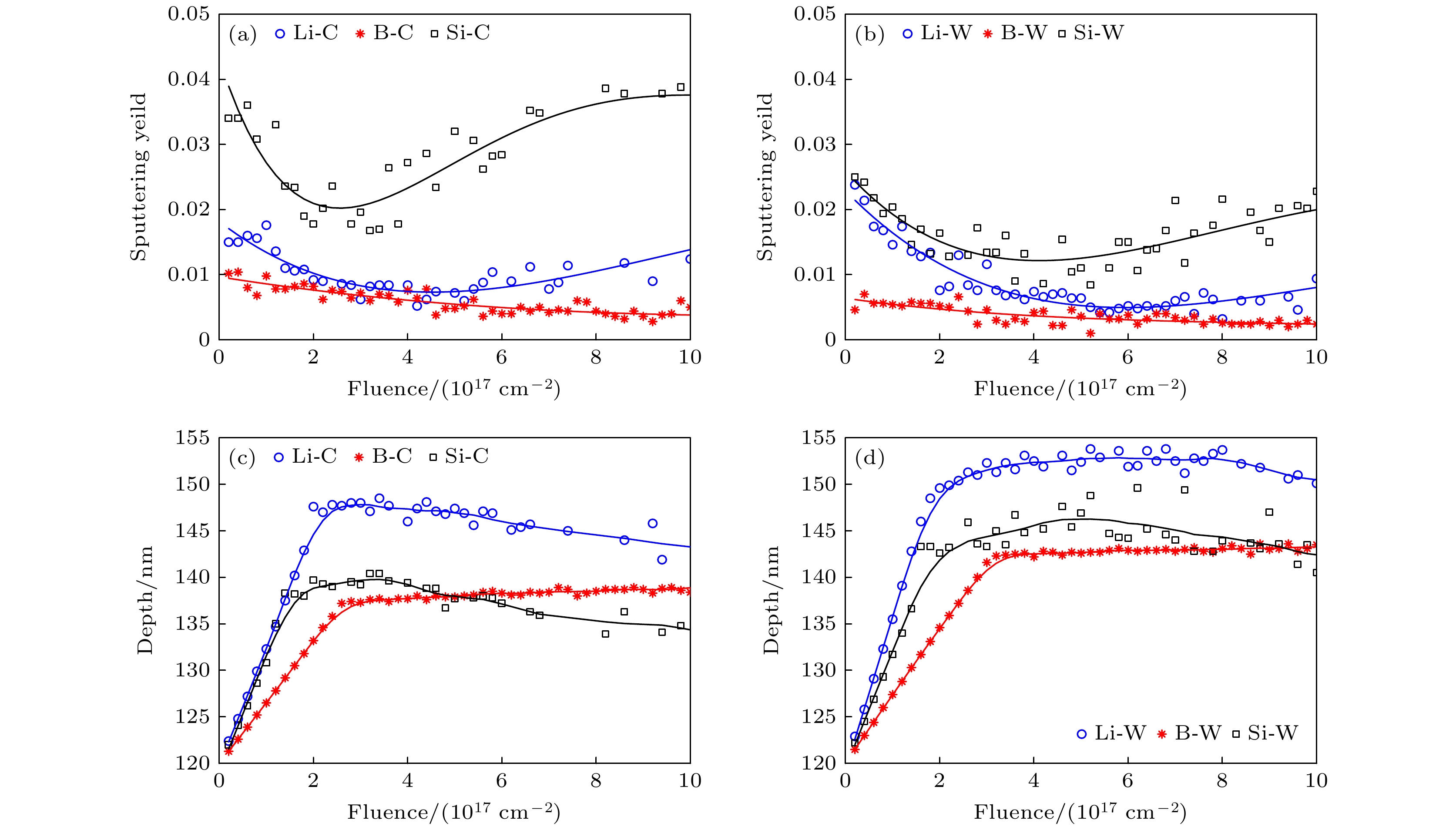 图 6 溅射产额及靶材厚度随入射通量的变化情况 (a)碳基靶溅射产额变化; (b)钨基靶溅射产额变化; (c)碳基靶厚度变化; (d)钨基靶厚度变化