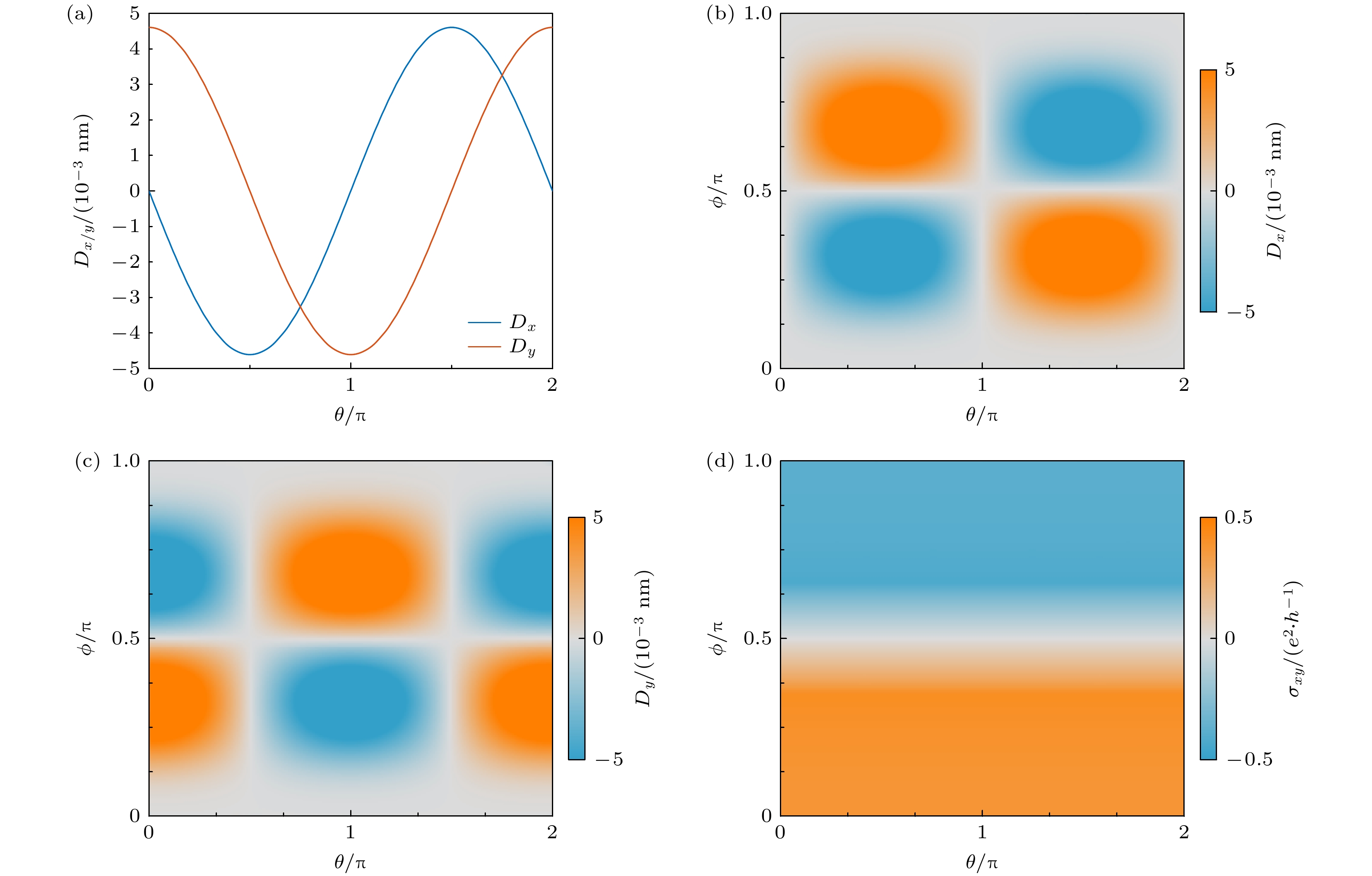 Fig. 3. (a) Numerically calculated Berry dipole moment $ D_{x/y} $ as functions of θ with$ \phi=0.2\pi $; (b)–(d) $ D_{x} $, $ D_{y} $, and $ \sigma_{xy} $ as functions of θ and ϕ, respectively. The colors describe the strength of $ D_x $, $ D_y $, and $ \sigma_{xy} $. We fix the Fermi surface as $ E_{\mathrm{F}}=-0.5 $ in the numerical calculations.