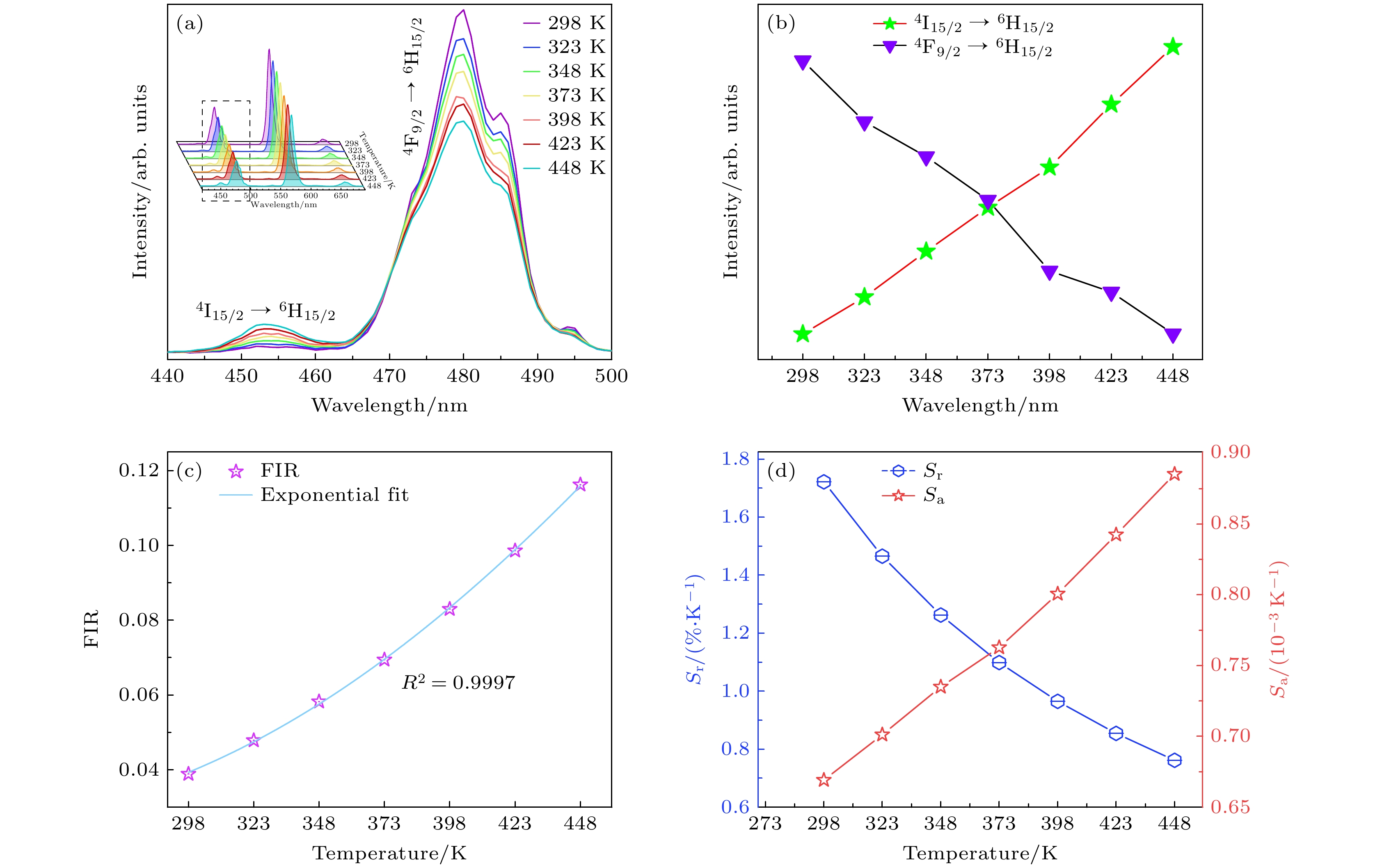 Fig. 11. (a) Emission spectra of the CNYP: 0.07 Dy3+ phosphor in the wavelength range of 440–500 nm at different temperatures (298–448 K); (b) the luminous intensity changes of the 4I15/2→6H15/2 and 4F9/2→6H15/2; (c) fluorescence intensity ratio as a function of temperatures; (d) absolute sensitivity and relative sensitivity as a function of temperatures.