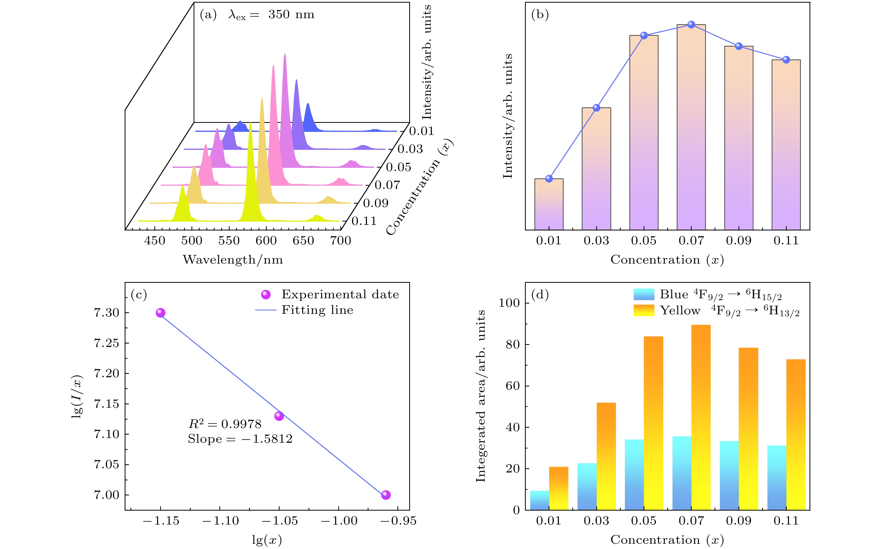 图 4 (a) CNYP: xDy3+ (x = 0.01—0.11)的三维发射光谱(λex = 350 nm); (b) 积分发射强度与Dy3+浓度柱状图; (c) lg(I/x)与lg(x)的线性拟合关系图; (d) 480 nm与571 nm处的相对发光强度