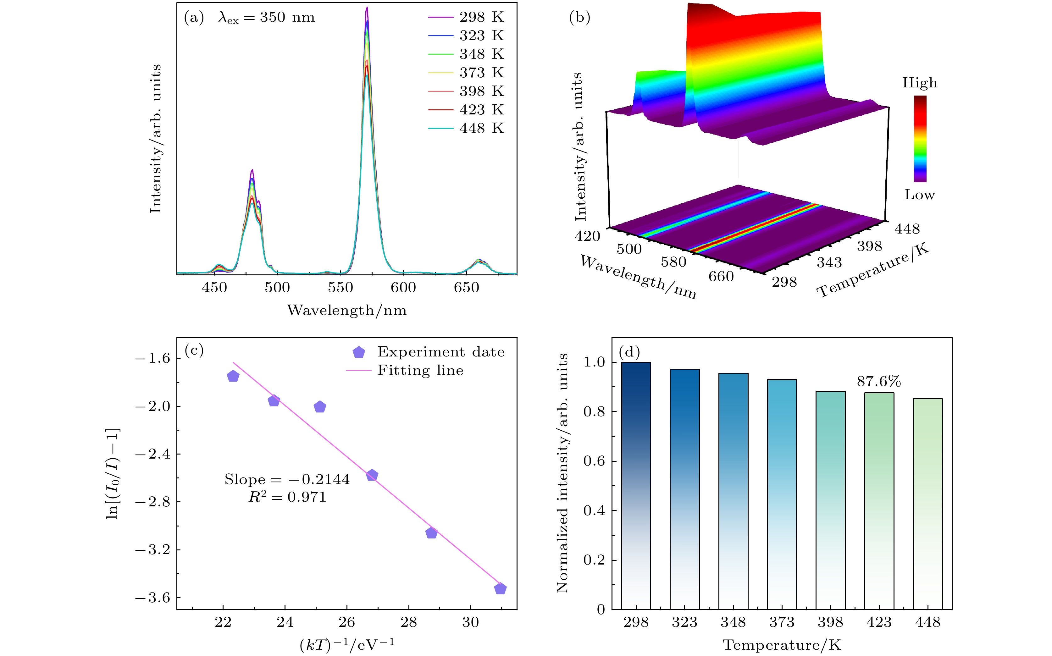 图 8 (a) CNYP: 0.07 Dy3+荧光粉在不同温度下的发射光谱; (b) 荧光强度3D图; (c) ln[(I0/I) – 1]与1/(kT)线性拟合关系; (d) 归一化发光强度随温度变化柱状图
