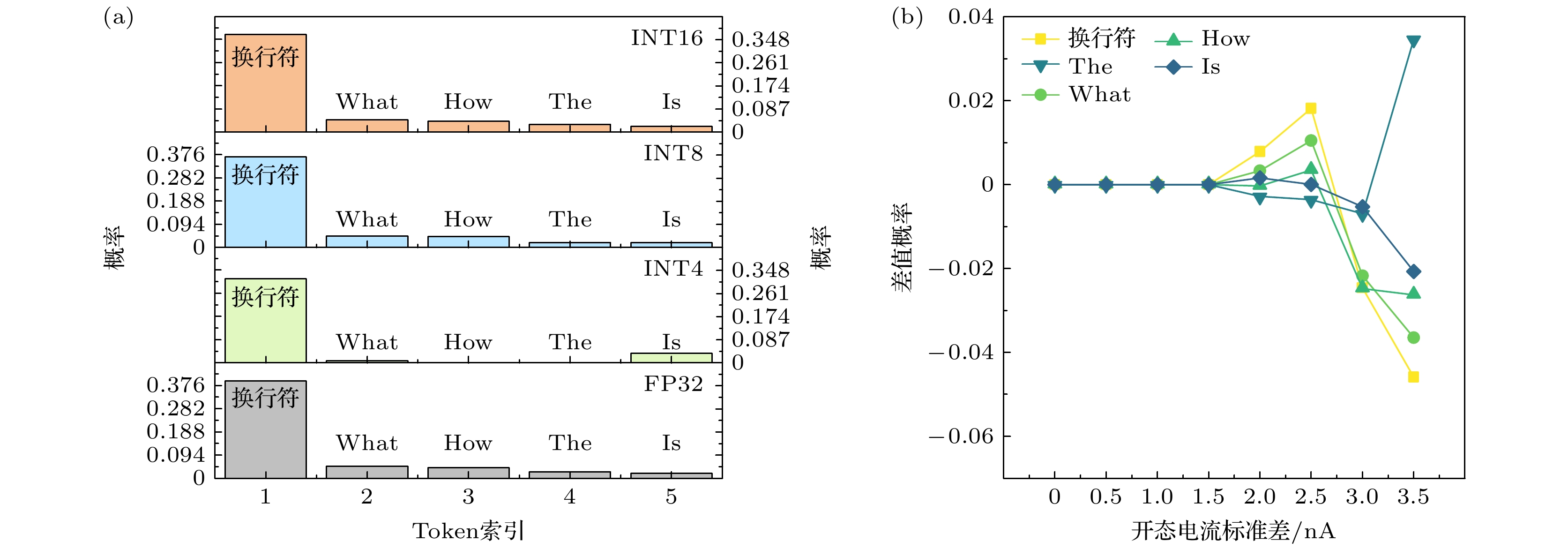 Fig. 8. (a) Token probabilities of the model under different quantization bit widths (prompt: “How is the weather today?”); (b) output probability distribution of the GPT-2-124M model under different open-state current distributions.