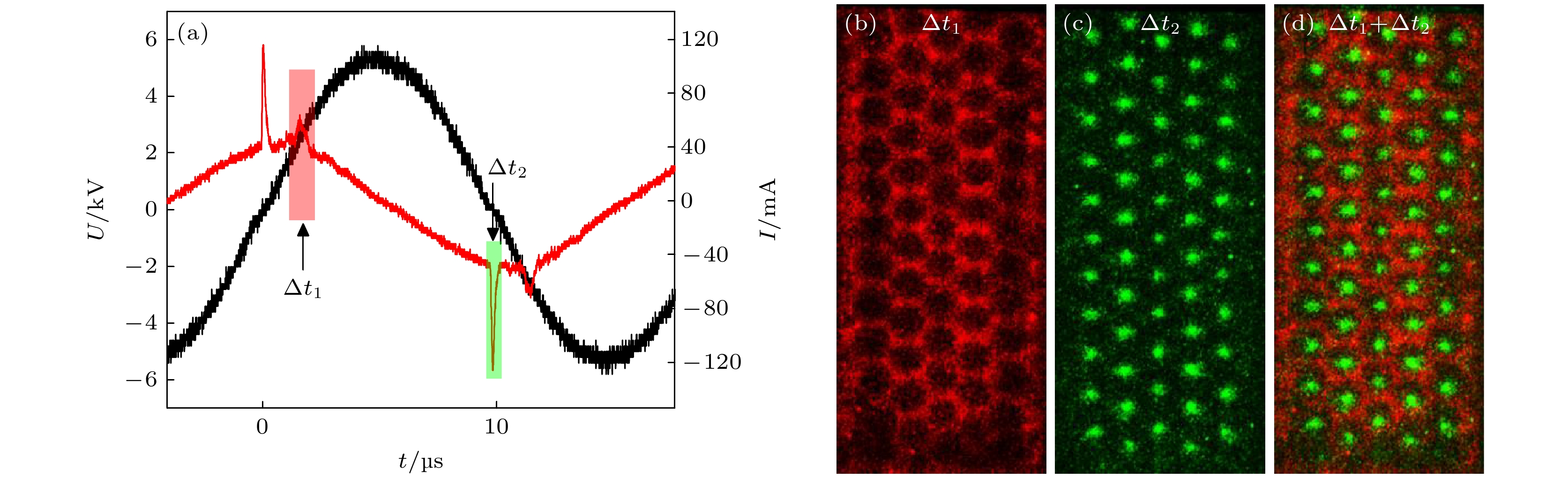 Fig. 5. Instantaneous images of the honeycomb superlattice pattern: (a) Waveforms of the voltage and the current. (Δt1 = 560 ns, Δt2 = 2000 ns); (b), (c) images exposed corresponding to the current pulse phases denoted by ∆t1 and ∆t2 in (a), respectively, and the images are integrated for 100 voltage cycles; (d) superposition of panels (b), (c).