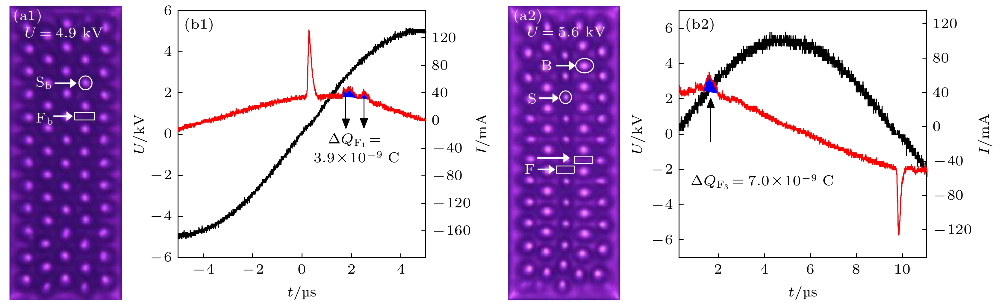图 6 两种蜂窝超点阵斑图的电压电流波形图 (a1) 蜂窝超点阵斑图及其电压电流波形图(b1); (a2) 类蜂窝超点阵斑图及其电压电流波形图(b2)