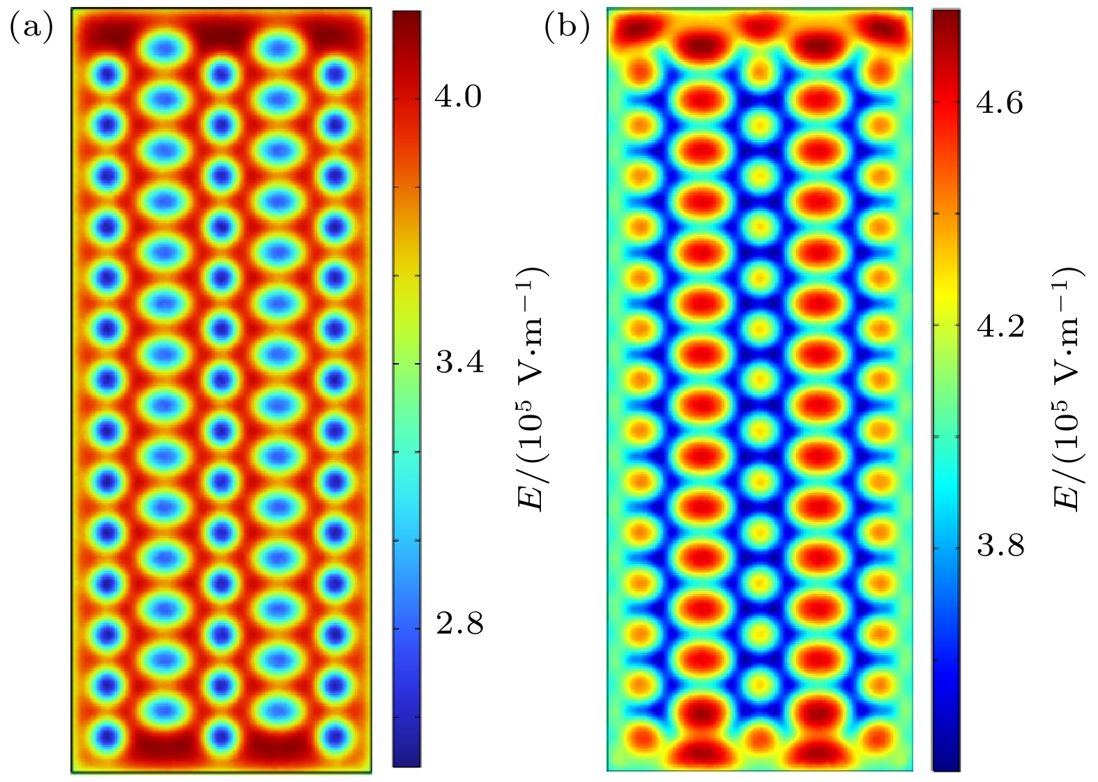 本工作设计了一种具有长方形边界的介质阻挡放电装置, 首次观察到了一种包含被隔列拉伸蜂窝框架的蜂窝超点阵斑图, 并对其形成机制进行了实验和理论研究. 随着外加电压的增大, 斑图从具有D6h对称性的蜂窝超点阵斑图演化到D2h对称性的类蜂窝超点阵斑图. 实验上采用高速照相机和光电倍增管测量了上述两种斑图的时空结构, 发现蜂窝超点阵斑图中的六边形子点阵变成为大、小条纹两个子点阵, 同时蜂窝框架子点阵被隔列拉伸, 而且除上升沿放电外还存在下降沿放电. 理论上使用COMSOL Multiphysics软件数值求解泊松方程, 模拟了外加电压上升沿中的隔列拉伸蜂窝框架放电前后的电场, 其结果很好地解释了实验现象, 给出了隔列拉伸的蜂窝框架的形成机制.Patterns formed in dielectric barrier discharge is a typical nonlinear self-organization phenomenon. Research on the patterns helps elucidate the formation and evolution mechanisms of spatiotemporal structures in non-equilibrium systems, while also holding potential application value in fields such as material processing and plasma chemical engineering. A honeycomb superlattice pattern with an alternately-stretched honeycomb frame is observed in dielectric barrier discharge with a rectangular modulated gas gap for the first time and is studied both experimentally and theoretically. As the applied voltage increases, the pattern evolves from a hexagonal superlattice pattern with D6h symmetry to a quasi honeycomb superlattice pattern with D2h symmetry. Experimentally, the spatiotemporal structures of these two patterns are measured using an intensified charge coupled device (ICCD) and two photomultiplier tubes (PMTs). It is found that the hexagonal sublattice in the honeycomb superlattice pattern is divided into two sublattices, including a large stripe sublattice and a small stripe lattice. Additionally, the honeycomb frame sublattice is alternately-stretched. Discharges occur during both the rising and falling edges of the applied voltage. Through the estimation of the wall charge quantities of the two types of honeycomb frames and the analysis of the influence of boundaries on pattern formation, it is found that the quasi honeycomb superlattice pattern emerges as a self-organized structure under the influence of gas gap symmetry. Theoretically, the Poisson equation is numerically solved using COMSOL Multiphysics to simulate the electric field of the alternately-stretched honeycomb frame before and after discharge during the rising phase of the applied voltage. The result well explains the experimental phenomenon and provides the formation mechanism of the alternately-stretched honeycomb frame.