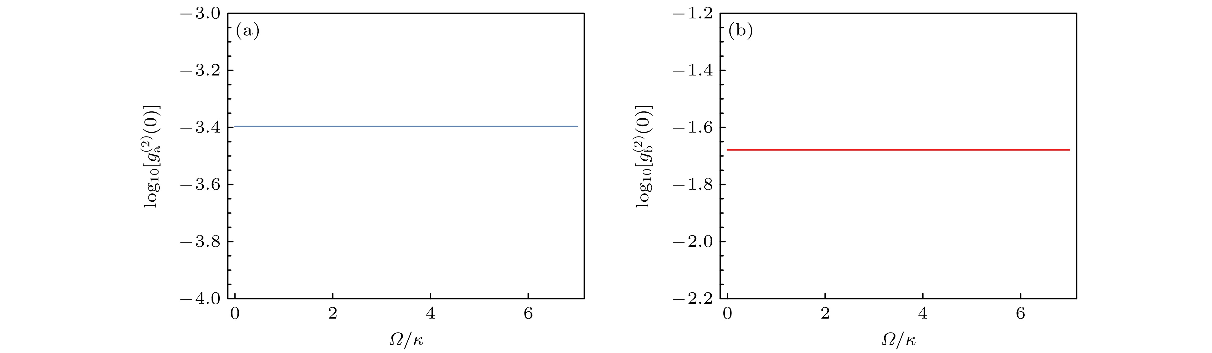 图 4 (a), (b)分别为a, b腔等时二阶关联函数$ g^{(2)}(0) $随驱动强度$ \varOmega/\kappa $的变化图. 共享参数为$ \varDelta_{0}=\sqrt{3}g $, $ \gamma/\kappa=0.1 , $$ g /\kappa =25 /\sqrt{3} $