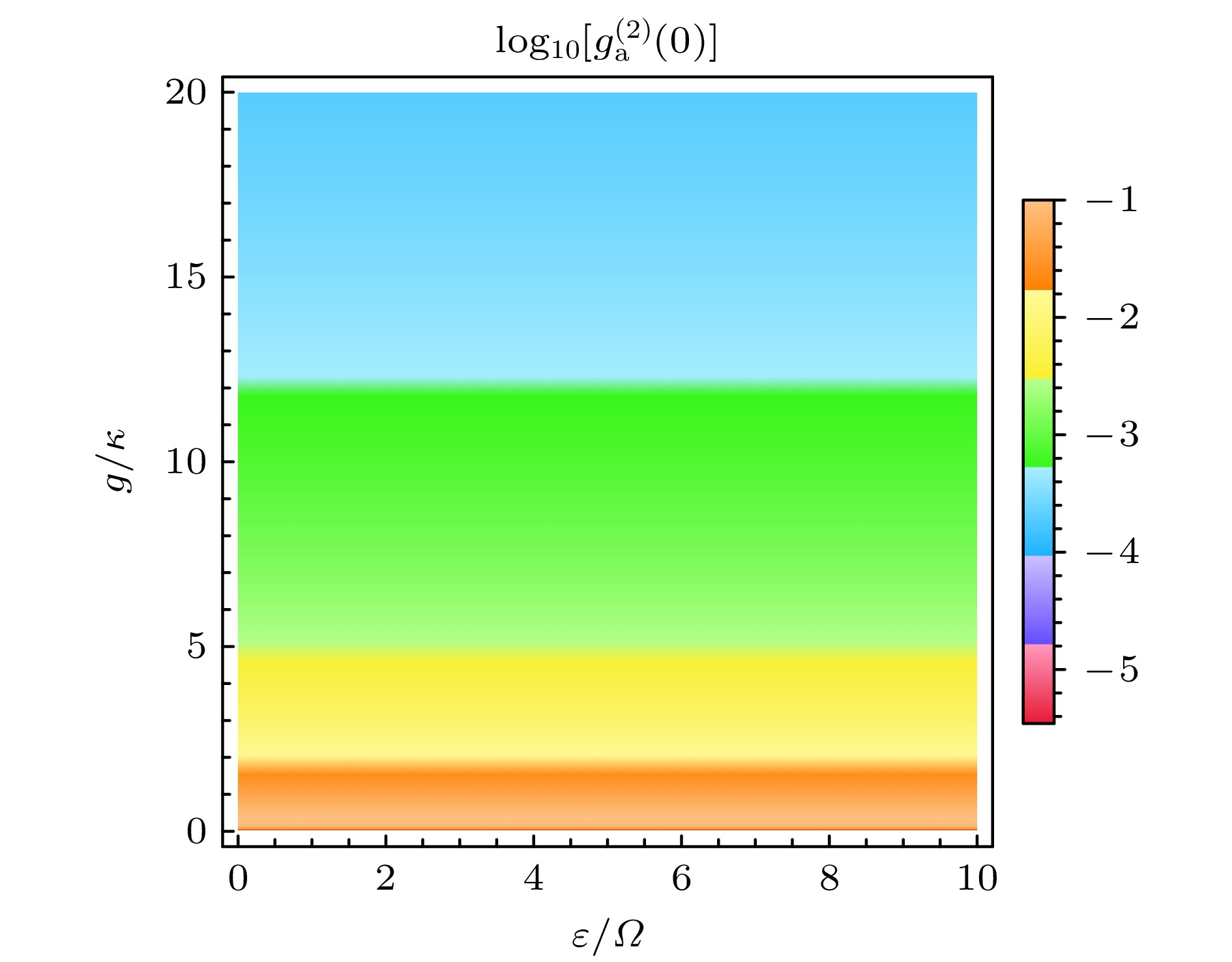 图 8 a腔等时二阶关联函数$ g_{{\rm{a}}}^{(2)}(0) $随耦合强度$ g /\kappa $和驱动强度比$ \varepsilon /\varOmega $的变化图, 其中$ \varDelta_{0}=\sqrt{3}g $且其余参数与图5相同