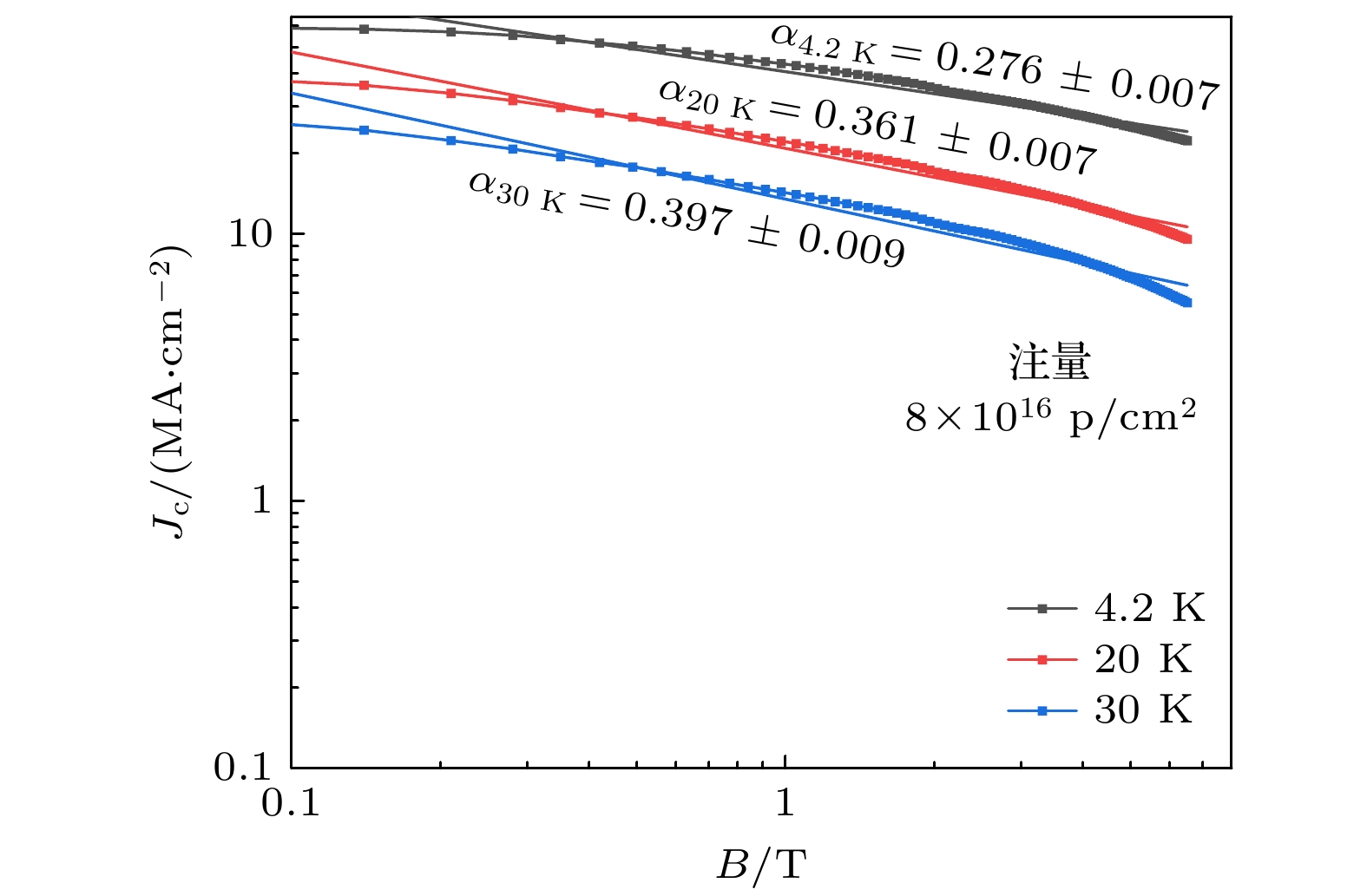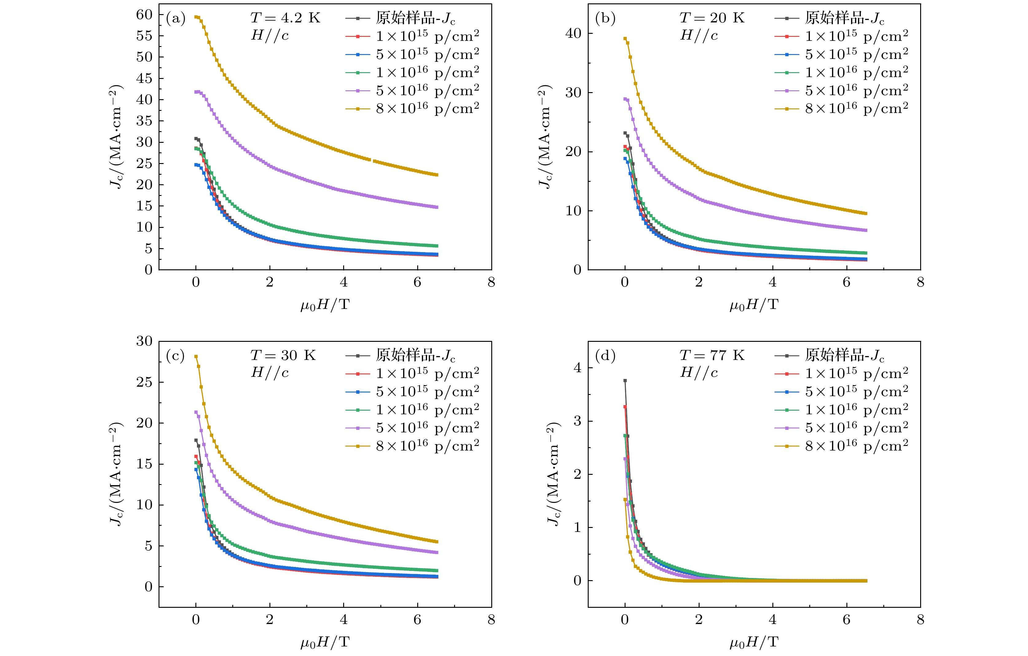 (ions·cm–2)Jc 备注 Au 18 120 6×1011 ↑2.5 27 K@3 T He 2.5 200 3×1015 ↑1.8 10 K@7 T Ar 2.5 120 5×1011 ↑2.2 10 K@7 T Ta 1900 — 5×1011 ↑4.4 10 K@7 T 表 2 超导带材辐照注量