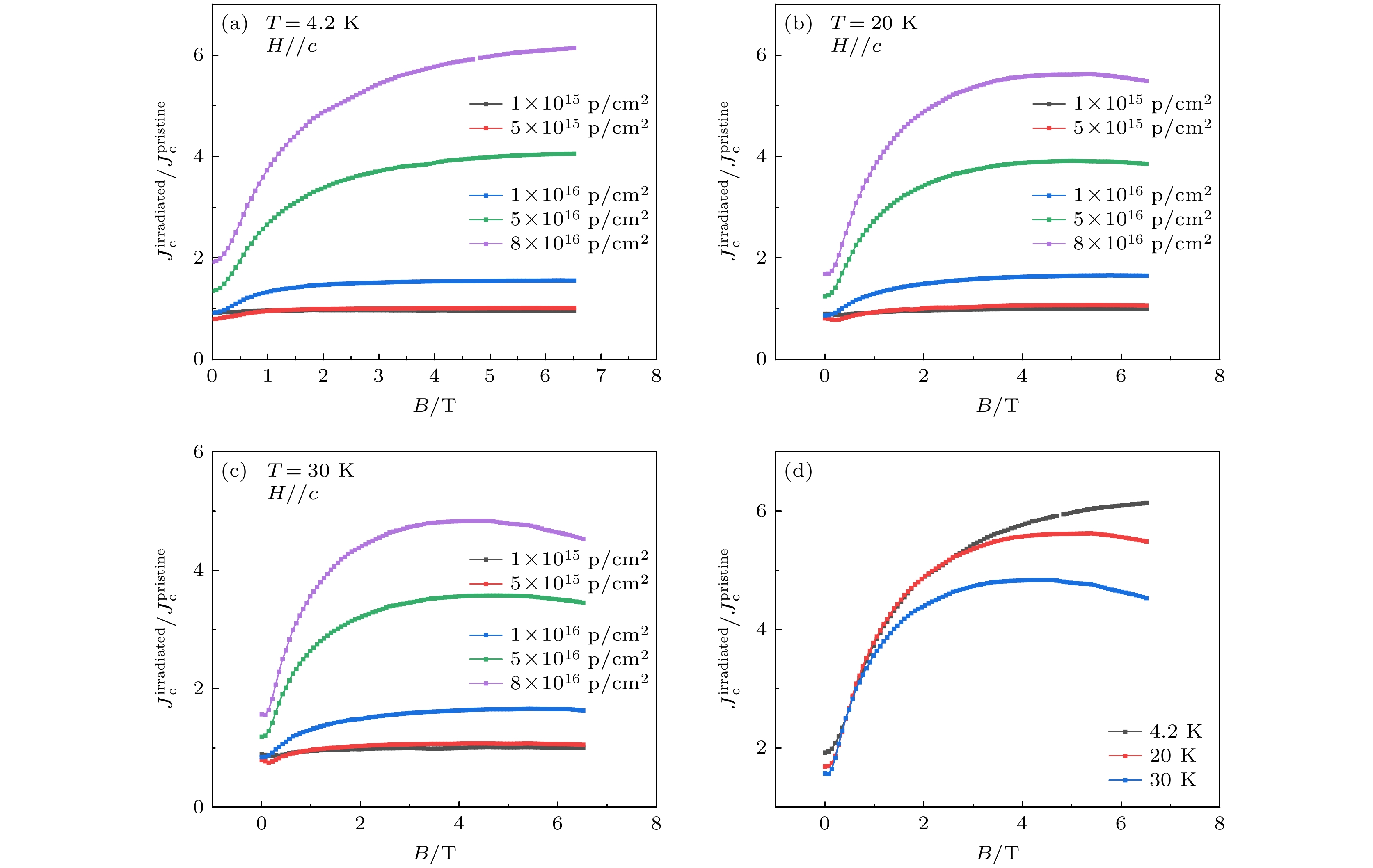 图 8 (a)—(c) 分别为4.2 K, 20 K, 30 K温度环境下不同注量的超导带材提升因子随磁场的变化; (d) 注量为8×1016 p/cm2时, 不同温度的超导带材提升因子随磁场的变化