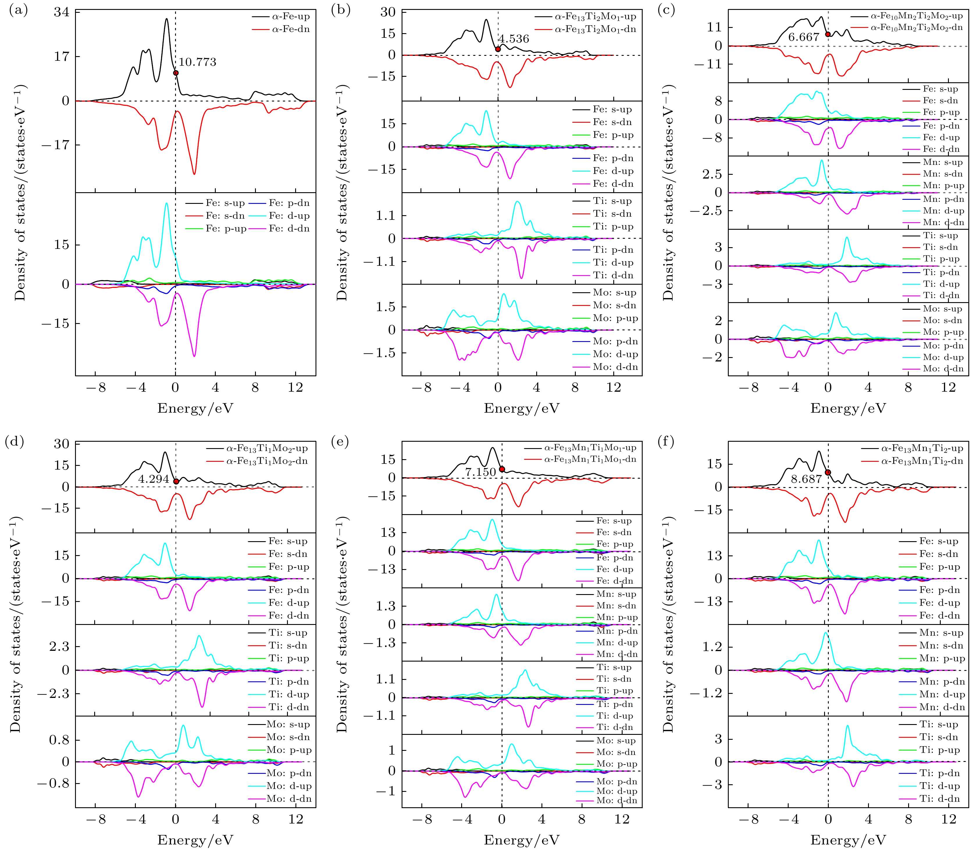 超胞 元素M原子百分比/% Mn Ti Mo Fe16 0 0 0 Fe13Ti2Mo1 0 12.5 6.25 Fe13Ti1Mo2 0 6.25 12.5 Fe13Mn1Ti2 6.25 12.5 0 Fe13Mn1Ti1Mo1 6.25 6.25 6.25 Fe13Mn1Mo2 6.25 0 12.5 Fe13Mn2Ti1 12.5 6.25 0 Fe13Mn2Mo1 12.5 0 6.25 Fe10Mn2Ti2Mo2 12.5 12.5 12.5 表 2 Fe16-x-y-zMnxTiyMoz的ε, Hform和Ecoh的计算值