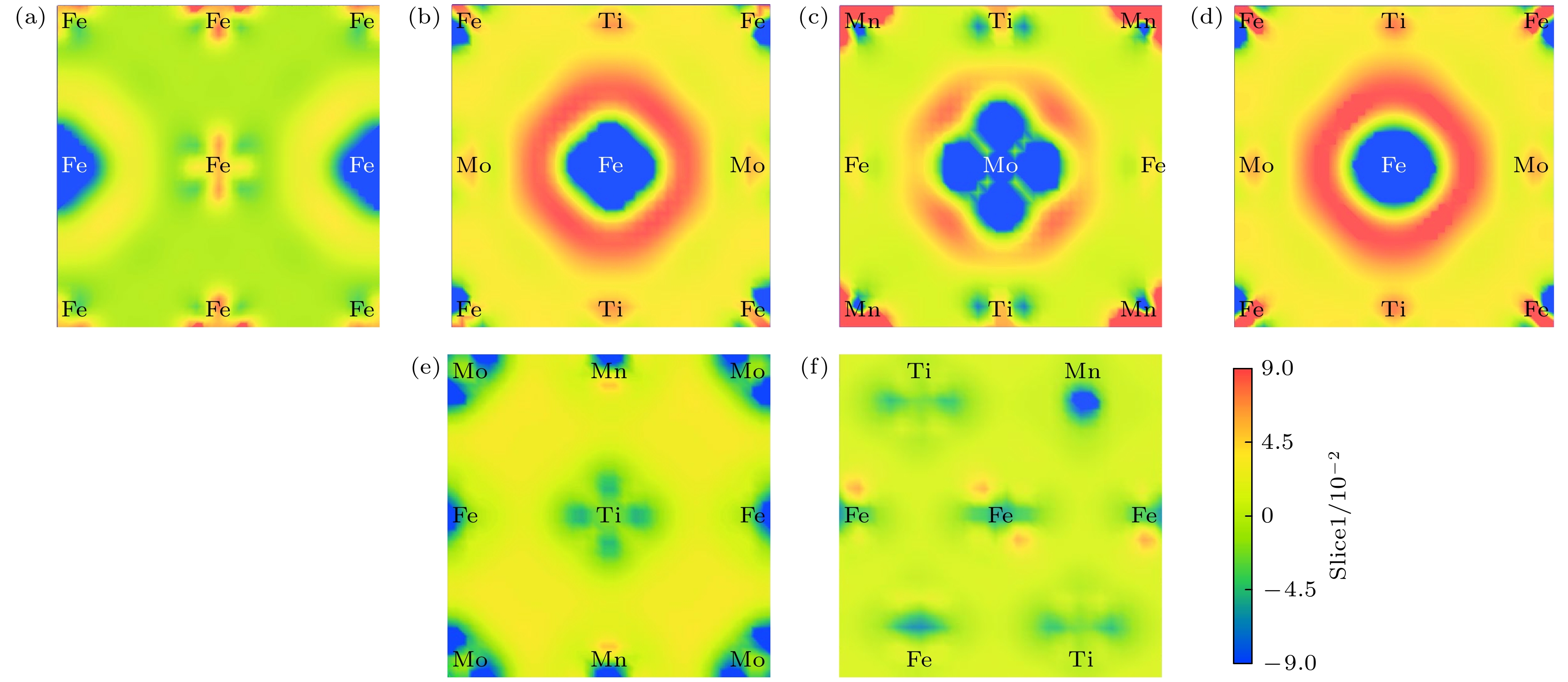 图 1 Fe16-x-y-zMnxTiyMoz超胞模型 (a) Fe16; (b) Fe13Ti2Mo1; (c) Fe13Ti1Mo2; (d) Fe13Mn1Ti2; (e) Fe13Mn1Ti1Mo1; (f) Fe13Mn1Mo2; (g) Fe13Mn2Ti1; (h) Fe13Mn2Mo1; (i) Fe10Mn2Ti2Mo2