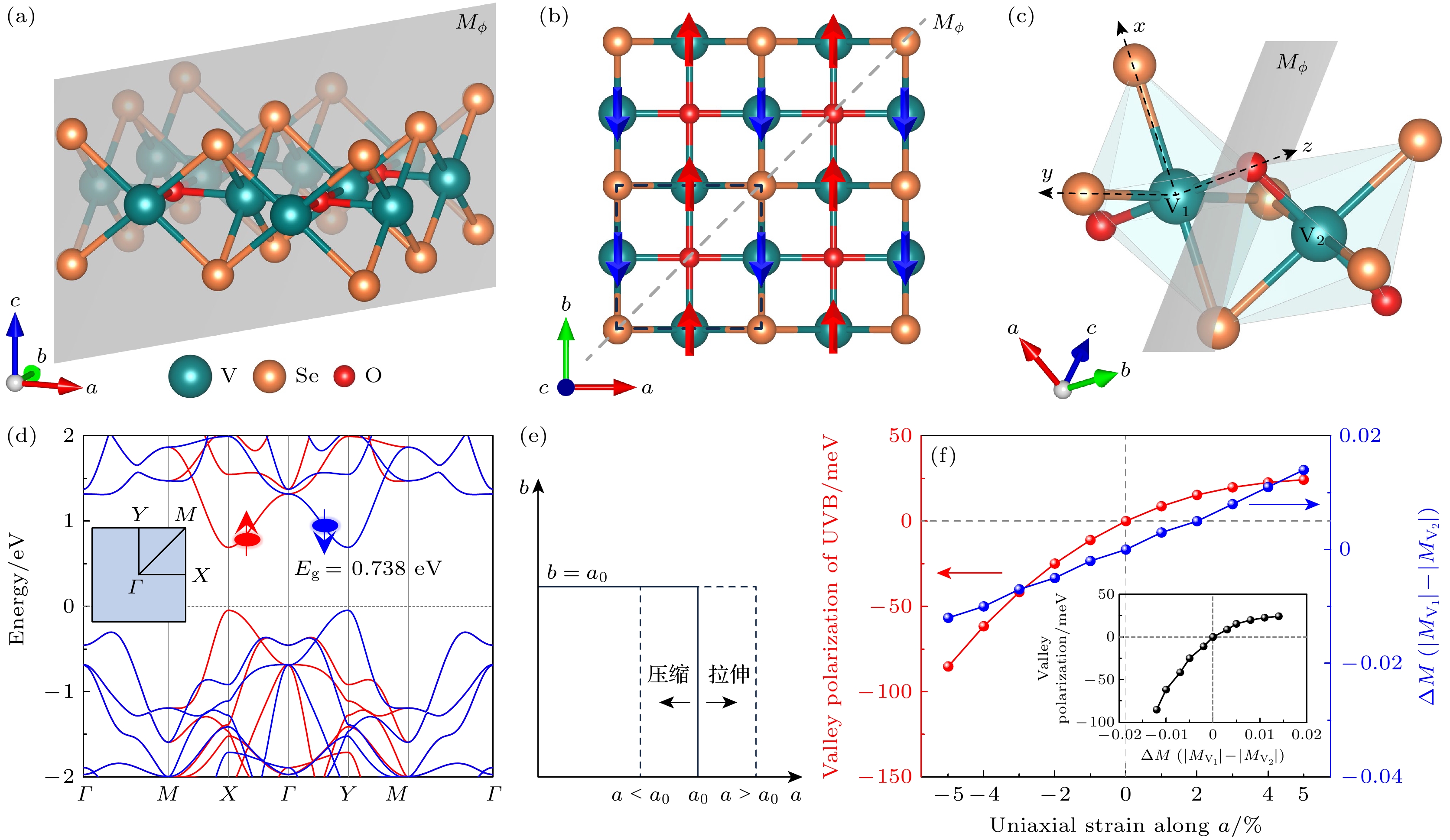 Fig. 1. Geometric and band structures of the V2Se2O monolayer, and the relationship among valley polarization, net magnetic moment, and uniaxial strain along the a-axis direction: (a) Crystal structure of monolayer V2Se2O, where the gray planes in the vertical direction represent the mirror symmetry planes $ {M_\phi } $ of different sublattices along the diagonal direction; (b) top view of the monolayer V2Se2O, where the black dashed box indicates the unit cell, and the gray dashed lines represent the mirror planes $ {M_\phi } $ along the diagonal direction; (c) local octahedral structure of two V atoms, where xyz represent the local octahedral coordinates of one V atom; (d) spin-polarized band structure calculated by PBE + U (U = 4 eV), where the inset shows the high-symmetry points and paths in the first Brillouin zone; (e) schematic illustration of uniaxial strain along the a-axis; (f) valley polarization of UVB and the net magnetic moment $ \Delta M\left( {{{\text{V}}_{1}} - {{\text{V}}_{2}}} \right) $ between V atoms as a function of a-axis strain, where the inset shows the variation of valley polarization with $ \Delta M\left( {{{\text{V}}_{1}} - {{\text{V}}_{2}}} \right) $.