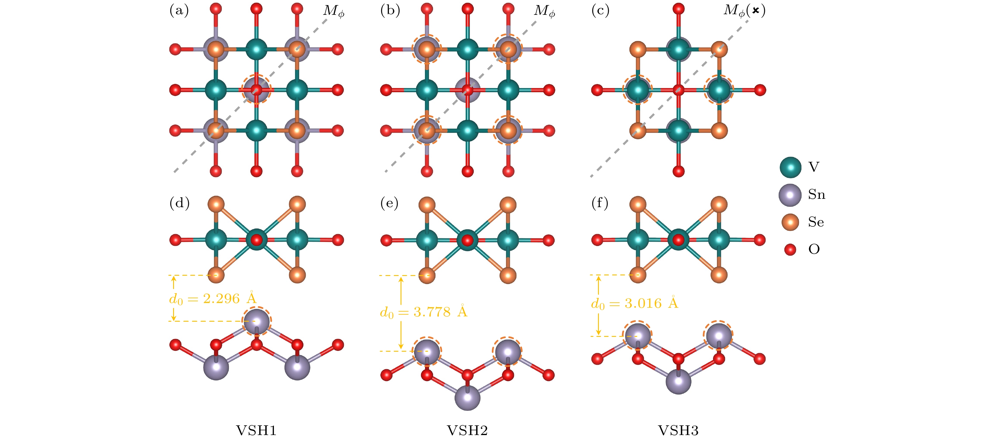 图 5 V2Se2O/SnO异质结的三种堆垛结构 (a)和(d), (b)和(e), (c)和(f)分别对应V2Se2O/SnO异质结三种堆垛结构的俯视图和侧视图, 其中虚线圆圈表示α-SnO层中上层的Sn原子, 黄色字体标记了不同堆垛方式下异质结的层间距离