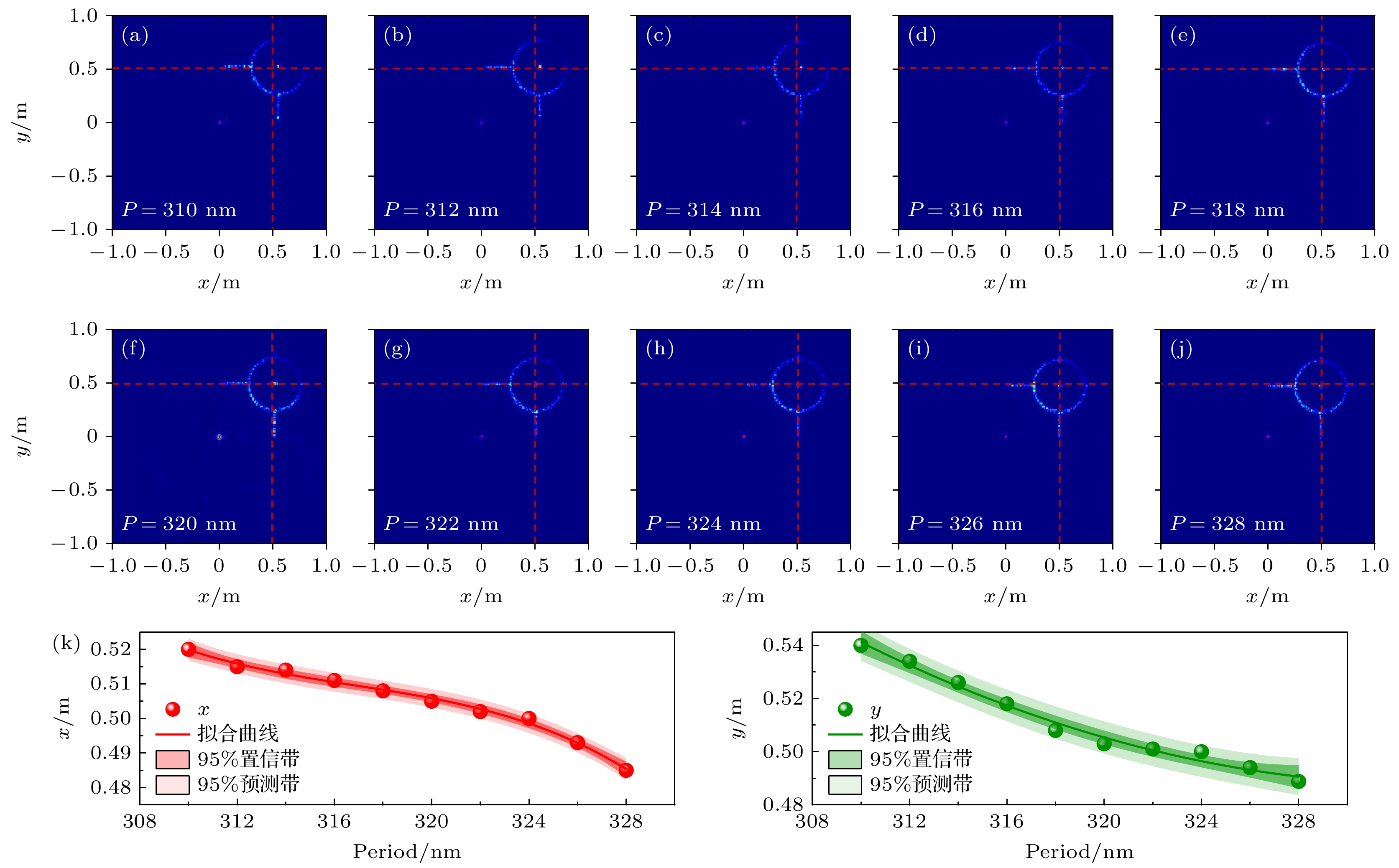 Fig. 5. (a)—(j) Numerical simulation results of holography images with the unit cell periods of 310, 312, 314, 316, 318, 320, 322, 324, 326 and 328 nm; (k) fitted curves of the dependence of the holographic image center coordinates x and y on the unit cell period.