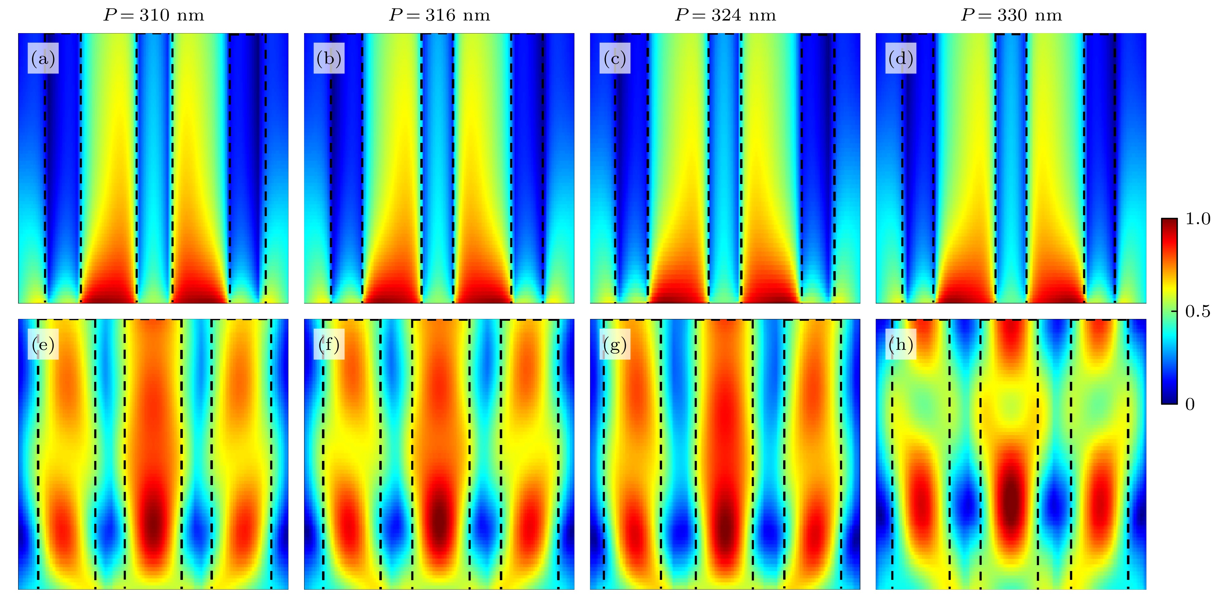 Fig. 7. Electric field intensity distributions from numerical simulations for unit cell periods P = 310, 316, 324, and 330 nm: (a)–(d) The nanopillar diameter D = 100 nm; (e)–(h) the maximum nanopillar diameter at 2π phase.