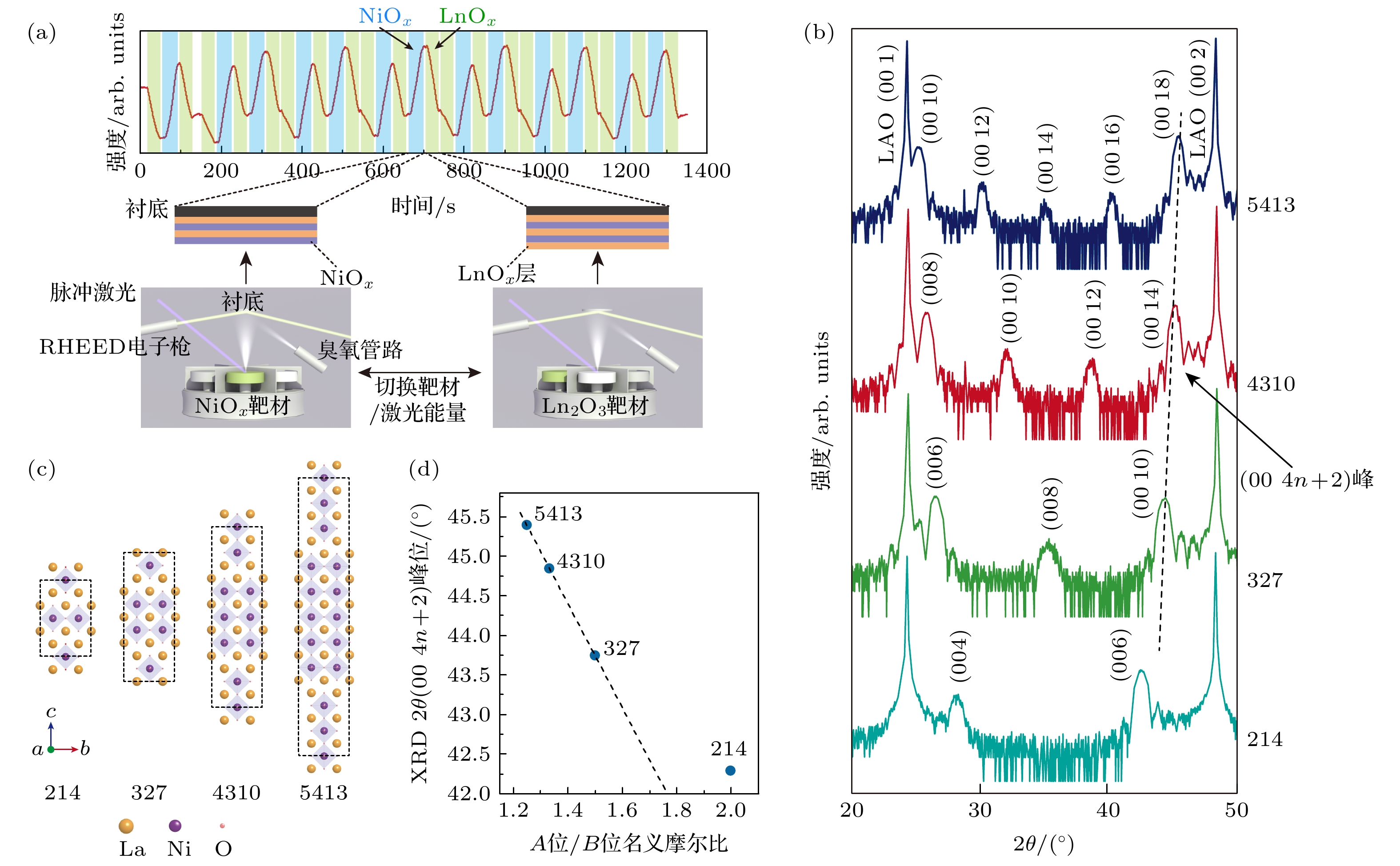 图 1 (a) GAE生长示意图; n = 1, 2, 3, 4镍氧化物RP相 (b) XRD θ-2θ扫描结果和(c)结构示意图; (d) (00 4n+2)峰位对于RP相A/B位名义摩尔比的依赖关系[22]