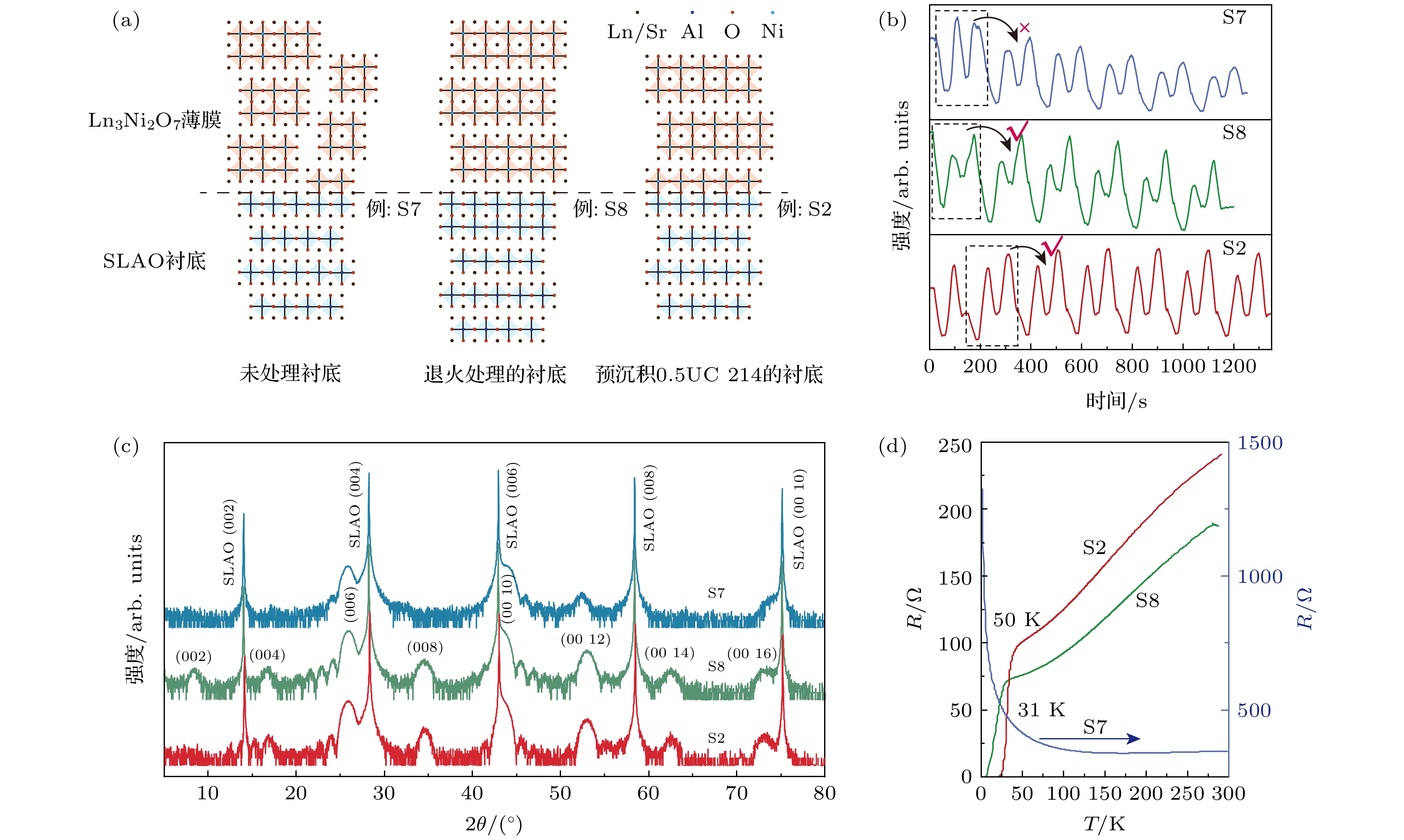 Fig. 5. (La, Pr, Sm)3Ni2O7 thin films grown on as-received (S7), annealed (S8), and pre-deposited buffer layer (S2) substrates: (a) Structural schematic diagrams; (b) RHEED intensity oscillations; (c) XRD θ-2θ scan results; (d) R-T curves. The ozone partial pressure during growth was 1.2×10–2 mbar for sample S2, and 2.0×10–2 mbar for samples S7 and S8, while all other growth parameters were kept consistent. The lower Tc of S8 originates from over-oxidation.