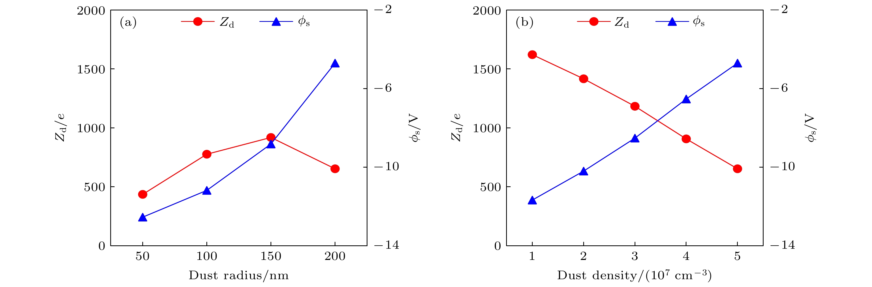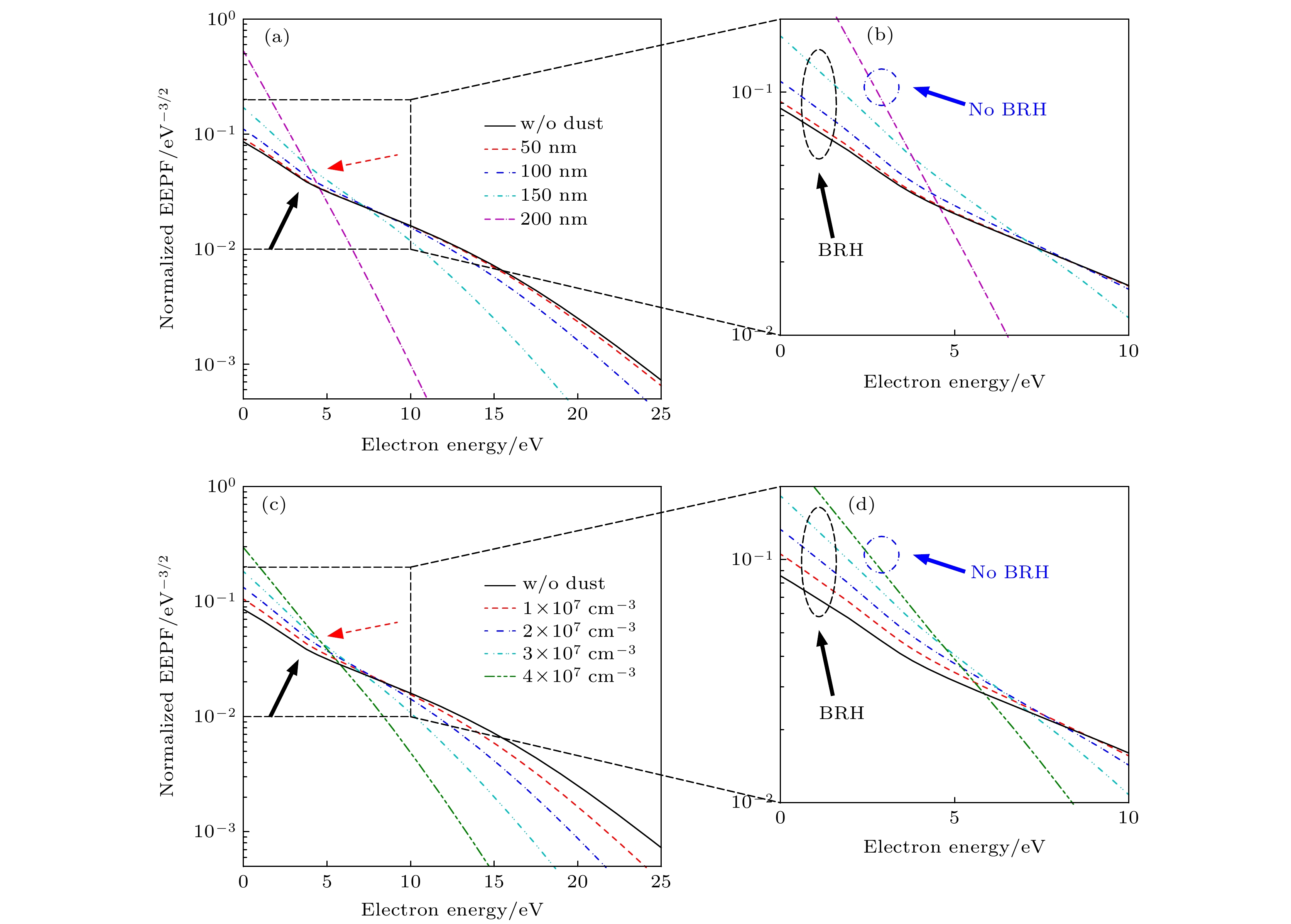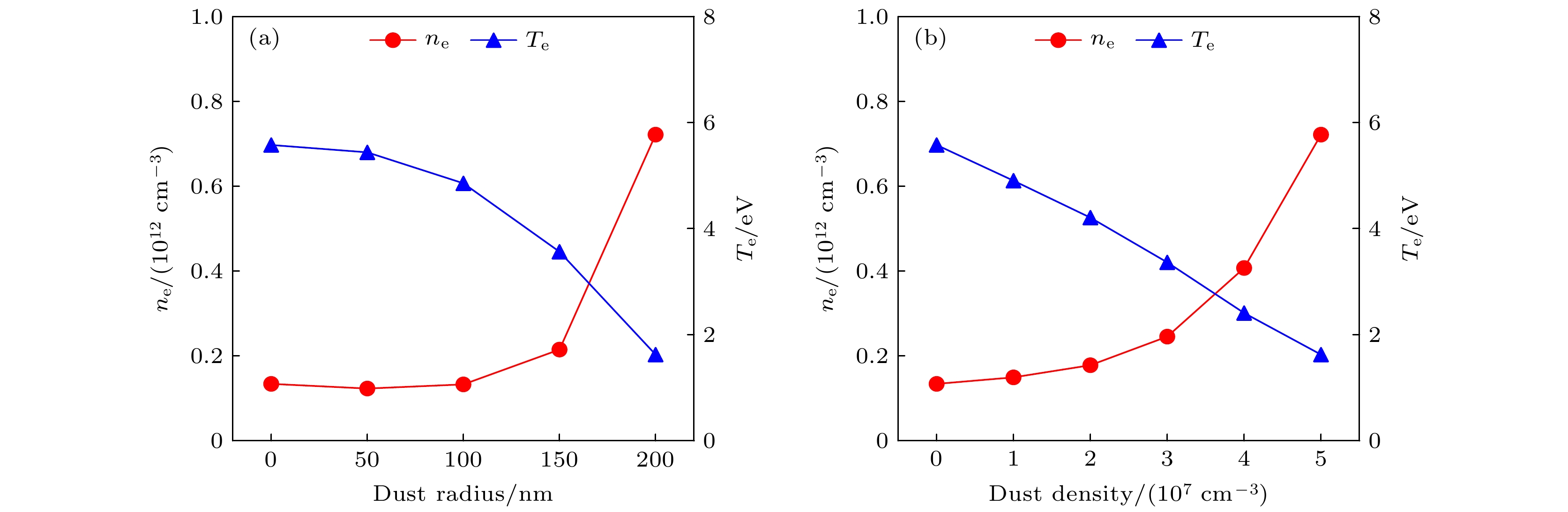 低气压射频感性放电可以产生更均匀的单分散颗粒和等离子体密度, 因此常被用于纳米器件制造中. 纳米器件制造需要产生纳米到亚微米尺度的颗粒. 由于其通常带负电荷, 会显著影响等离子体的放电特性. 本文主要研究了尘埃颗粒的尺度和密度对低气压感性耦合等离子体中电子反弹共振加热效应以及基本等离子体性质的影响. 模拟结果表明, 随着颗粒半径或密度的增大, 在电子能量概率函数中以形成平台为特征的反弹共振加热效应逐渐受到抑制并最终消失, 导致电子温度下降、电子密度上升、颗粒表面电势增大, 而颗粒带电量随着颗粒密度的增大而减小, 随着颗粒半径的增大呈现非单调变化. 该研究指出由于颗粒存在引发的高能电子的损失可能会为低缺陷、单分散纳米颗粒的生长创造更有利的环境. 颗粒质量的提升对降低纳米器件中的陷阱密度以及增强其电学性能具有重要意义.Low-pressure radio-frequency inductively coupled discharges can produce uniformly distributed monodisperse particles and plasma densities, making them widely used in nanodevice fabrication. The manufacturing of nanodevices typically requires the generation of particles ranging from nanometer to submicron scales. These particles usually carry negative charges and can significantly influence the discharge characteristics of the plasma. This study investigates the effects of particle size and density on electron bounce resonance heating (BRH) and fundamental plasma properties in low-pressure ICPs by using a hybrid model. The hybrid model consists of kinetic equation, electromagnetic field equation, and global model equation. The simulation results show that as the dust radius or density increases, the BRH effect characterized by the formation of a plateau in the probability function of electron energy, is gradually suppressed and eventually disappears, accompanied by a decrease in electron temperature, an increase in electron density, and an increase in particle surface potential. The dust charge decreases with the increase of particle density, while exhibiting a nonmonotonic variation with particle radius. The results show that the loss of high-energy electrons caused by the dust particles may create a more favorable plasma environment for the growth of monodisperse nanoparticles with low defects. Such an improvement in particle quality is crucial for reducing trap densities and enhancing the electrical performance of nanoparticle-based electronic devices.