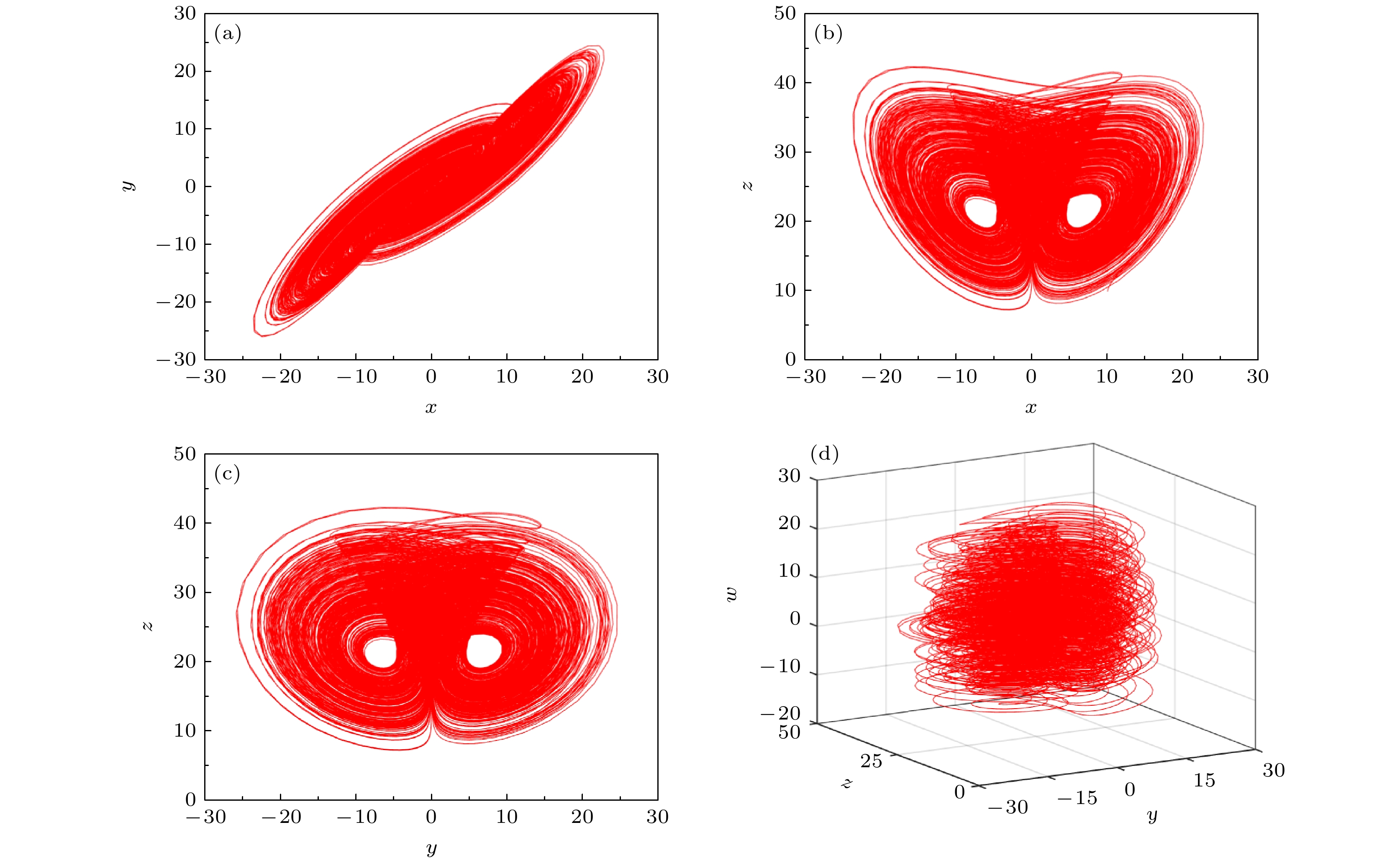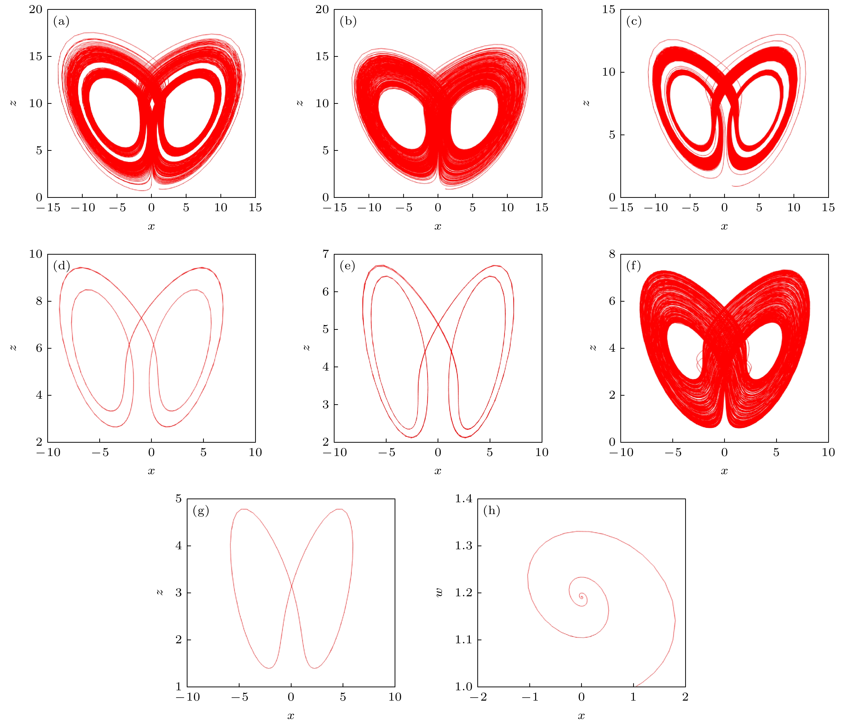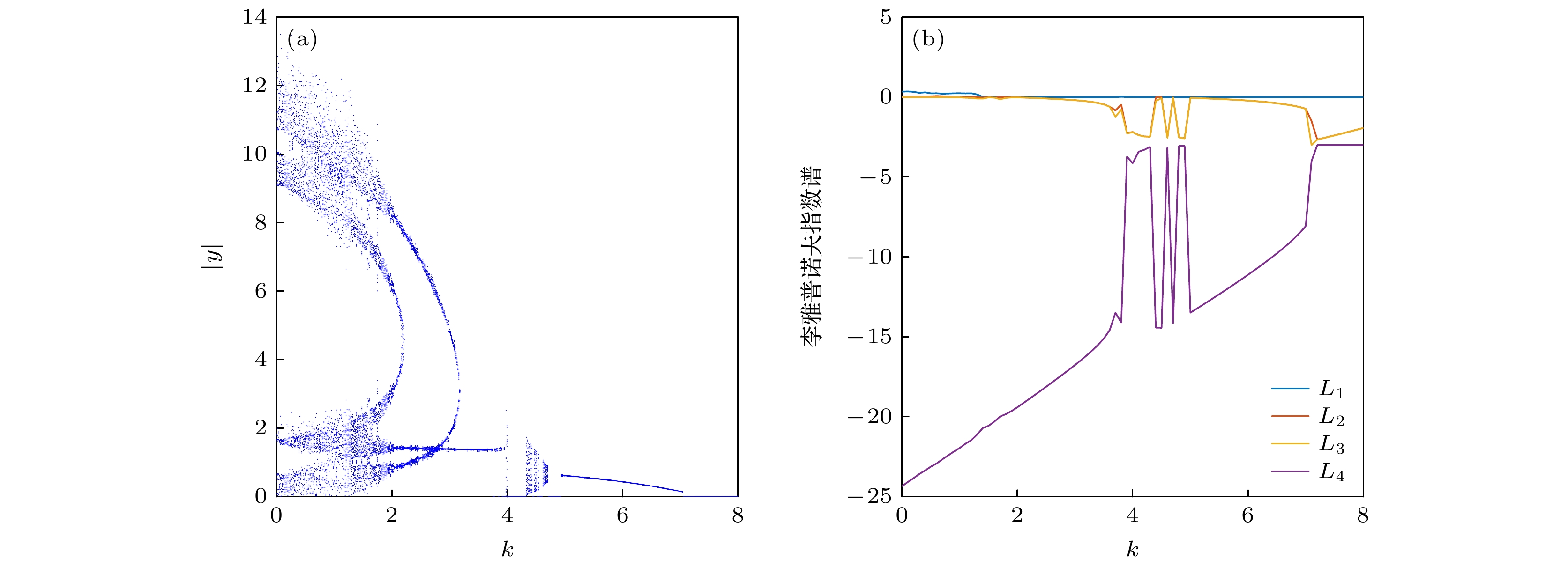 参数k值 $ L_{1} $ $ L_{2} $ $ L_{3} $ $ L_{4} $ 吸引子类型 相图 $ 0.1 $ $ 0.3675 $ $ 0.0109 $ $ -0.0012 $ $ -24.0787 $ 超混沌 图6(a) $ 0.5 $ $ 0.2356 $ $ 0.0596 $ $ -0.0059 $ $ -23.1174 $ 超混沌 图6(b) $ 1.7 $ $ 0.0058 $ $ -0.0011 $ $ -0.1339 $ $ -19.9824 $ 准周期 图6(c) $ 2.5 $ $ 0.0004 $ $ -0.0807 $ $ -0.0812 $ $ -18.1232 $ 极限环 图6(d) $ 3.7 $ $ 0.0002 $ $ -0.8435 $ $ -1.2411 $ $ -13.4649 $ 极限环 图6(e) $ 4.4 $ $ 0.0011 $ $ 0 $ $ -0.2547 $ $ -14.4246 $ 混沌 图6(f) $ 5.1 $ $ 0.0006 $ $ -0.0526 $ $ -0.0530 $ $ -13.2676 $ 极限环 图6(g) $ 8 $ $ -0.0006 $ $ -1.9258 $ $ -1.9672 $ $ -2.9574 $ 不动点 图6(h) 表 2 不同优化因子f值对应的李雅普诺夫指数, 吸引子类别及相图