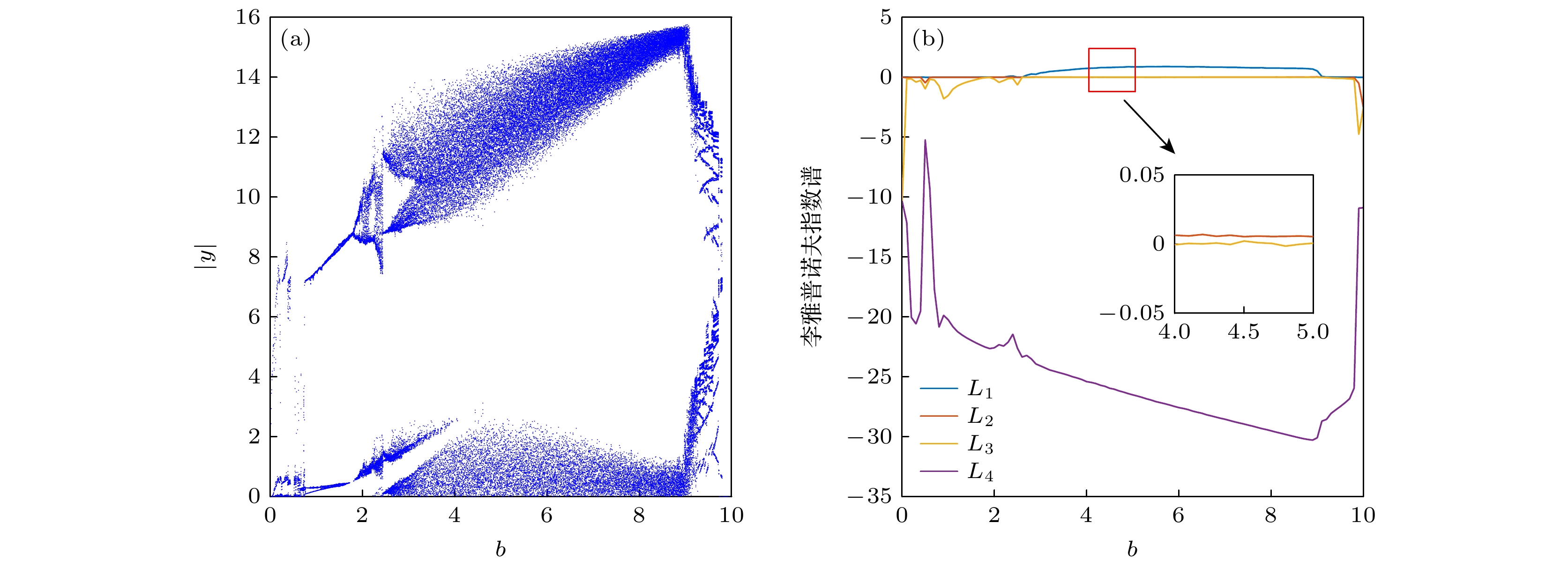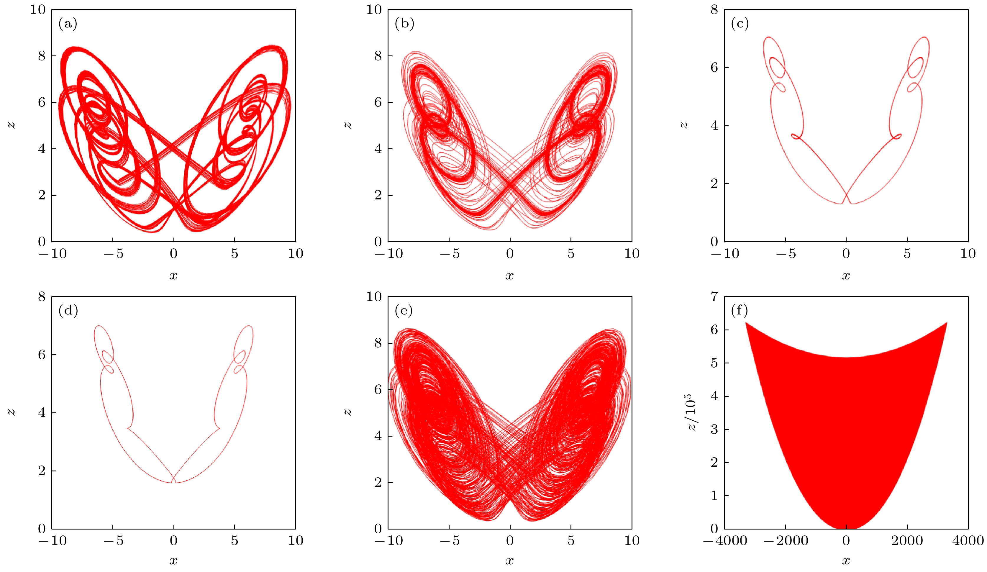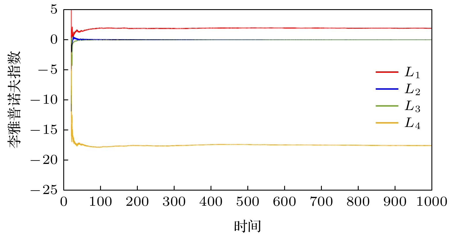 参数k值 $ L_{1} $ $ L_{2} $ $ L_{3} $ $ L_{4} $ 吸引子类型 相图 $ 0.1 $ $ 0.3675 $ $ 0.0109 $ $ -0.0012 $ $ -24.0787 $ 超混沌 图6(a) $ 0.5 $ $ 0.2356 $ $ 0.0596 $ $ -0.0059 $ $ -23.1174 $ 超混沌 图6(b) $ 1.7 $ $ 0.0058 $ $ -0.0011 $ $ -0.1339 $ $ -19.9824 $ 准周期 图6(c) $ 2.5 $ $ 0.0004 $ $ -0.0807 $ $ -0.0812 $ $ -18.1232 $ 极限环 图6(d) $ 3.7 $ $ 0.0002 $ $ -0.8435 $ $ -1.2411 $ $ -13.4649 $ 极限环 图6(e) $ 4.4 $ $ 0.0011 $ $ 0 $ $ -0.2547 $ $ -14.4246 $ 混沌 图6(f) $ 5.1 $ $ 0.0006 $ $ -0.0526 $ $ -0.0530 $ $ -13.2676 $ 极限环 图6(g) $ 8 $ $ -0.0006 $ $ -1.9258 $ $ -1.9672 $ $ -2.9574 $ 不动点 图6(h) 表 2 不同优化因子f值对应的李雅普诺夫指数, 吸引子类别及相图