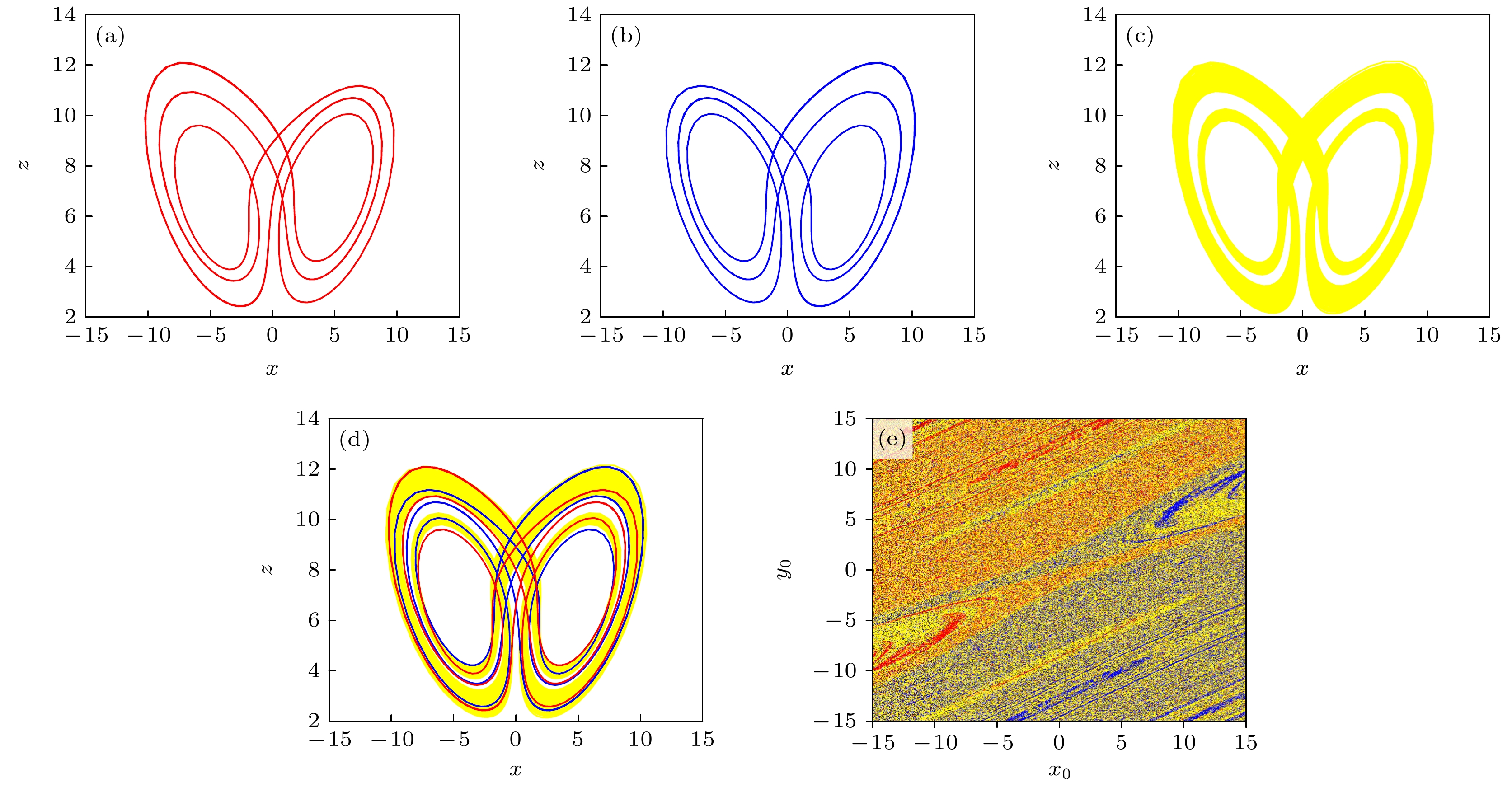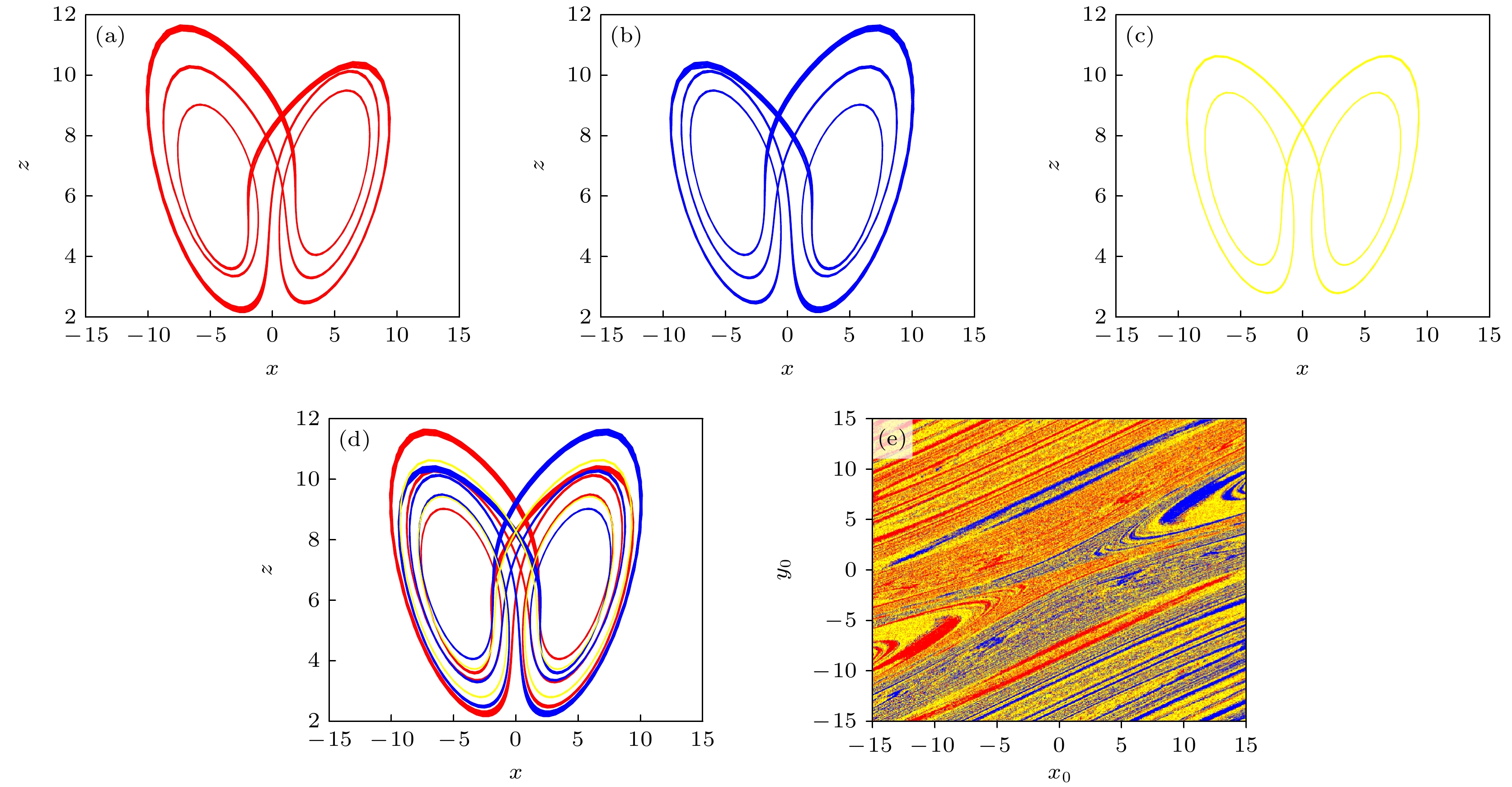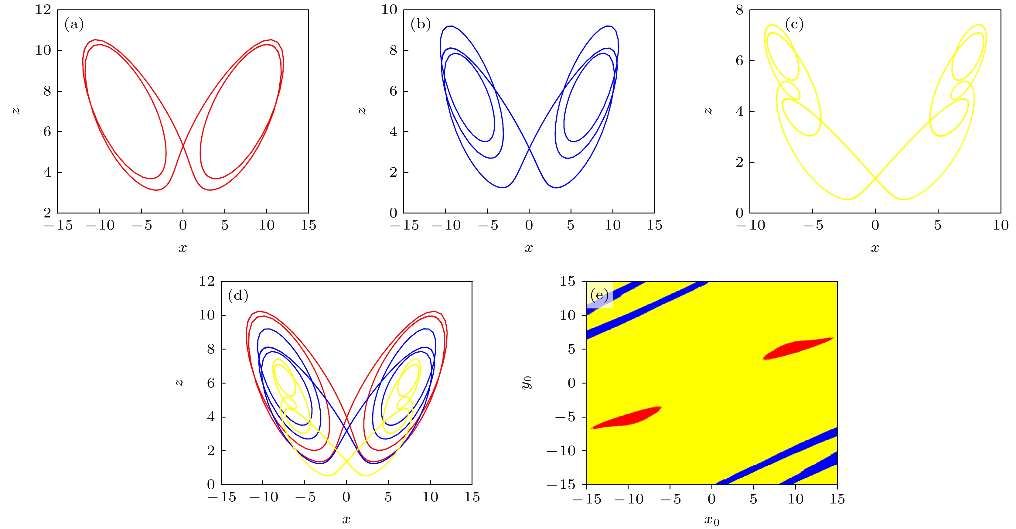 图 11 系统(3) 的三个周期吸引子的共存 (a) 双层翼状周期吸引子; (b) 三层翼状周期吸引子; (c) 多层翼状周期吸引子; (d) 三个共存吸引子; (e) 共存吸引子吸引盆