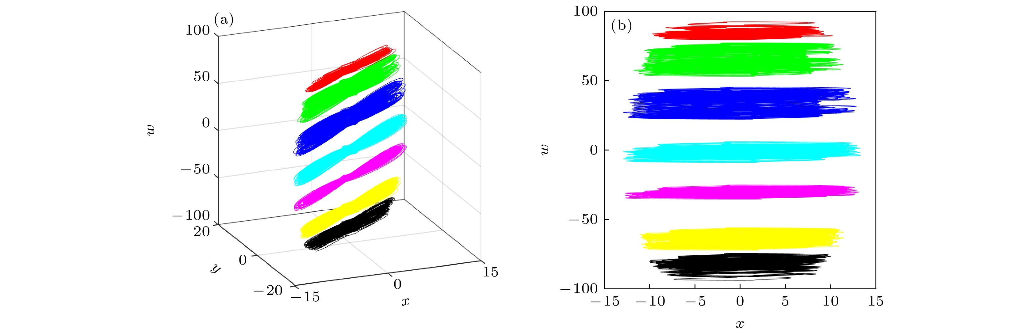 图 14 在参数$ (a, b, c, d, e, k)=(51, 2.4, 30, 2, 0.1, 0.01) $下, 当$ w_0=-90 $(黑色), $ w_0=-60 $(黄色), $ w_0=-30 $(洋红), $ w_0=0 $(青色), $ w_0=30 $(蓝色), $ w_0=60 $(绿色), $ w_0=90 $(红色) 时的相图 (a) x-y-w平面; (b) x-w平面