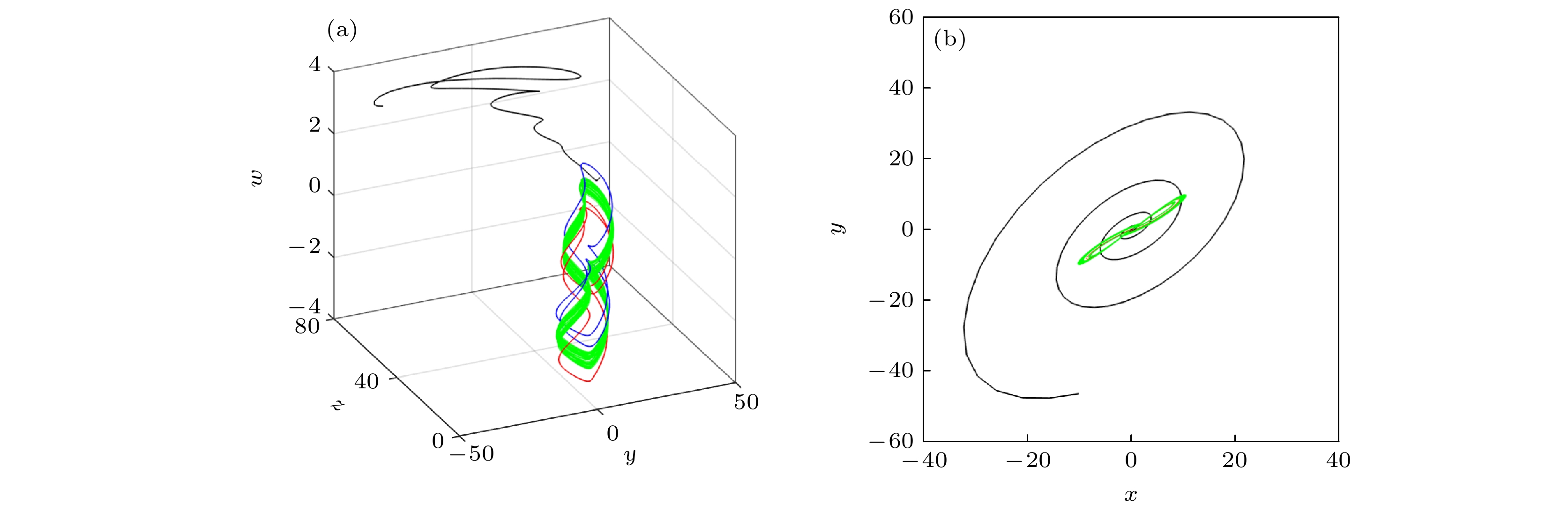 图 15 在参数$ (a, b, c, d, e, k)=(51, 3, 30, 2, 0.1, 1.7) $下, 当$ z_0=-45 $(黑色), $ z_0=-12 $(红色), $ z_0=5 $(蓝色), $ z_0=12 $(绿色)时的相图 (a) y-z-w平面; (b) x-y平面