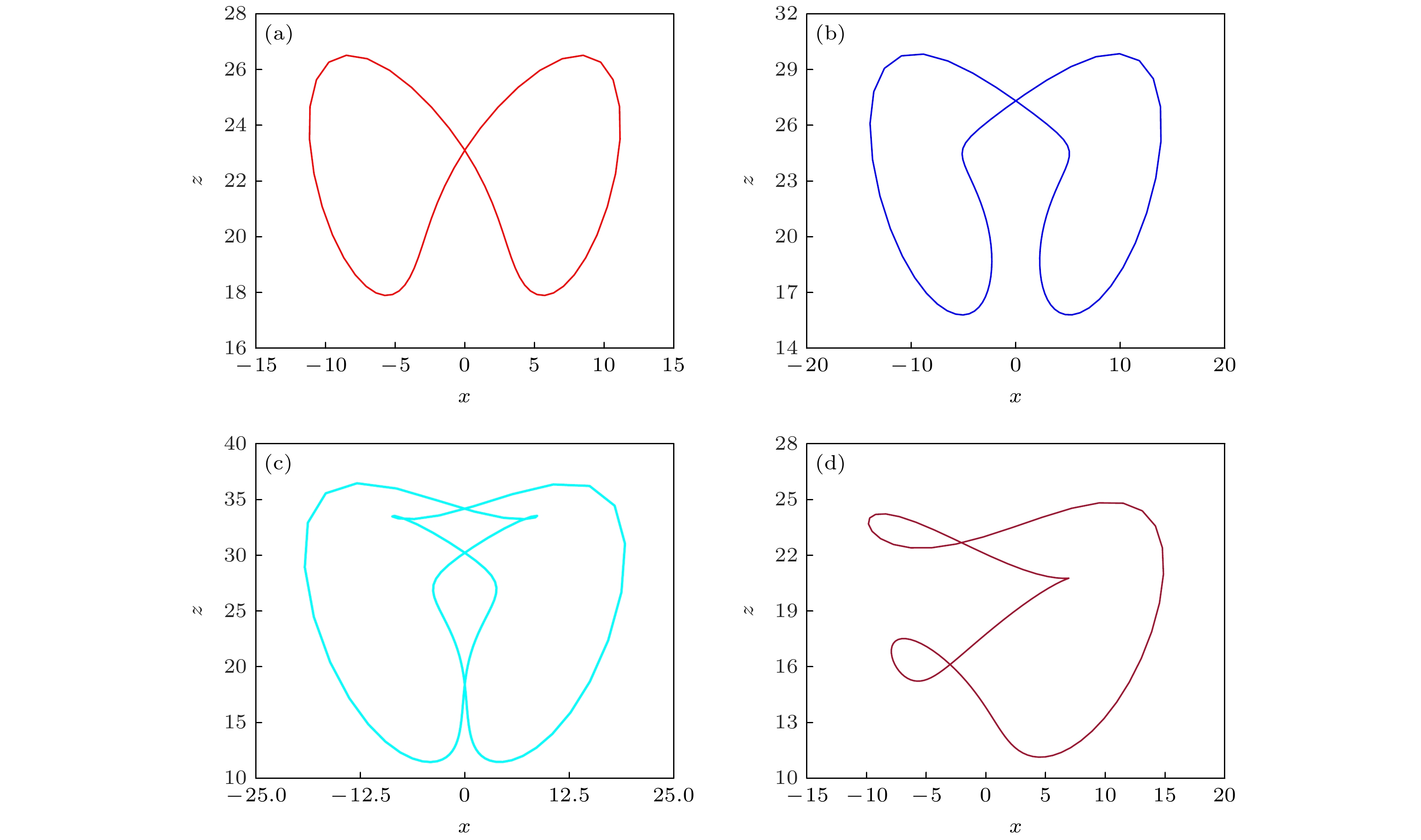 参数f值 $ L_{1} $ $ L_{2} $ $ L_{3} $ $ L_{4} $ 分形维数 吸引子类型 相图 $ 0 $ $ 0.0052 $ $ -0.0017 $ $ -0.3898 $ $ -18.8902 $ $ 2.0116 $ 准周期 图16(a) $ 0.8 $ $ 0.0023 $ $ -0.0320 $ $ -0.0377 $ $ -19.4078 $ $ 1.0706 $ 极限环 图16(b) $ 8 $ $ 0.0013 $ $ -0.6203 $ $ -1.1092 $ $ -6.4579 $ $ 1.0020 $ 极限环 图16(c) $ 10 $ $ 0.0017 $ $ -0.4181 $ $ -2.6648 $ $ -14.3500 $ $ 1.004 $ 极限环 图16(d) $ -0.4 $ $ 0.0595 $ $ 0.0002 $ $ -0.1958 $ $ -19.2351 $ $ 2.3053 $ 混沌 图16(e) $ -30 $ $ 120.4688 $ $ 13.6667 $ $ 12.6813 $ $ -87.5597 $ $ 4.6768 $ 超混沌 图16(f) 表 3 系统(3)中隐藏超混沌吸引子内嵌的长度4以内的34条轨道, 其各自的拓扑长度, 编码以及周期