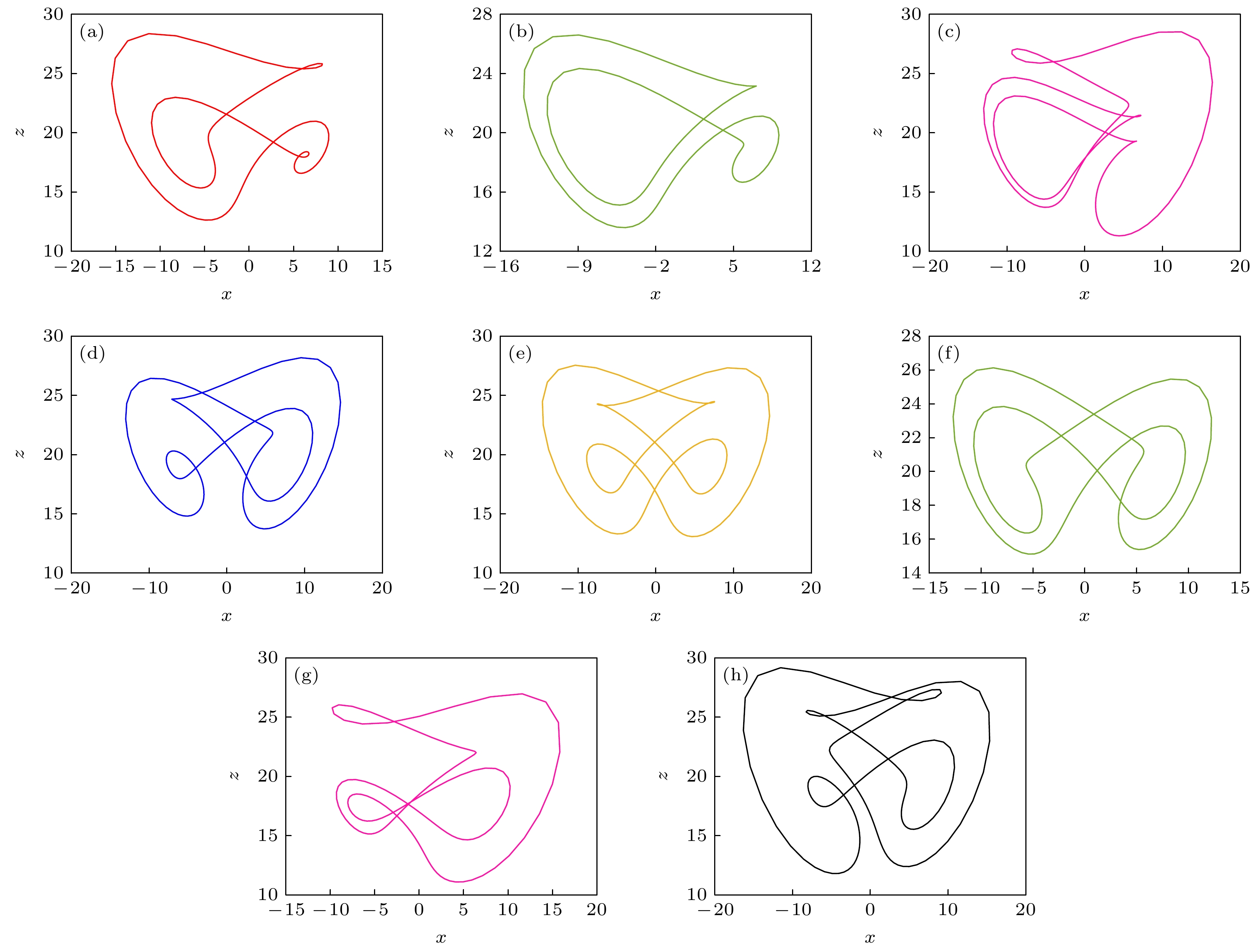 图 18 八个拓扑结构不同的不稳定周期轨道 (a) 轨道205; (b) 轨道1AA; (c) 轨道AA3; (d) 轨道4B1; (e) 轨道3A2B; (f) 轨道B01A; (g) 轨道AAB3; (f) 轨道2A13