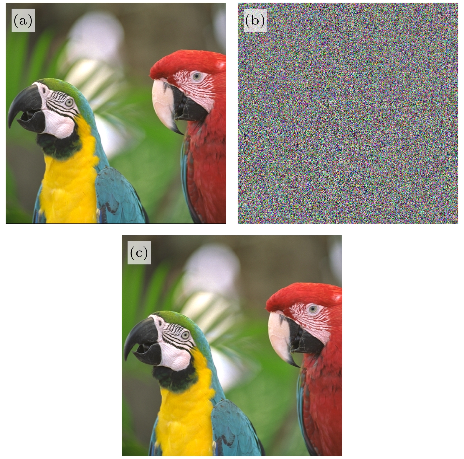 Fig. 24. Key sensitivity tests: (a) Plaintext image; (b) Ciphertext $ P_1 $ (key $ p_1 $); (c) Ciphertext $ P_2 $ (key $ p_2 $); (d) $ P_1 $ decryption result with key $ p_1 $; (e) $ P_1 $ decryption result with key $ p_2 $; (f) $ P_2 $ decryption result with key $ p_1 $.