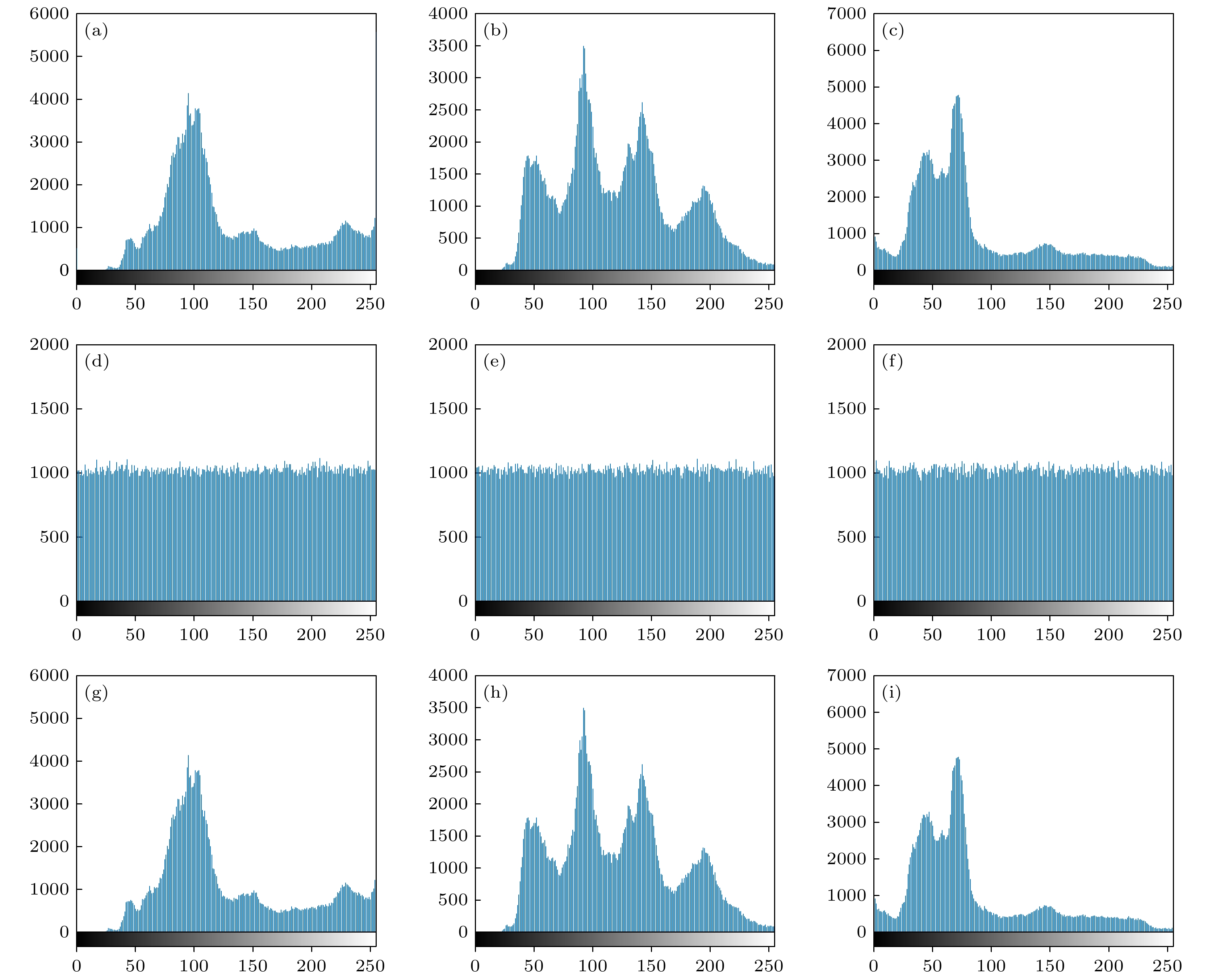 图 21 明文图像、密文图像和解密图像的 R, G, B 分量直方图 (a) 明文图像的R分量; (b) G分量; (c) B分量; (d) 密文图像的R分量; (e) G分量; (f) B分量; (g) 解密图像的R分量; (h) G分量; (i) B分量