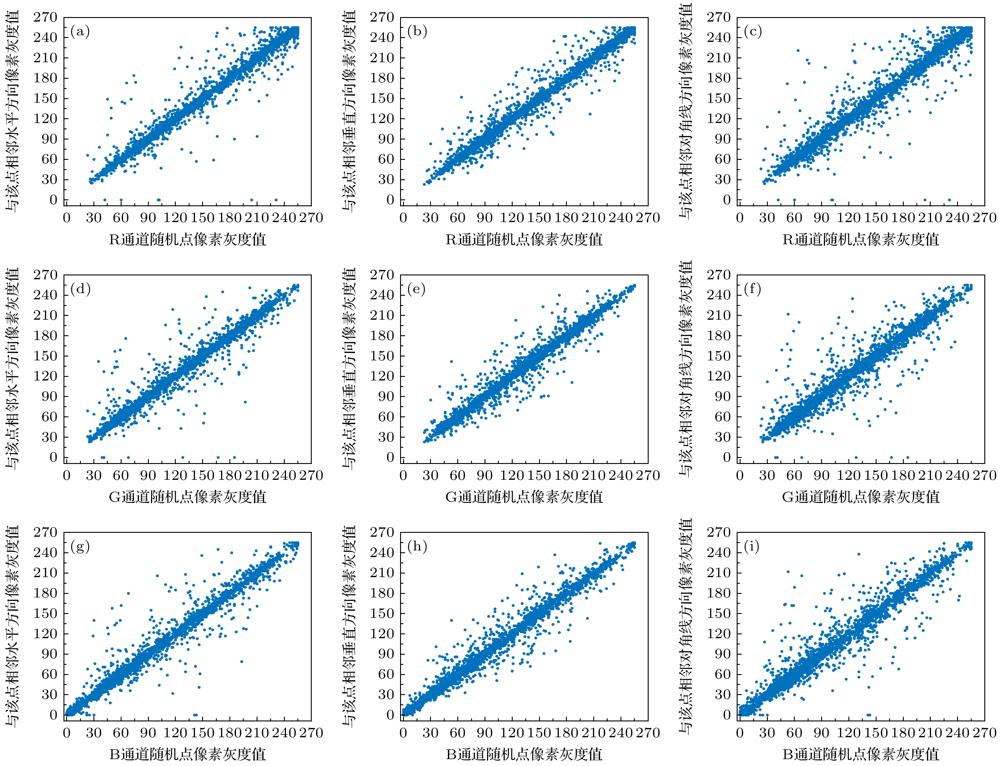 图 22 明文图像 R, G, B 通道分别在水平、垂直、对角线相邻元素相关性点图 (a) R通道水平相邻元素相关性点图; (b) 垂直; (c) 对角线; (d) G通道水平相邻元素相关性点图; (e) 垂直; (f) 对角线; (g) B通道水平相邻元素相关性点图; (h) 垂直; (i) 对角线