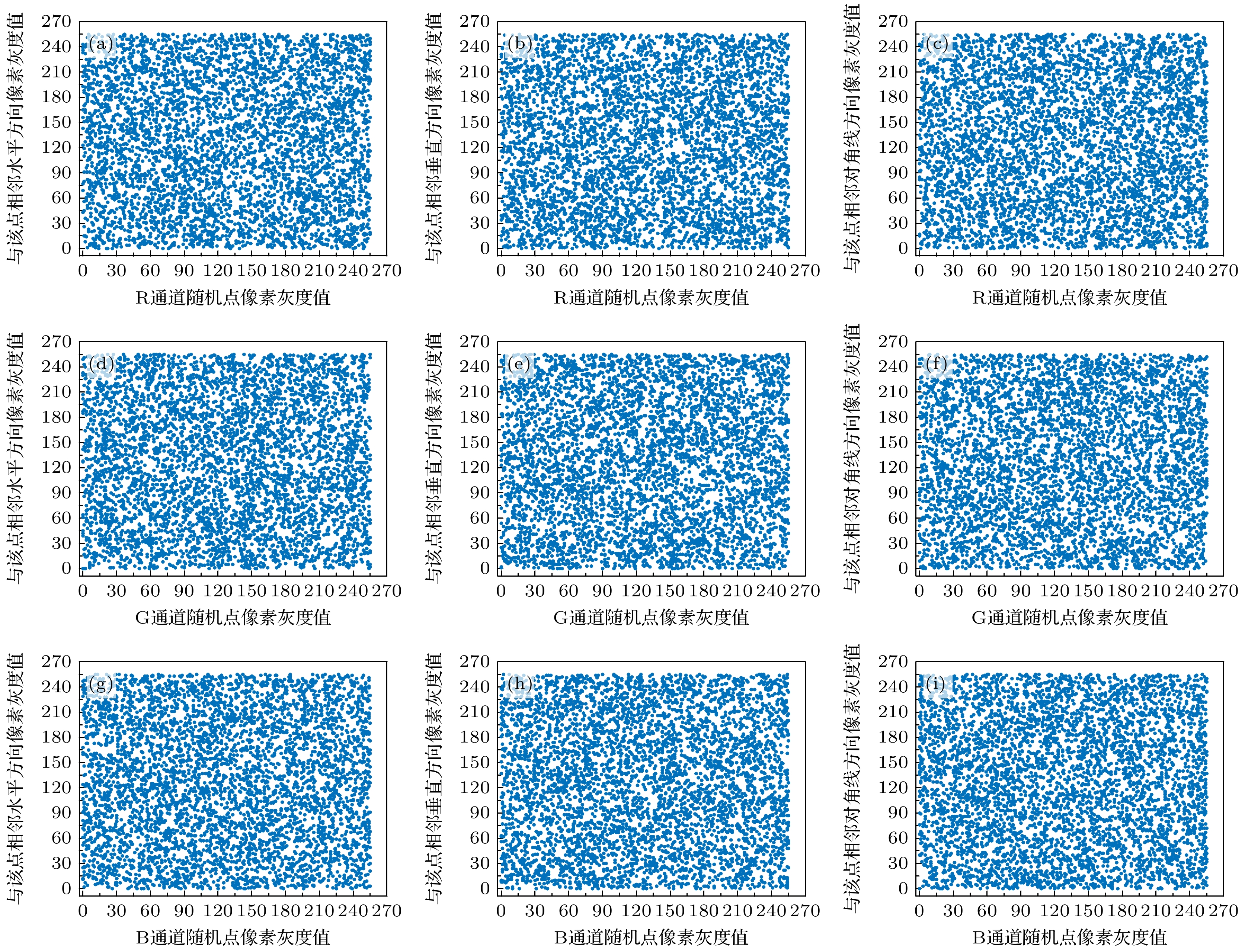 图 23 密文图像R, G, B通道分别在水平、垂直、对角线相邻元素相关性点图 (a) R通道水平相邻元素相关性点图; (b) 垂直; (c) 对角线; (d) G通道水平相邻元素相关性点图; (e) 垂直; (f) 对角线; (g) B通道水平相邻元素相关性点图; (h) 垂直; (i) 对角线