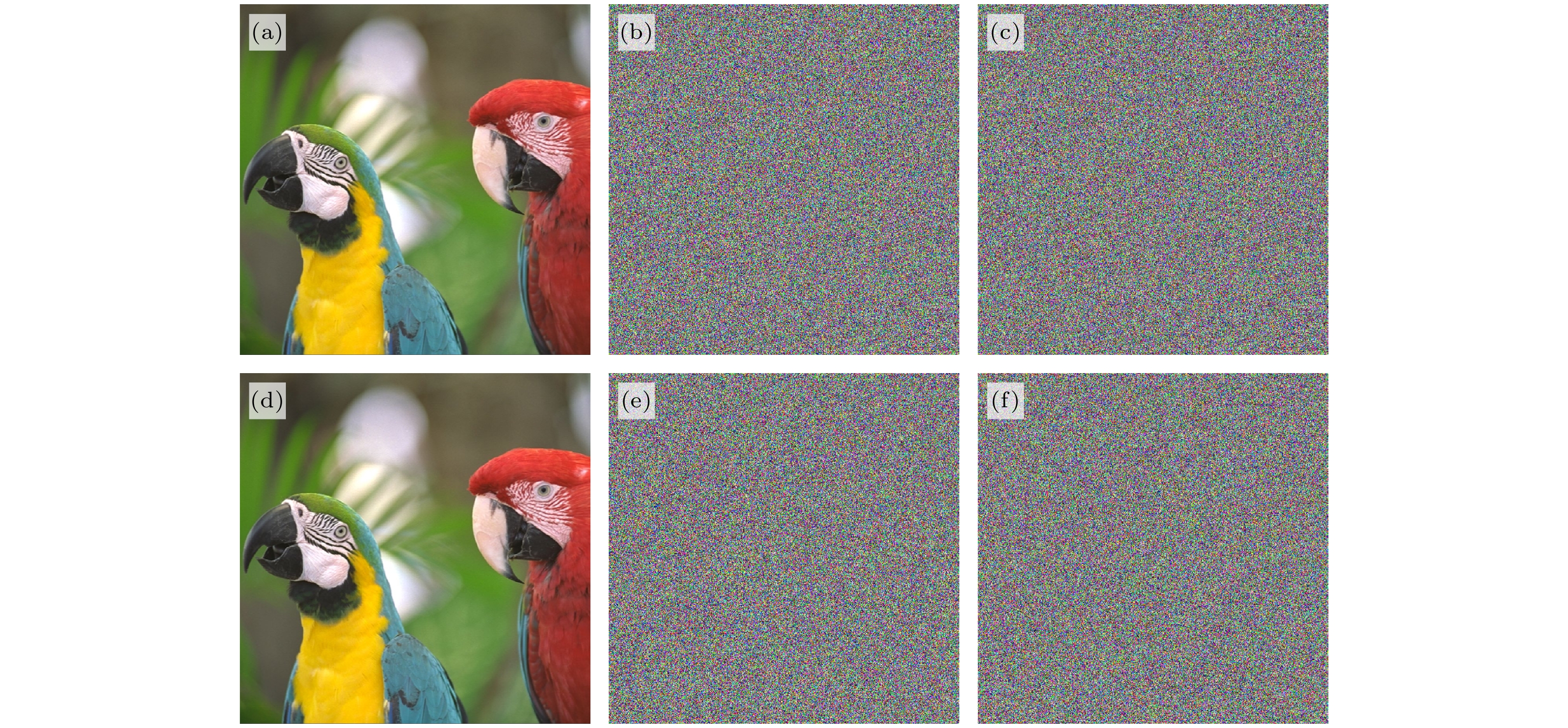 图 24 密钥敏感性测试图 (a) 明文图像; (b) 密文$ P_1 $(密钥为$ p_1 $); (c) 密文$ P_2 $(密钥为$ p_2 $); (d) $ P_1 $用$ p_1 $解密结果; (e) $ P_1 $用$ p_2 $解密结果; (f) $ P_2 $用$ p_1 $解密结果